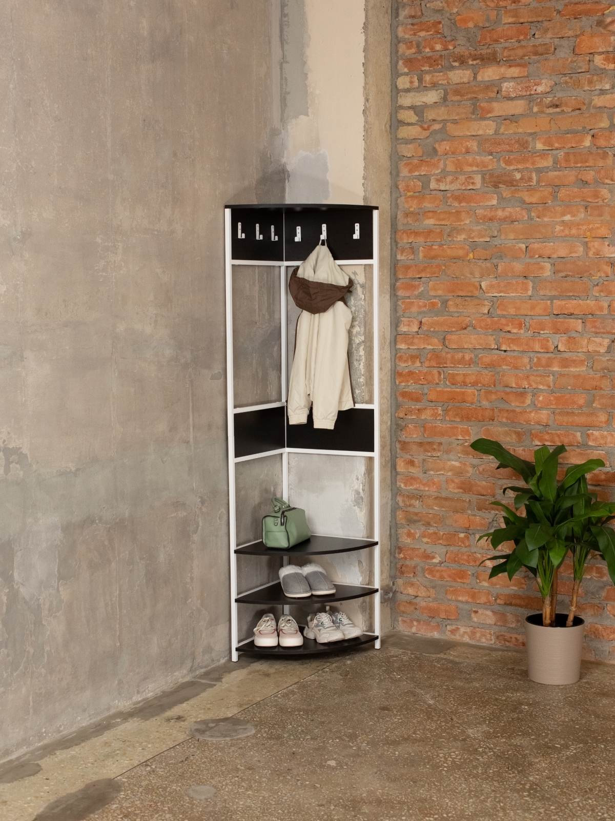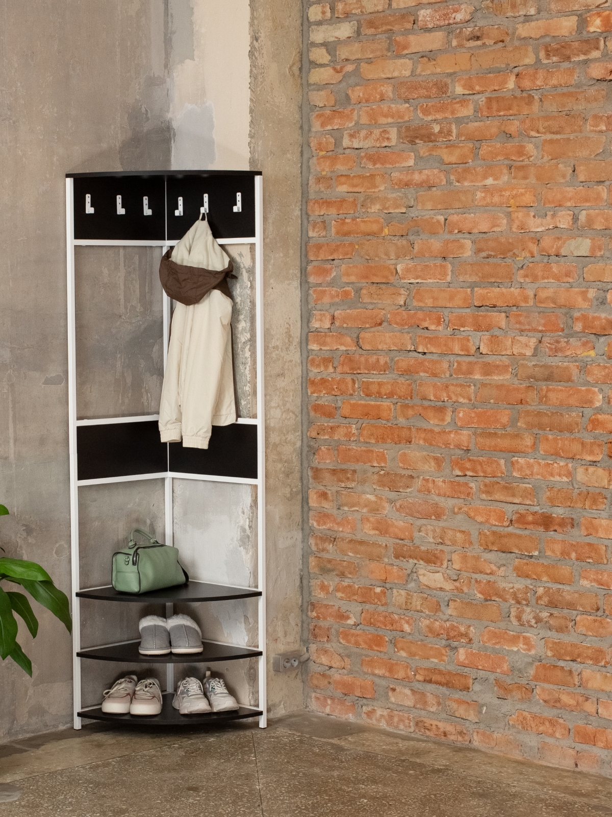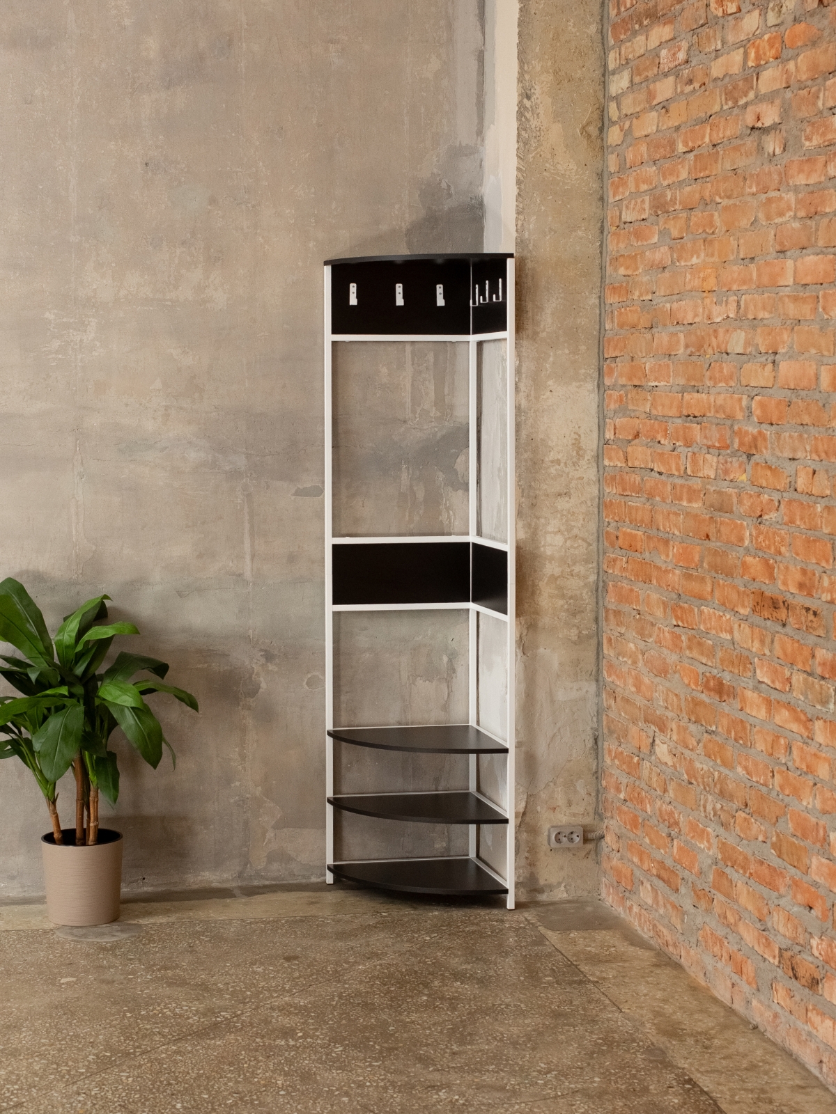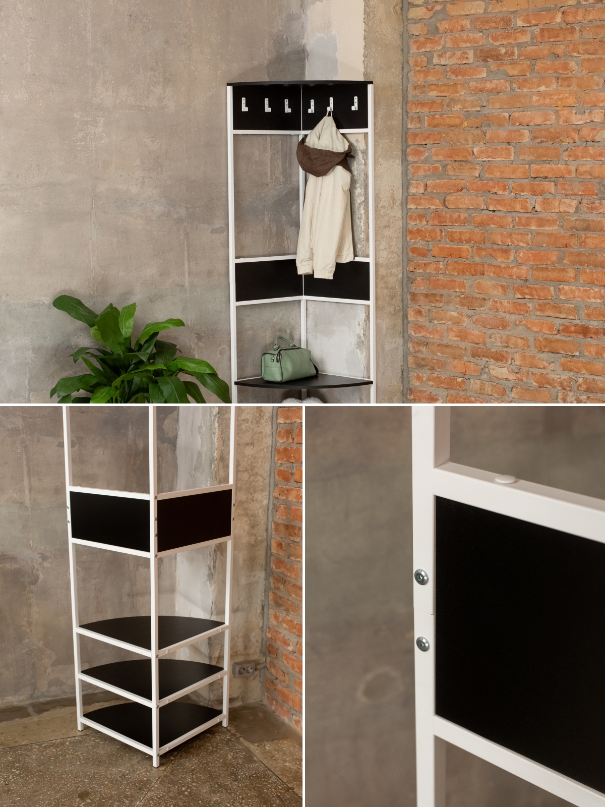 Угловая конструкция позволяет максимально эффективно использовать пространство коридора, экономя место даже в самых компактных прихожих. Эта угловая вешалка оснащена удобной системой хранения: шесть надежных крючков для размещения верхней одежды делают гардероб удобным и функциональным. Три полки из ЛДСП расположены внизу — они идеальны для хранения сумок, обуви и аксессуаров, а верхняя полка предлагает дополнительное пространство для головных уборов. Закругленные края полок снижают травмоопасность, делая изделие безопасным для дома.