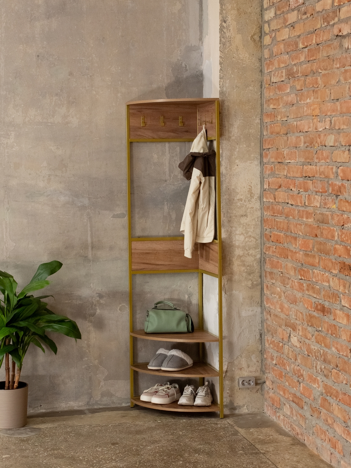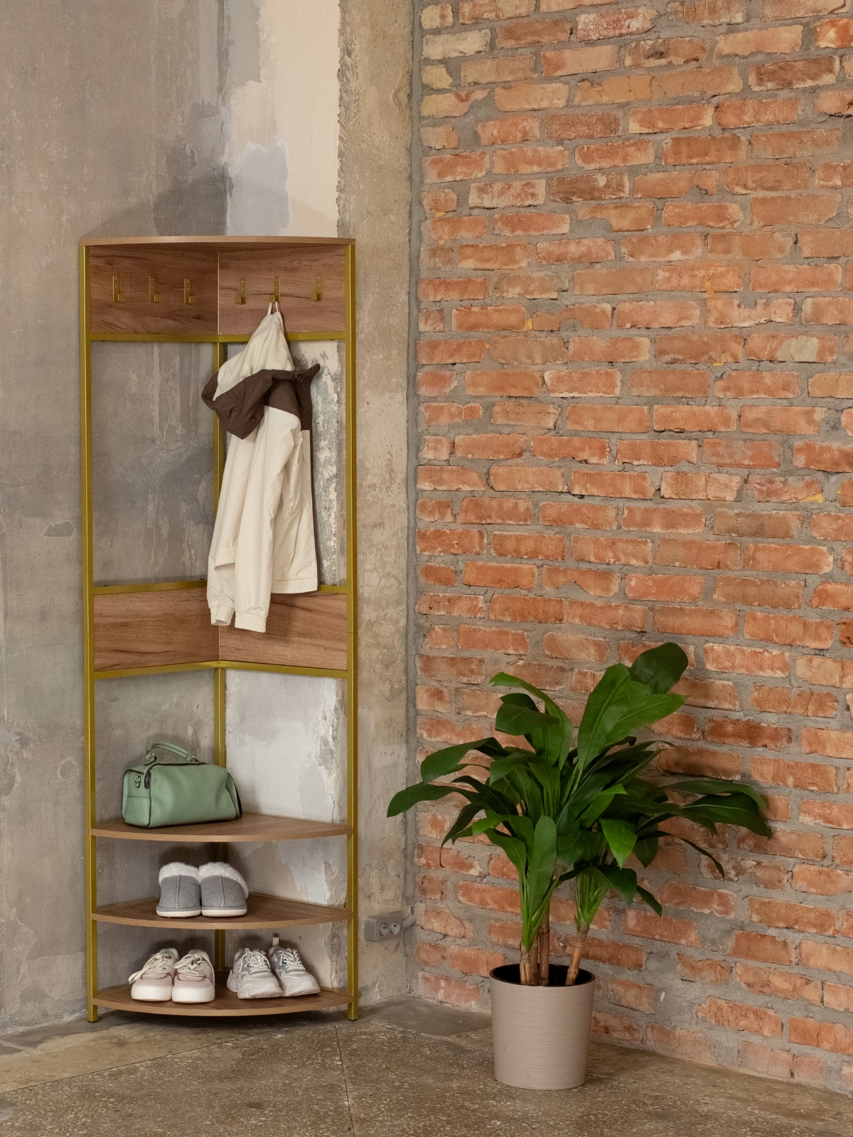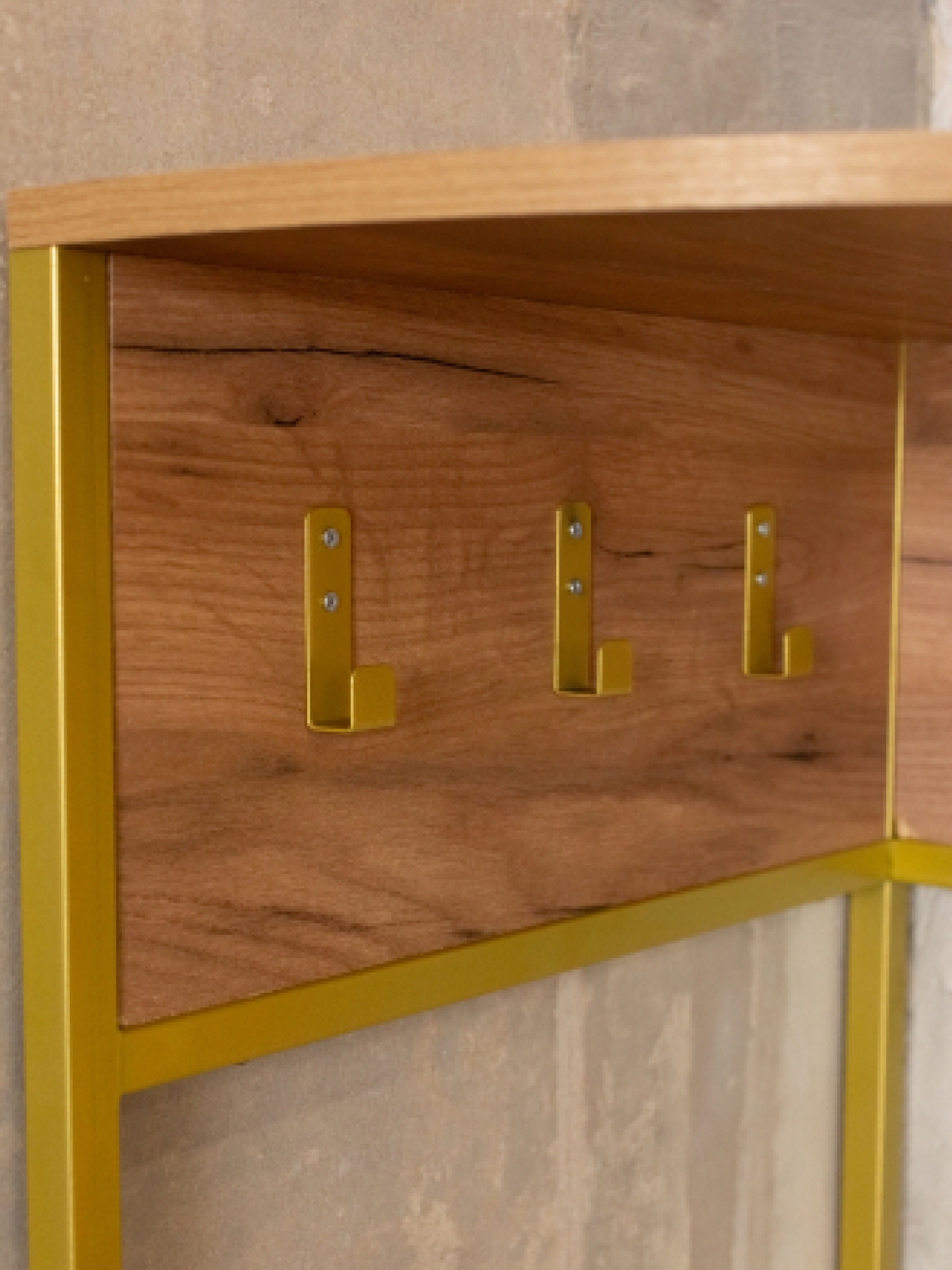 Закругленные края полок снижают травмоопасность, что делает изделие безопасным для дома и гостиной. Компактная и вместительная конструкция подойдет не только для прихожей, но и для спальни или гардеробной, поддерживая порядок и создавая атмосферу комфорта. Современный минималистичный дизайн впишется в разные направления лофта, при этом металлический каркас в золотом оттенке предстает символом не только прочности, но и тепла, шика, подчеркивая индивидуальность владельца.