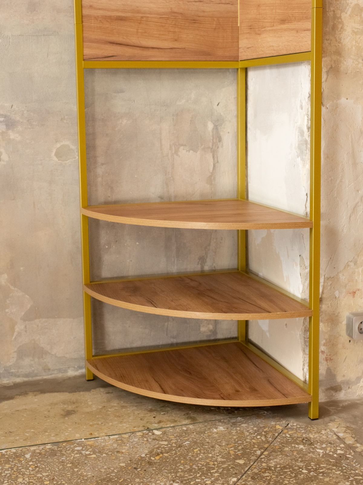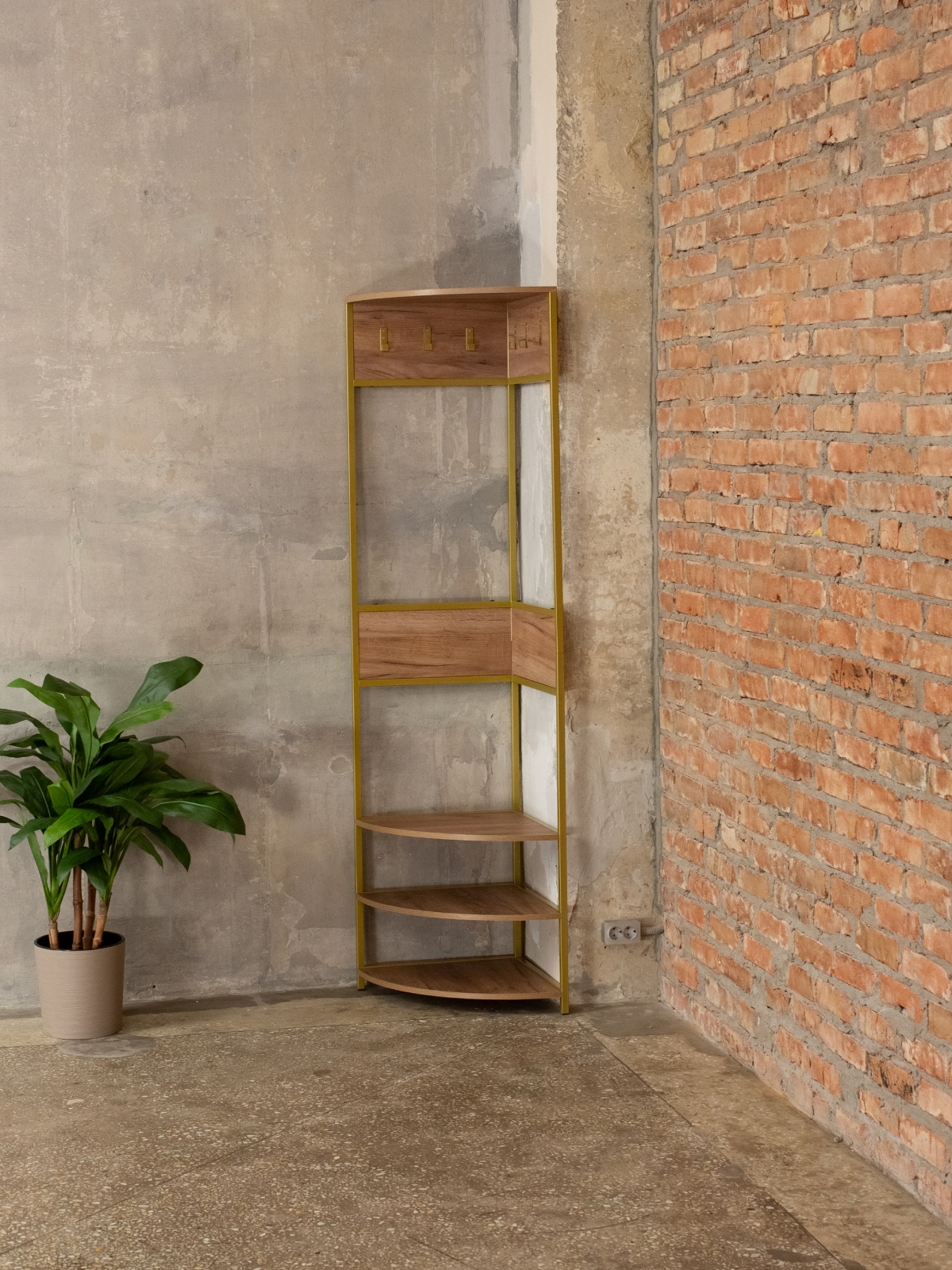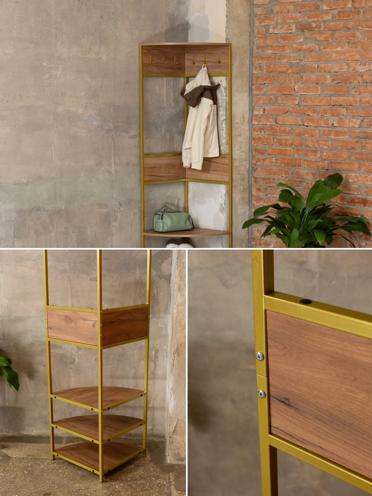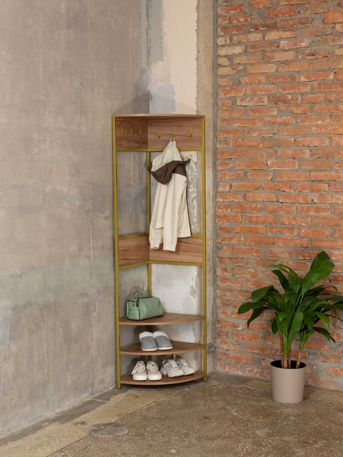 Закругленные края полок снижают травмоопасность, что делает изделие безопасным для дома и гостиной. Компактная и вместительная конструкция подойдет не только для прихожей, но и для спальни или гардеробной, поддерживая порядок и создавая атмосферу комфорта. Современный минималистичный дизайн впишется в разные направления лофта, при этом металлический каркас в золотом оттенке предстает символом не только прочности, но и тепла, шика, подчеркивая индивидуальность владельца.