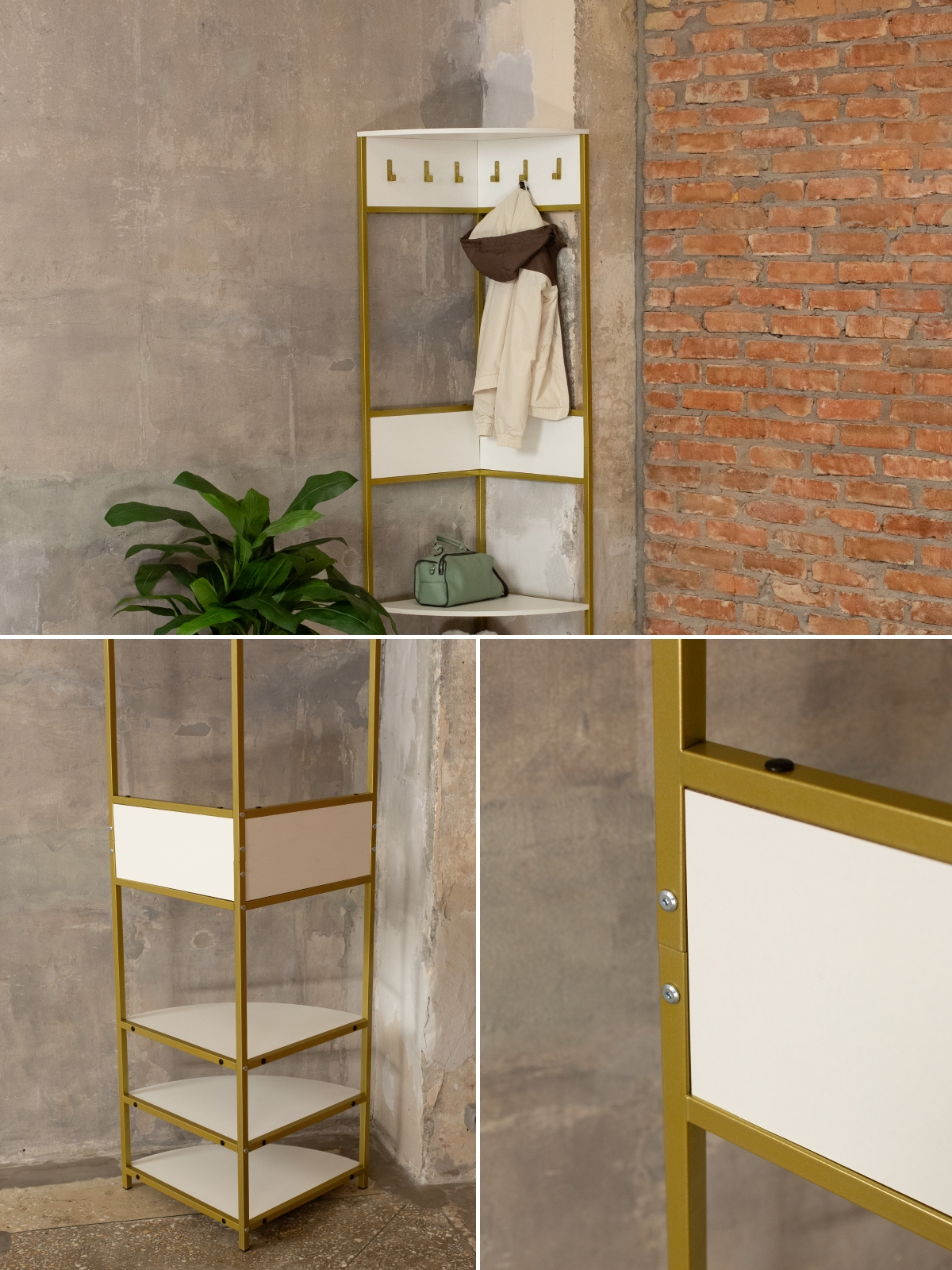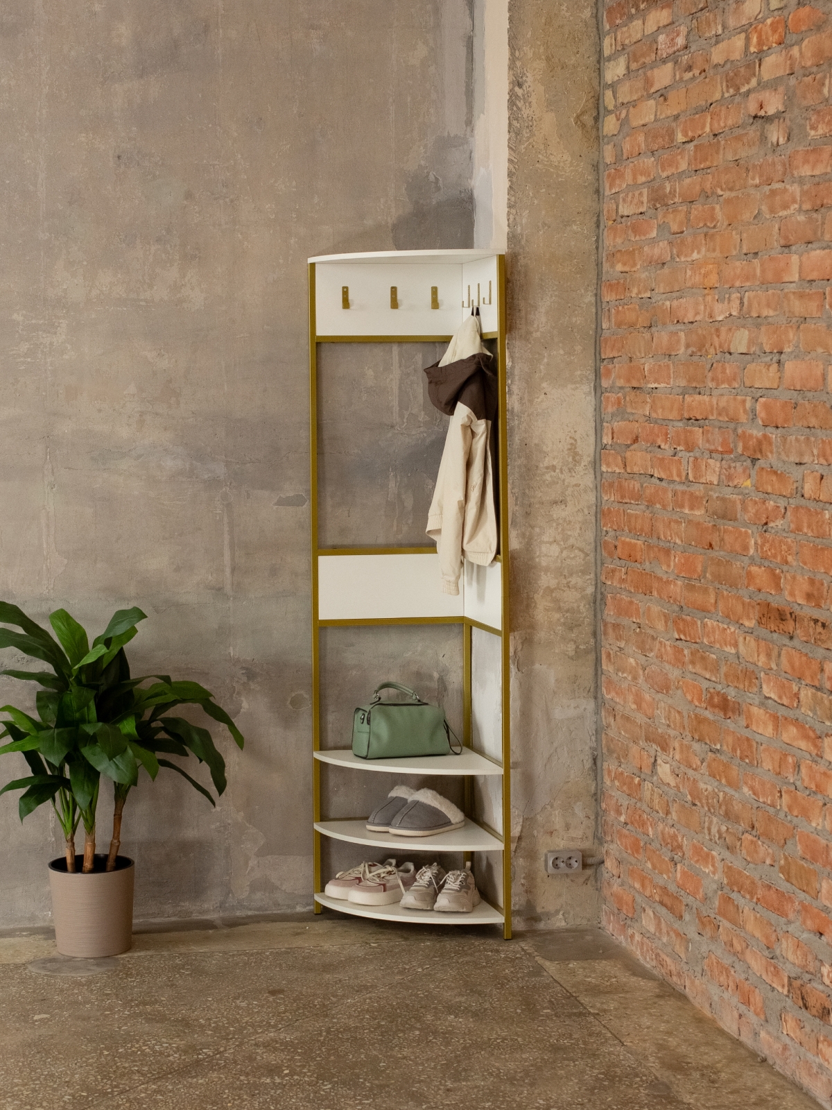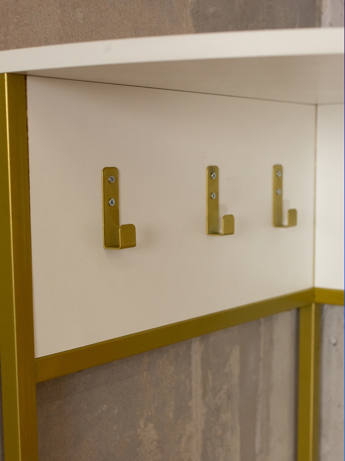 Закругленные края полок снижают травмоопасность, что делает изделие безопасным для дома и гостиной. Компактная и вместительная конструкция подойдет не только для прихожей, но и для спальни или гардеробной, поддерживая порядок и создавая атмосферу комфорта. Современный минималистичный дизайн впишется в разные направления лофта, при этом металлический каркас в золотом оттенке предстает символом не только прочности, но и тепла, шика, подчеркивая индивидуальность владельца.