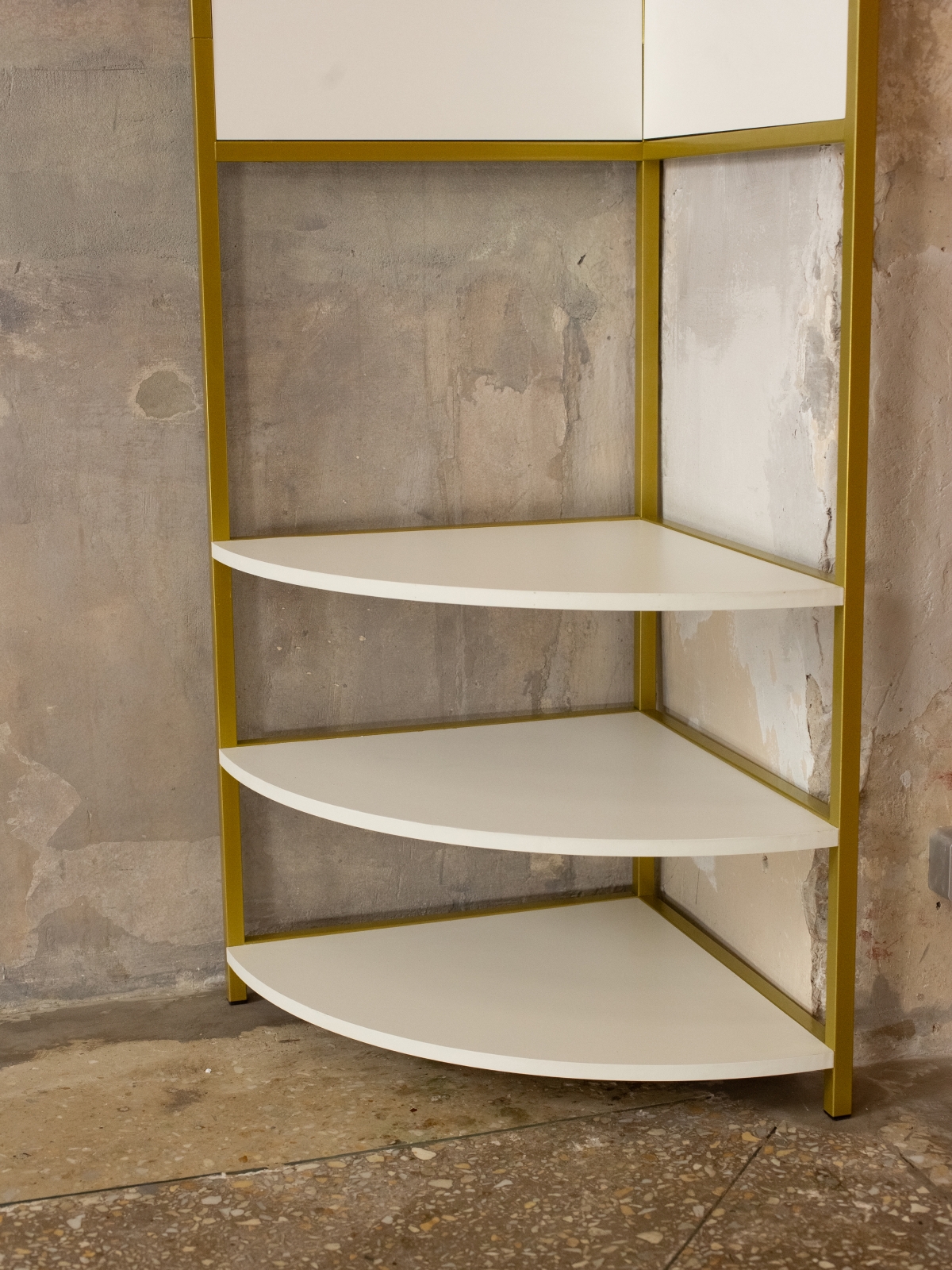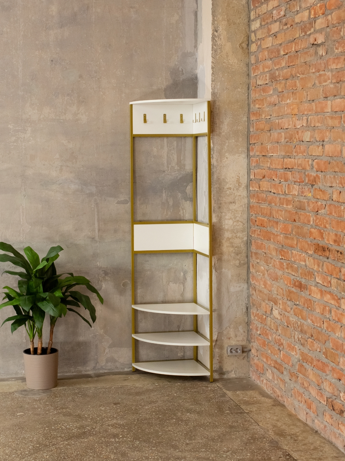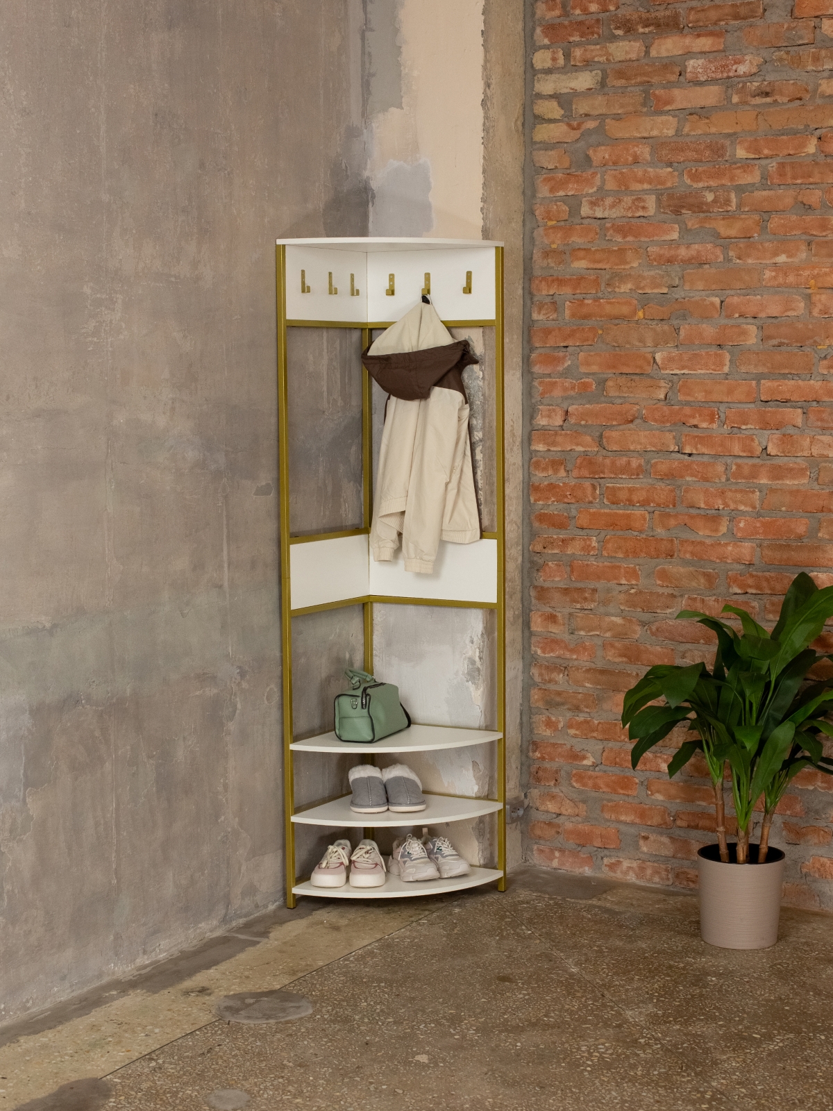 Закругленные края полок снижают травмоопасность, что делает изделие безопасным для дома и гостиной. Компактная и вместительная конструкция подойдет не только для прихожей, но и для спальни или гардеробной, поддерживая порядок и создавая атмосферу комфорта. Современный минималистичный дизайн впишется в разные направления лофта, при этом металлический каркас в золотом оттенке предстает символом не только прочности, но и тепла, шика, подчеркивая индивидуальность владельца.