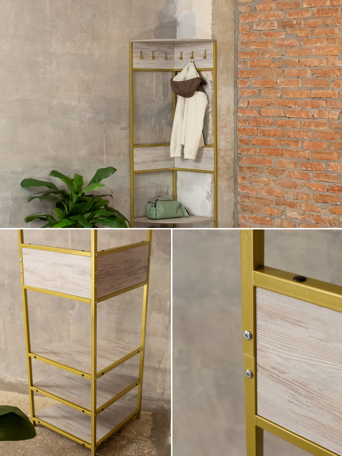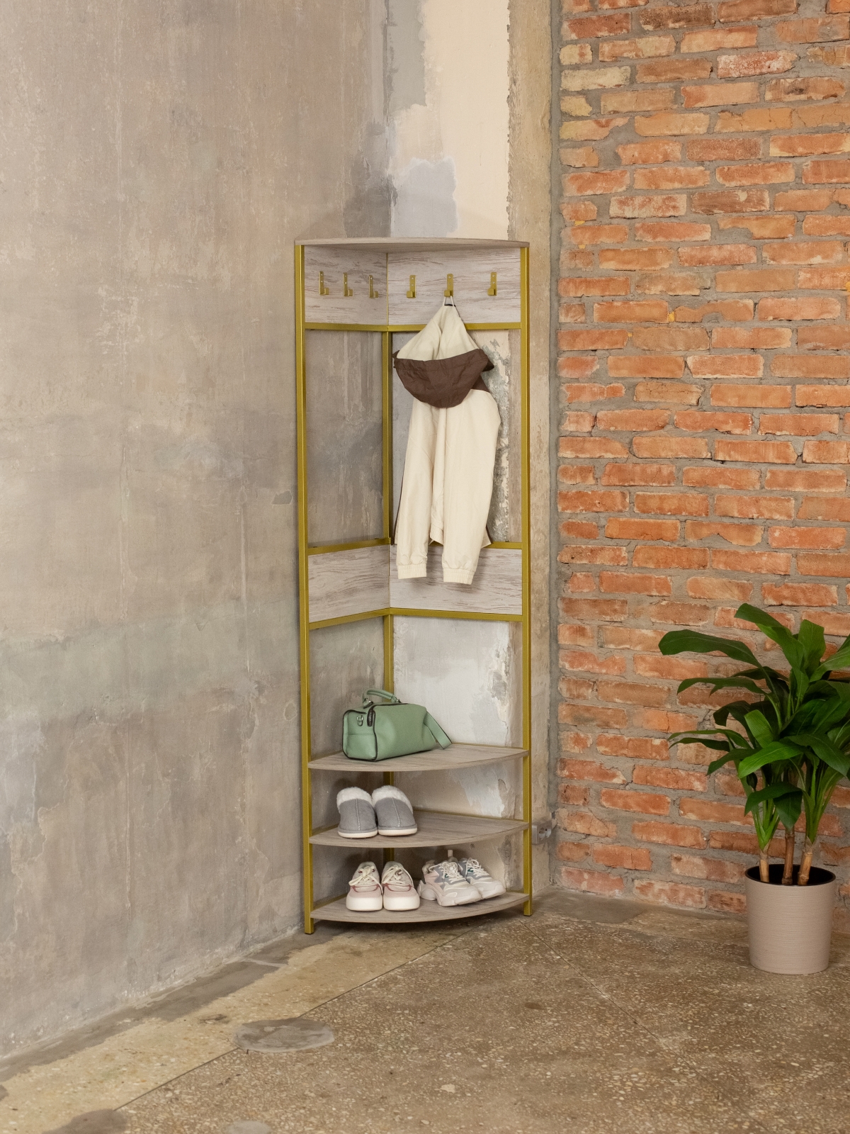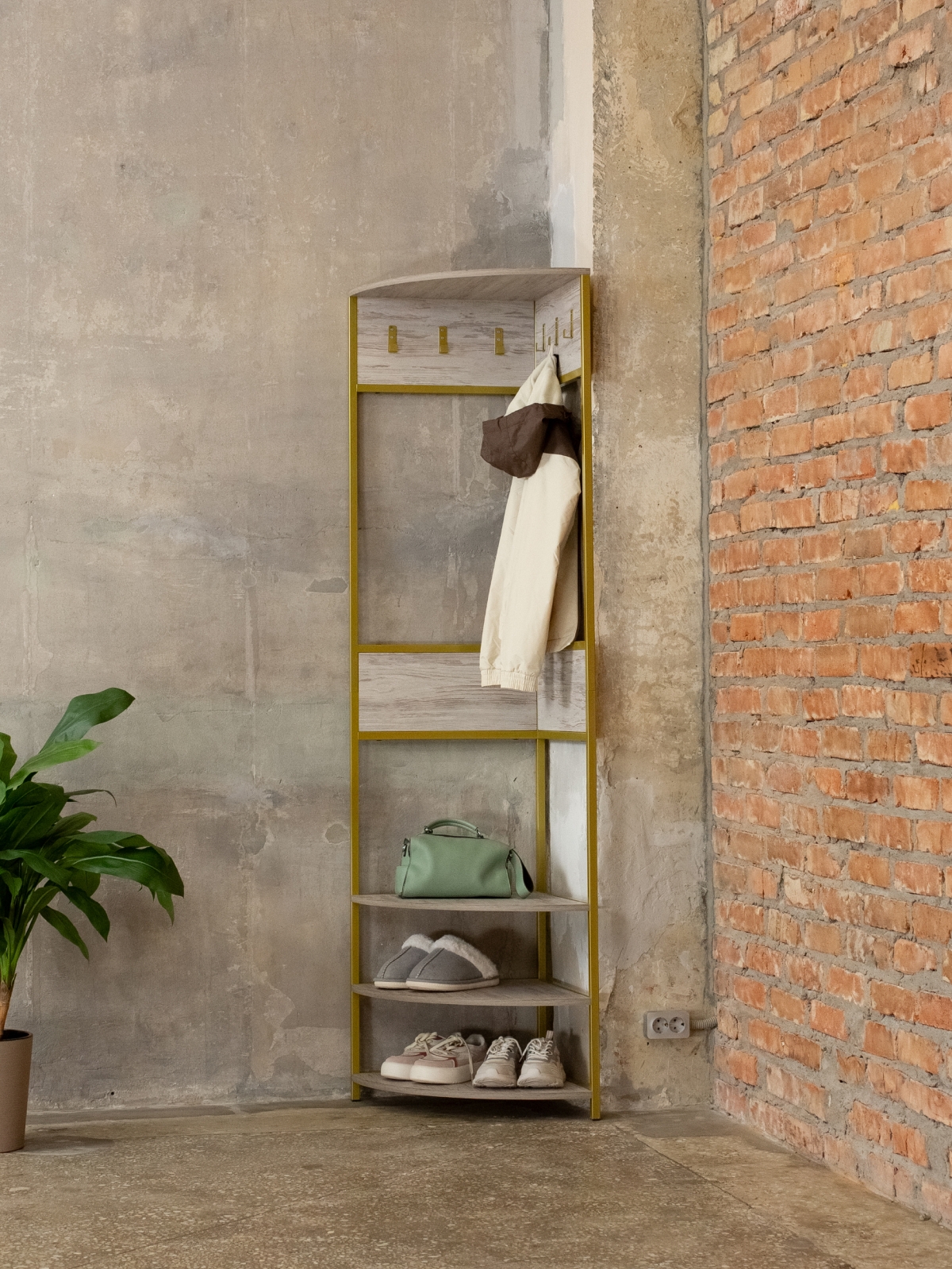 Закругленные края полок снижают травмоопасность, что делает изделие безопасным для дома и гостиной. Компактная и вместительная конструкция подойдет не только для прихожей, но и для спальни или гардеробной, поддерживая порядок и создавая атмосферу комфорта. Современный минималистичный дизайн впишется в разные направления лофта, при этом металлический каркас в золотом оттенке предстает символом не только прочности, но и тепла, шика, подчеркивая индивидуальность владельца.