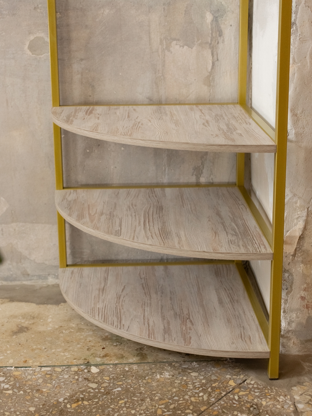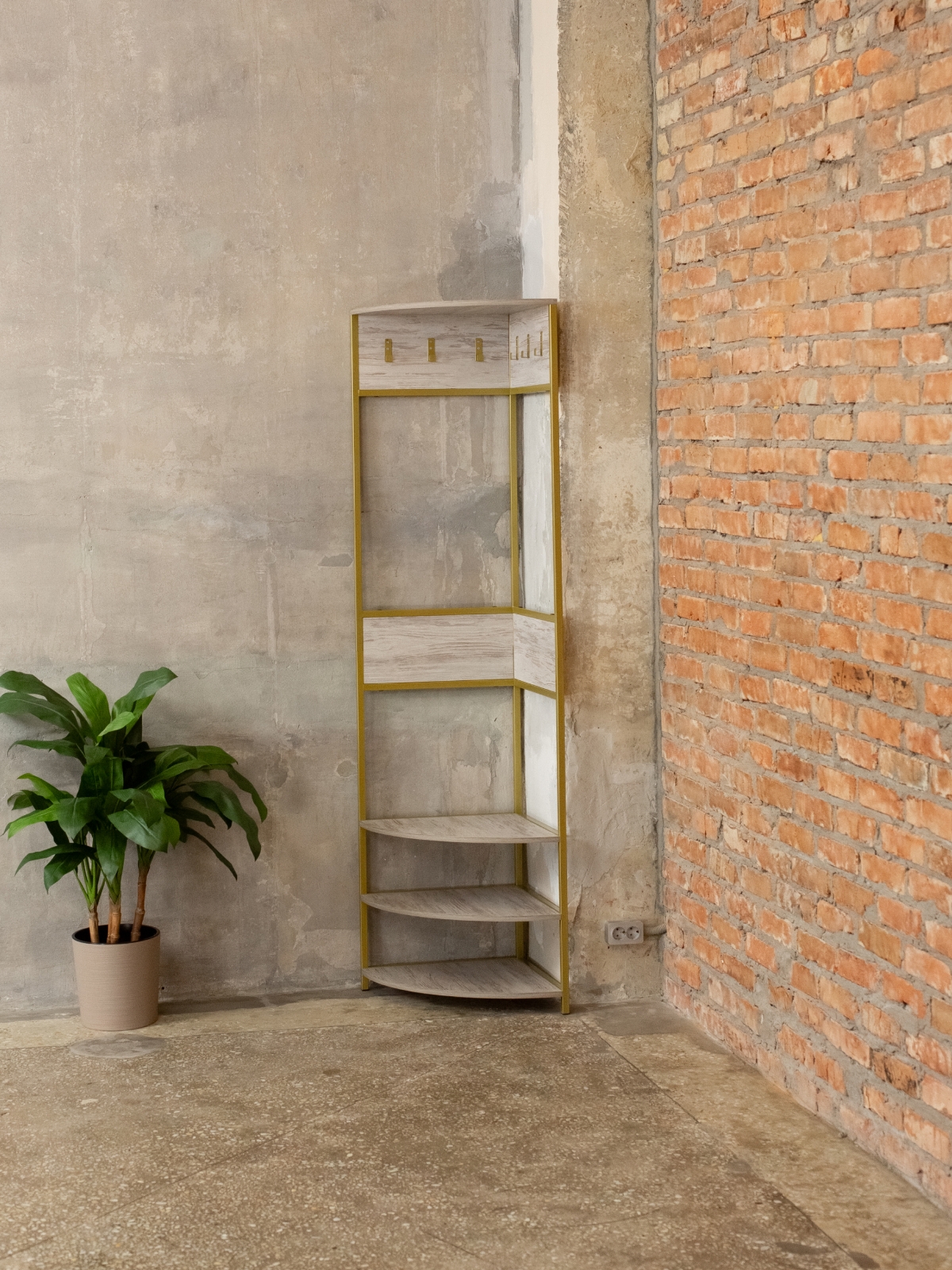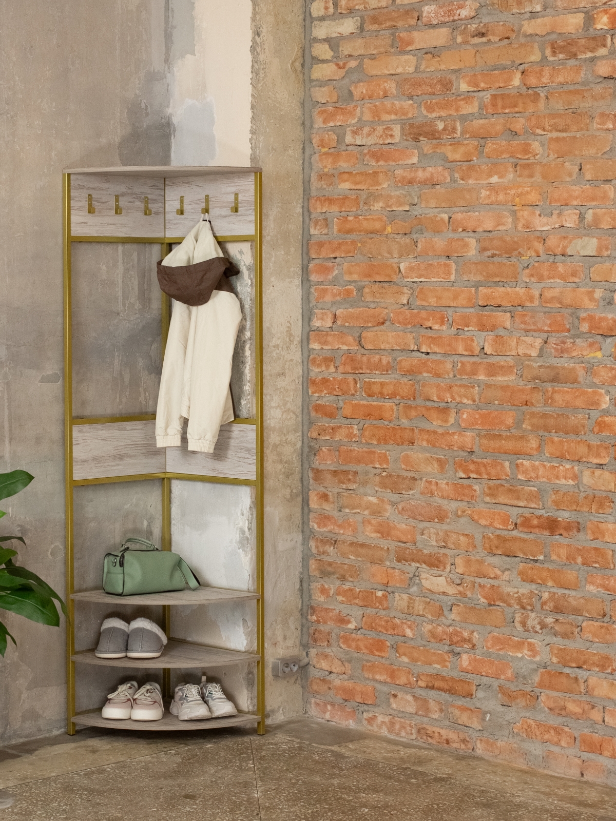 Закругленные края полок снижают травмоопасность, что делает изделие безопасным для дома и гостиной. Компактная и вместительная конструкция подойдет не только для прихожей, но и для спальни или гардеробной, поддерживая порядок и создавая атмосферу комфорта. Современный минималистичный дизайн впишется в разные направления лофта, при этом металлический каркас в золотом оттенке предстает символом не только прочности, но и тепла, шика, подчеркивая индивидуальность владельца.