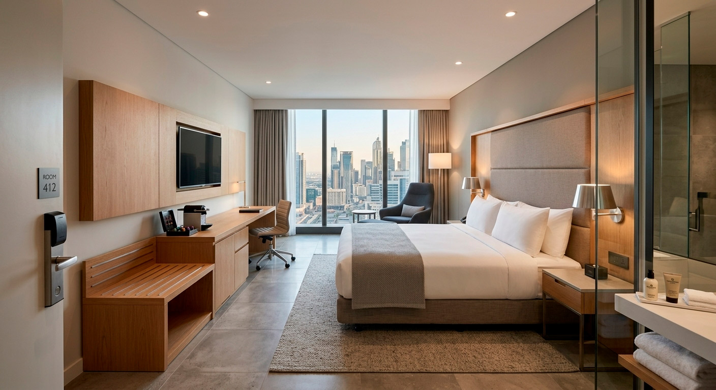 - Приватные зоны — номера. Здесь эргономика сосредоточена на сценариях отдыха. Расстояние между кроватью и стеной, высота прикроватных тумб, расположение выключателей — каждая мелочь влияет на оценку гостя.