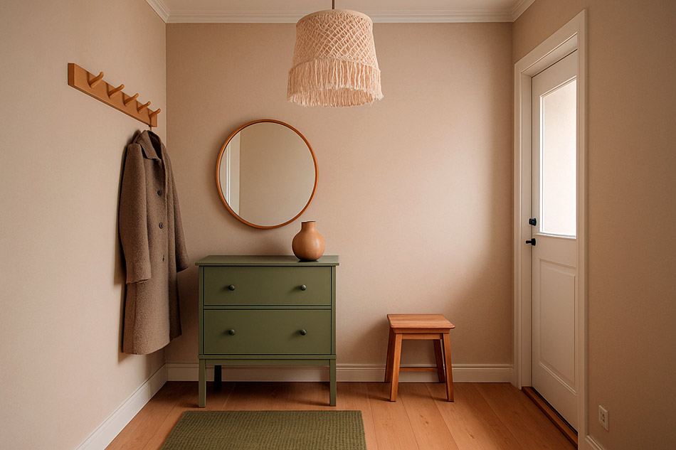 Большая площадь позволяет экспериментировать с темными и глубокими оттенками, не боясь сделать пространство мрачным. Здесь можно разместить удобные системы хранения: большой гардероб, комод для аксессуаров, обувницу. Для удобства гостей и повседневного использования можно добавить стильную напольную вешалку или несколько крючков на свободную стену.
