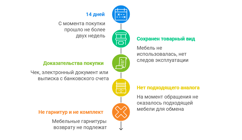 Вернуть мебель надлежащего качества (без брака) и получить деньги можно только при соблюдении следующих условий: