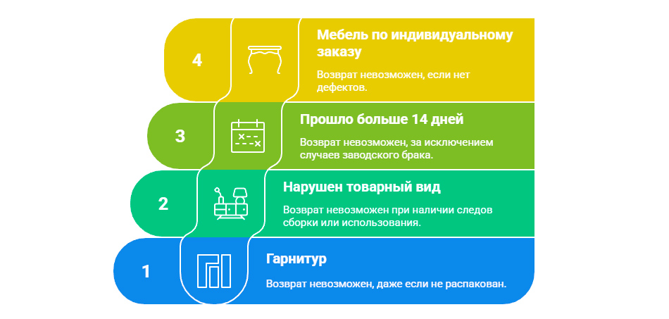 Важно! Эта статья касается только мебели надлежащего качества — без заводских браков, царапин или иных дефектов. Если товар поврежден, правила возврата иные.