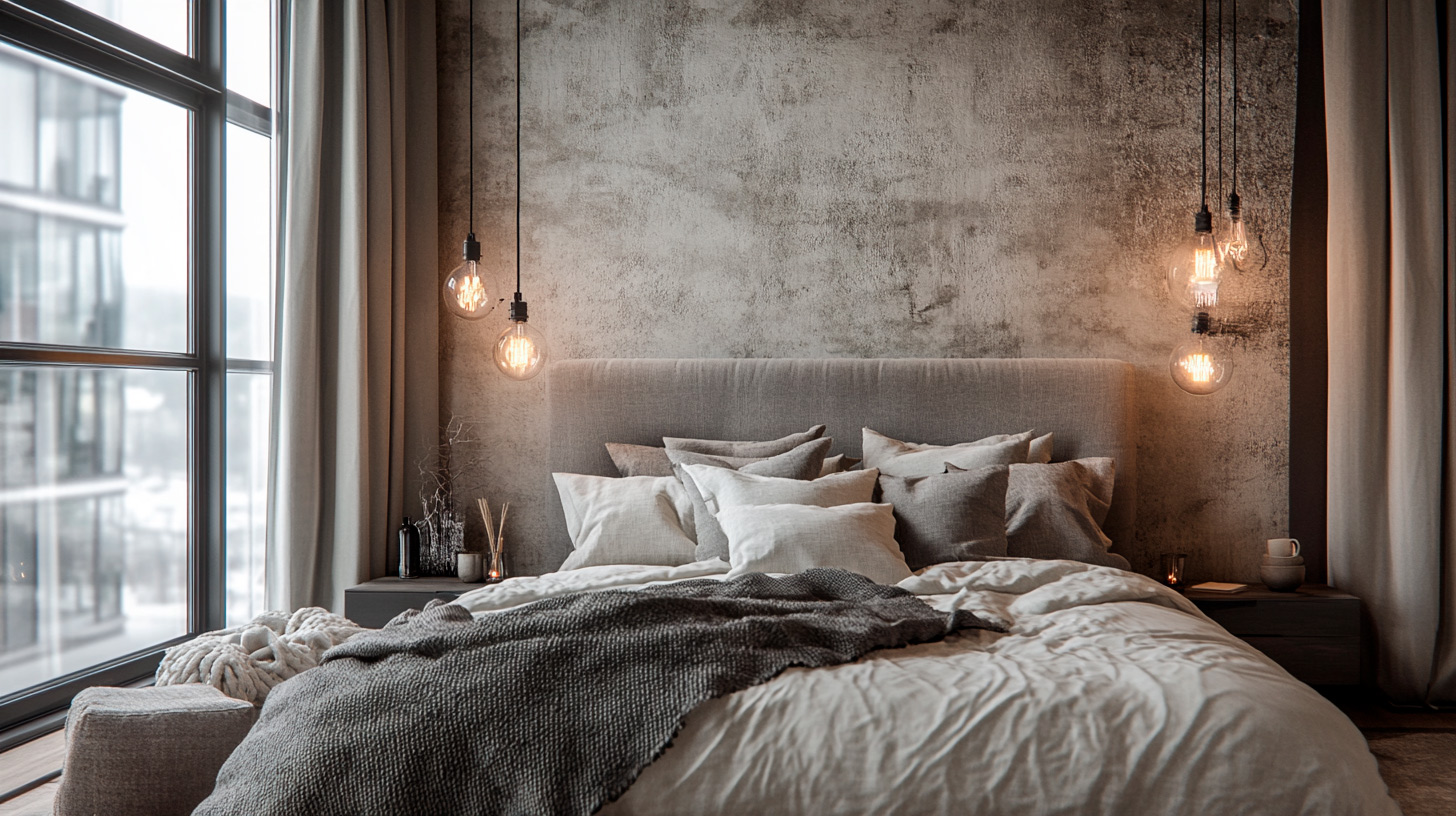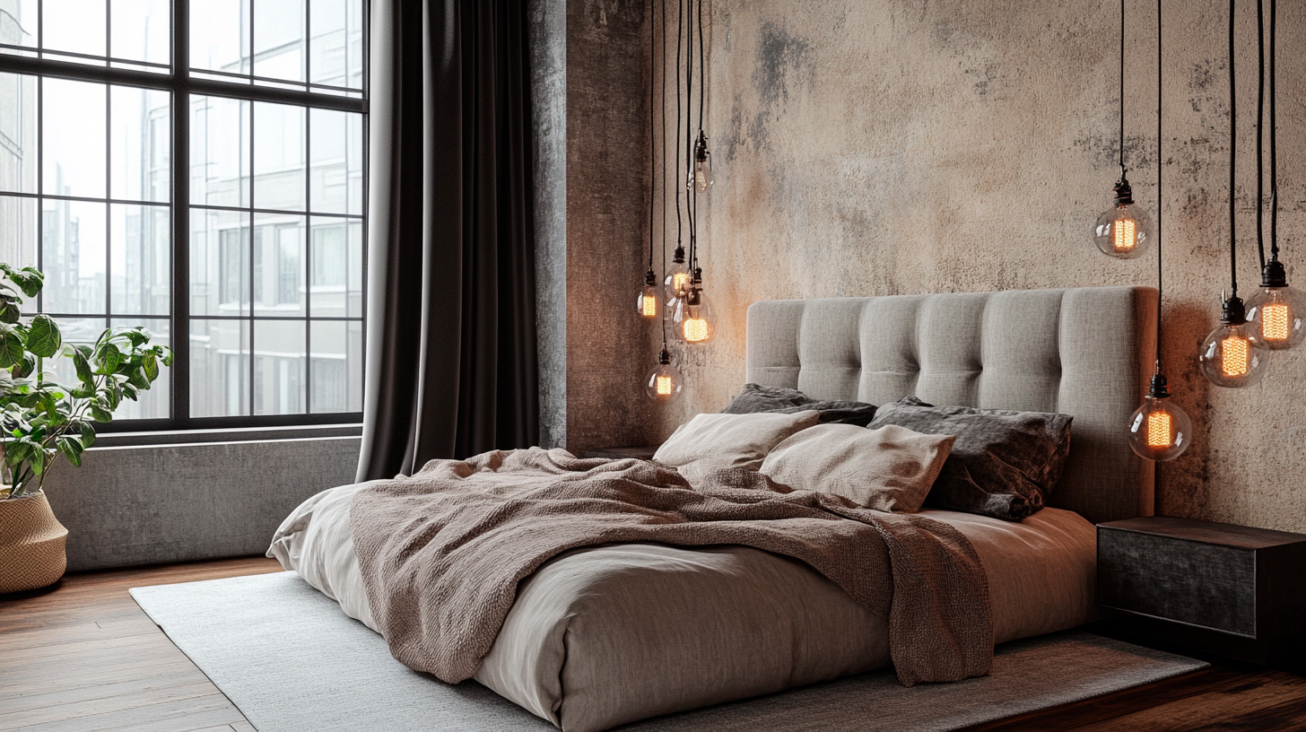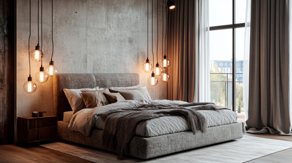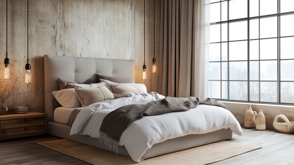 - Ремонт спальни в стиле лофт. Здесь важно соблюсти баланс и создавать атмосферу уюта, не теряя характер стиля. Часто используют лофт в светлых тонах, чтобы комната не казалась мрачной. Вместо холодного бетона на полу лучше применить фактурное дерево. Акцент можно сделать на изголовье кровати или необычном освещении в виде свисающих ламп на длинных шнурах. Современный лофт в спальне — это про текстуры: сочетание грубой штукатурки и мягкого текстиля.