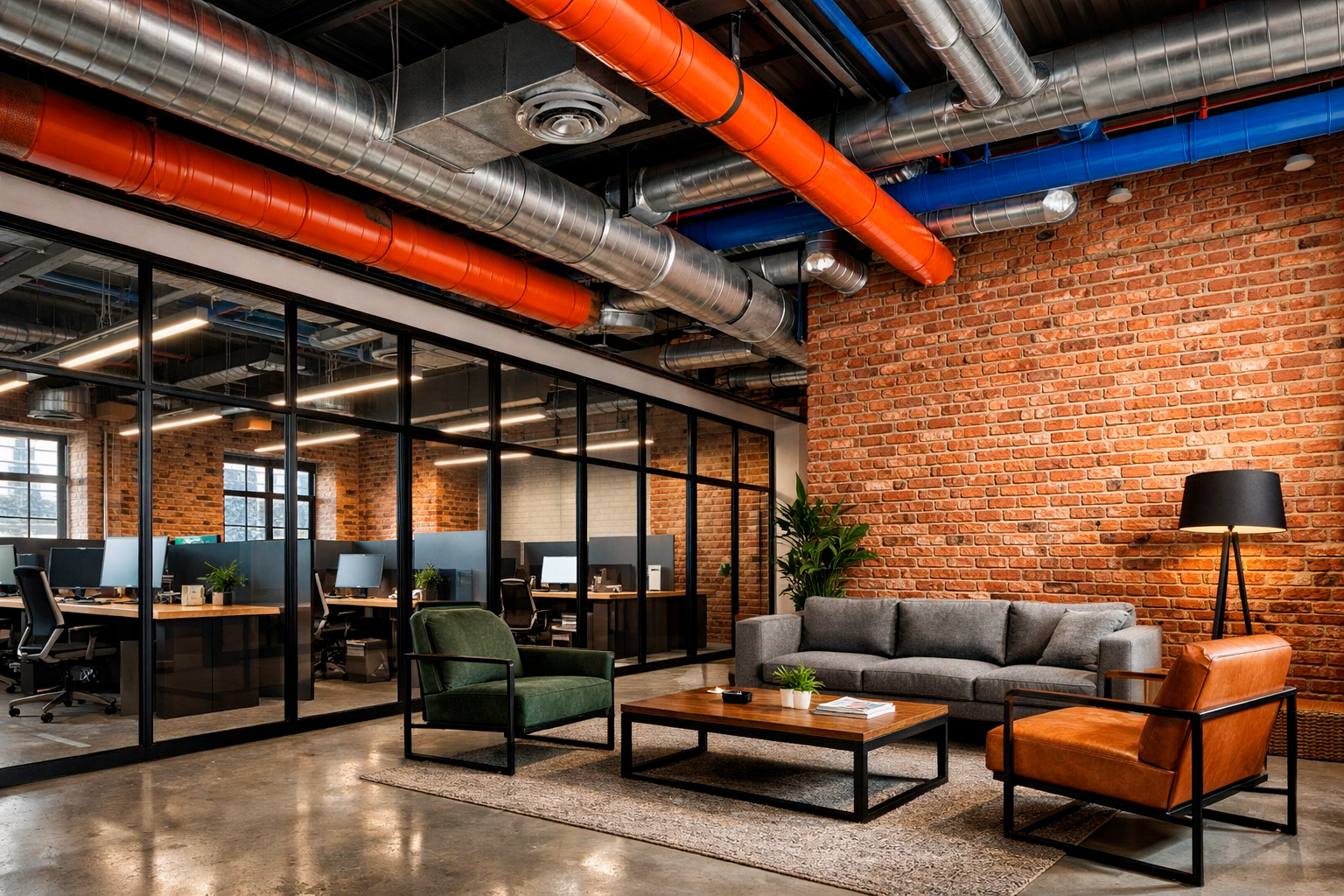 Главная особенность офисного лофта — функциональность при сохранении эстетики «цеха». Открытые потолочные коммуникации (вентиляция, трубы), окрашенные в контрастные цвета, экономят бюджет на отделке потолка и добавляют динамики. При этом ремонт студии в стиле лофт под нужды бизнеса требует безупречного зонирования. Используйте прозрачные стеклянные перегородки с черными рамами — они обеспечивают звукоизоляцию, сохраняя при этом целостность пространства.