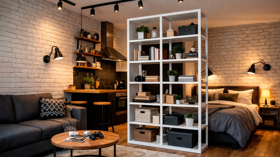 Первый шаг — работа с пространством. Лофт не терпит тесноты. При планировании ремонта студии в стиле лофт основная задача — зонировать помещение без строительства капитальных стен. Используйте разноуровневое освещение, стеклянные перегородки или саму мебель. Например, открытый стеллаж или акцентное кресло могут визуально отделить зону отдыха от рабочего места.