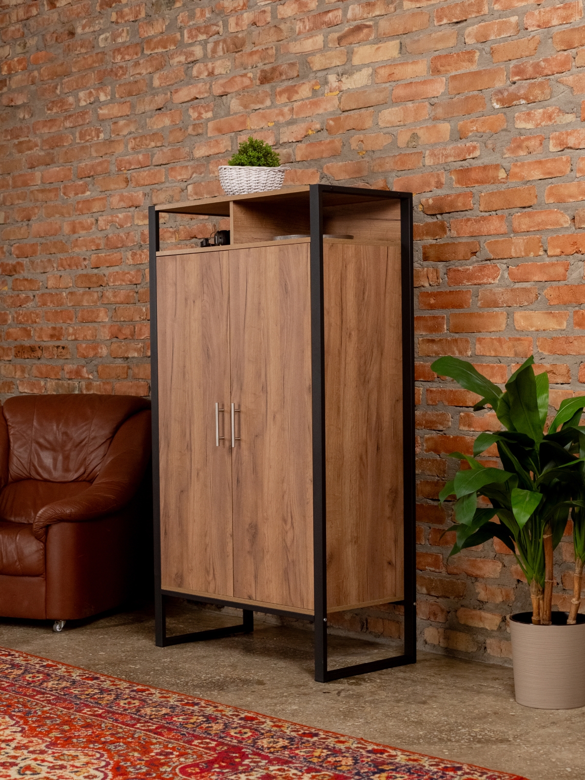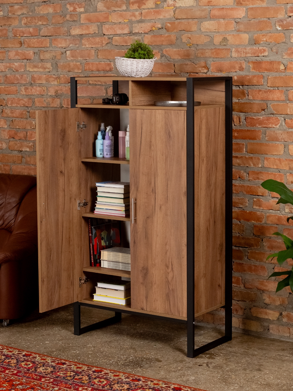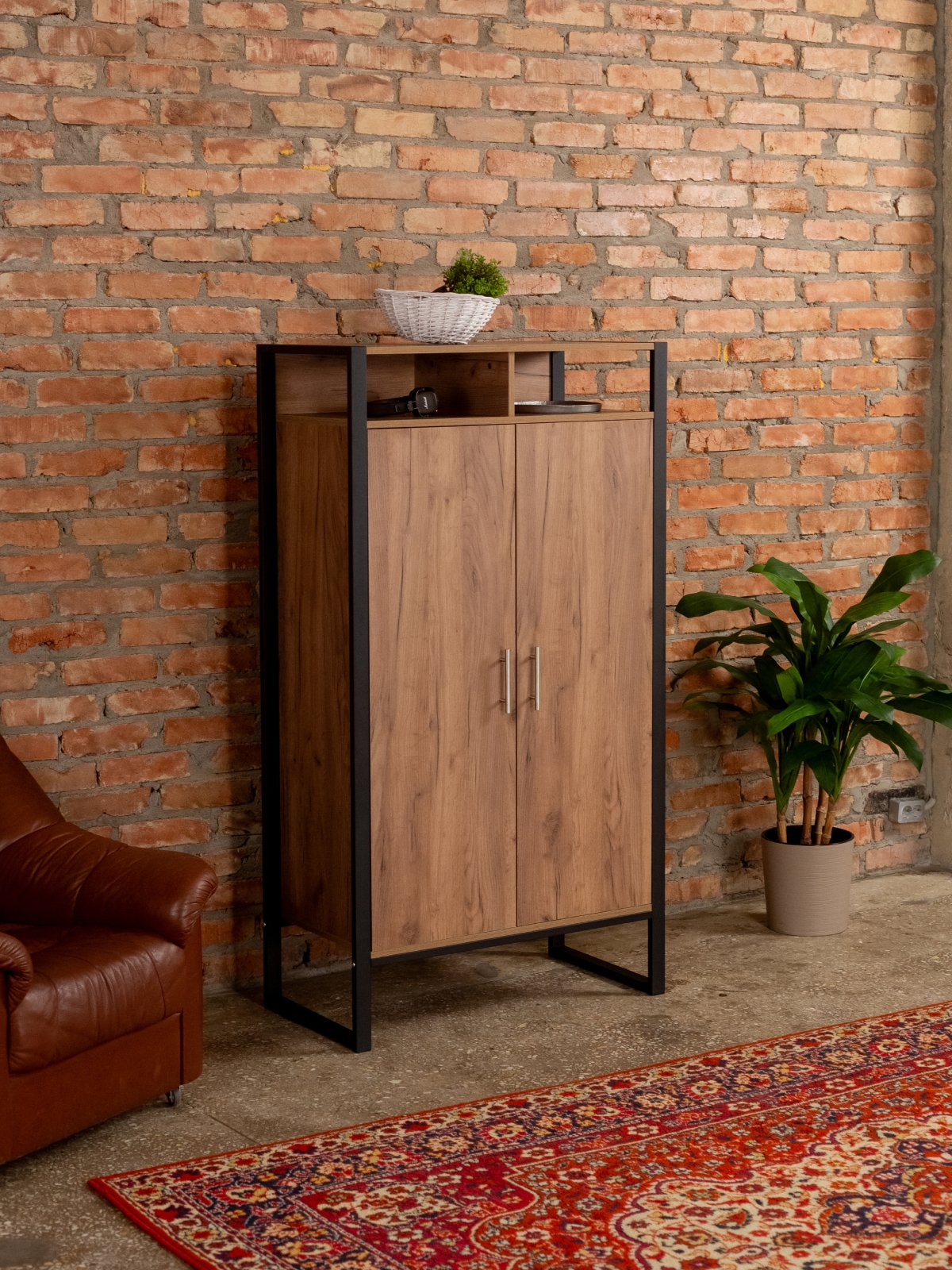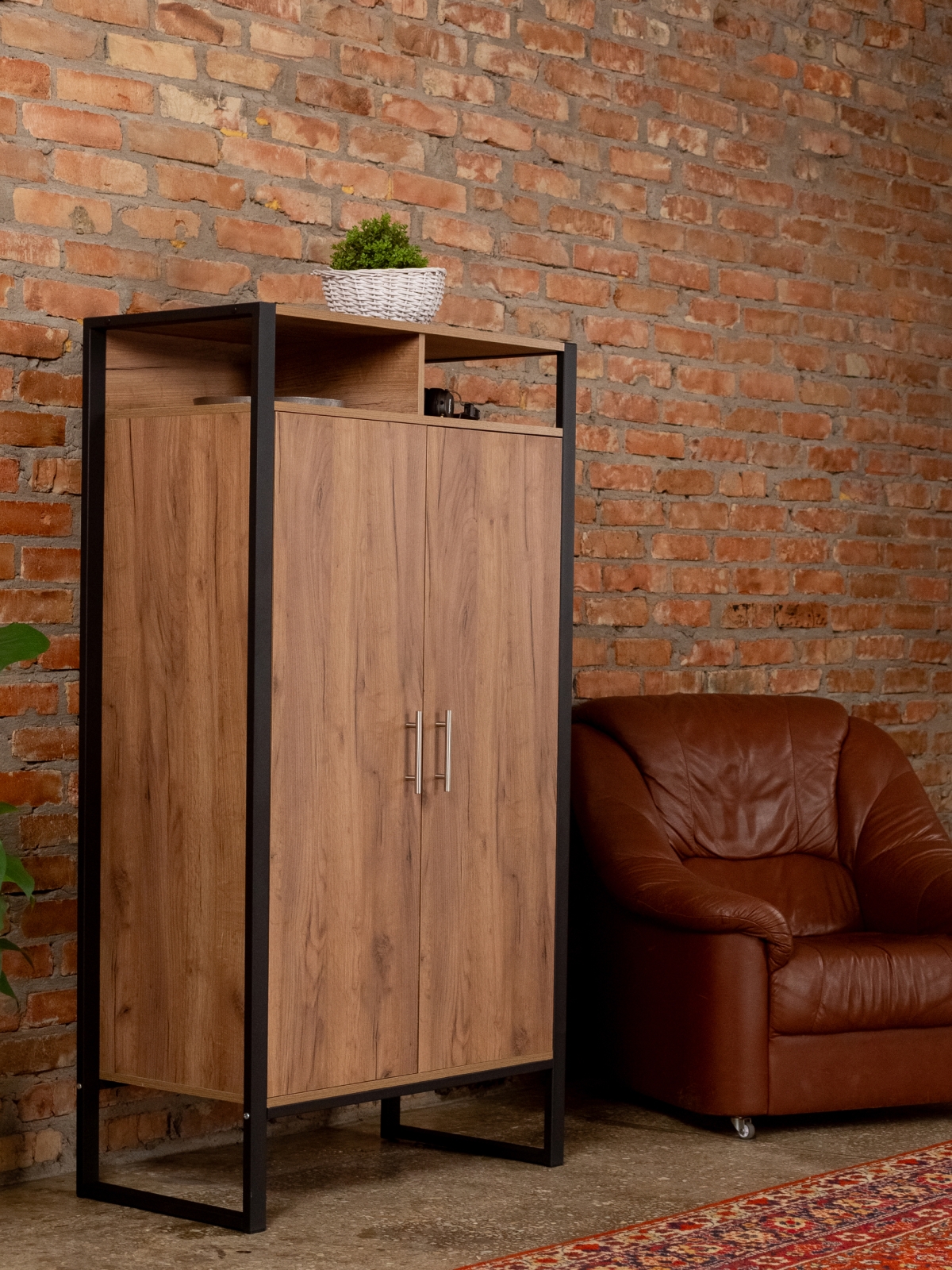 Вместительный и эргономичный шкаф обеспечивает разумную организацию хранения вещей. Модель легко адаптируется под разные нужды. Стиль лофт в сочетании с черным каркасом добавляет строгость и элегантность, делая шкафчик актуальным для современных интерьеров с акцентом на контрасты. Порошковая окраска металлических деталей обеспечивает равномерный цвет без капель и потеков, а текстура металла — матовый муар — придает мебели дополнительный шарм. Черный цвет каркаса гармонирует с кирпичными стенами и темными акцентами, что позволяет создать атмосферу уюта и стиля дома или в коммерческом помещении.