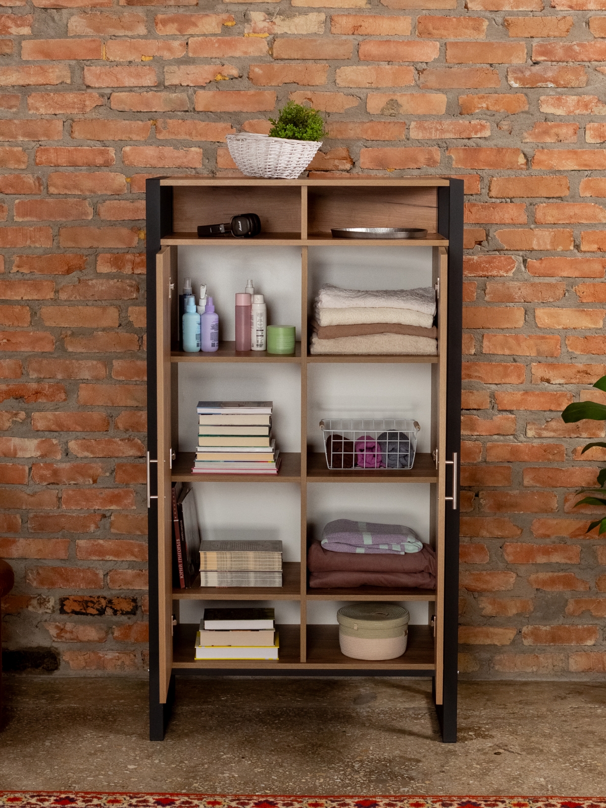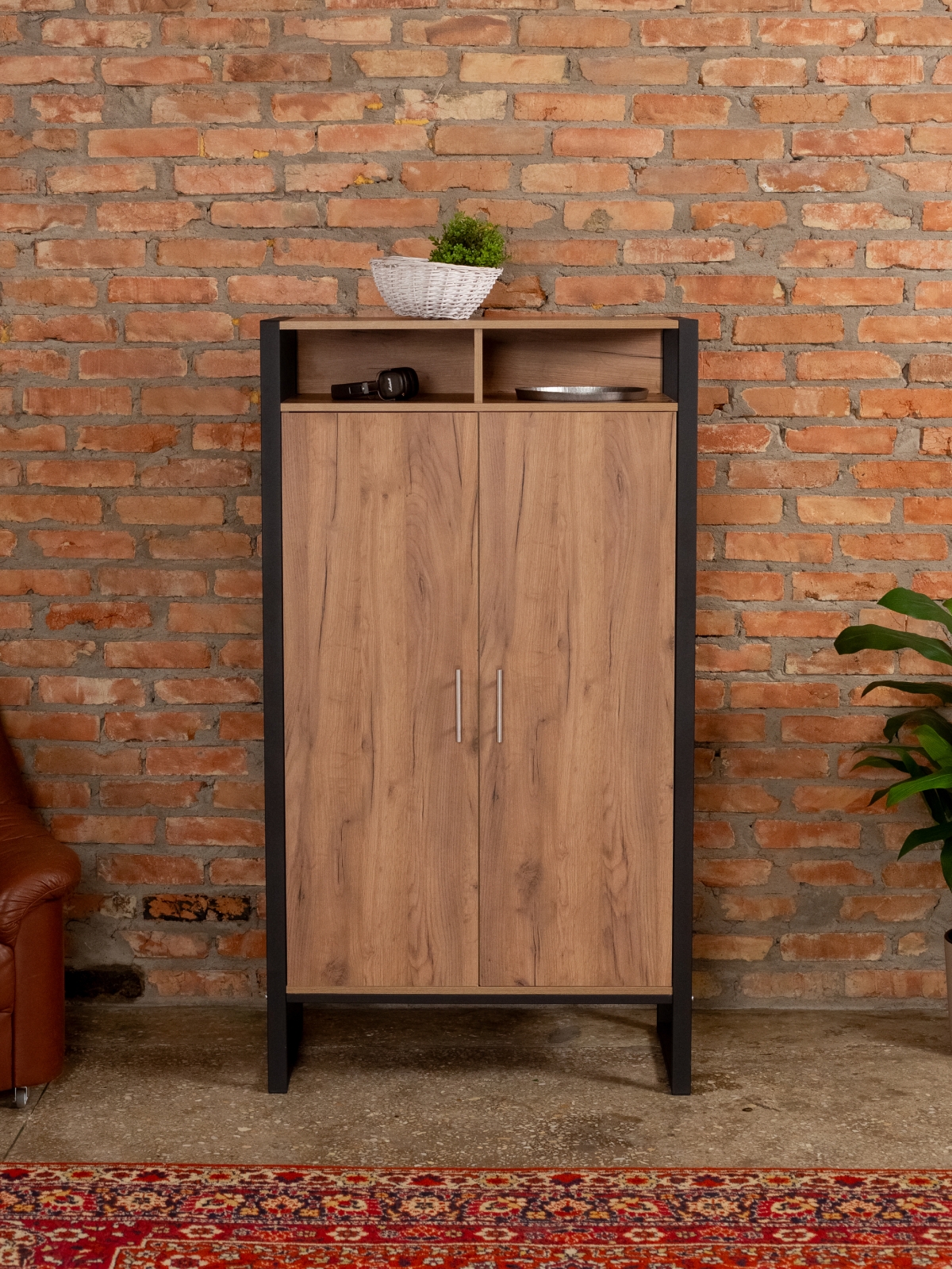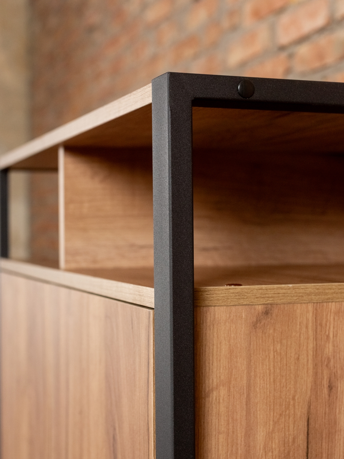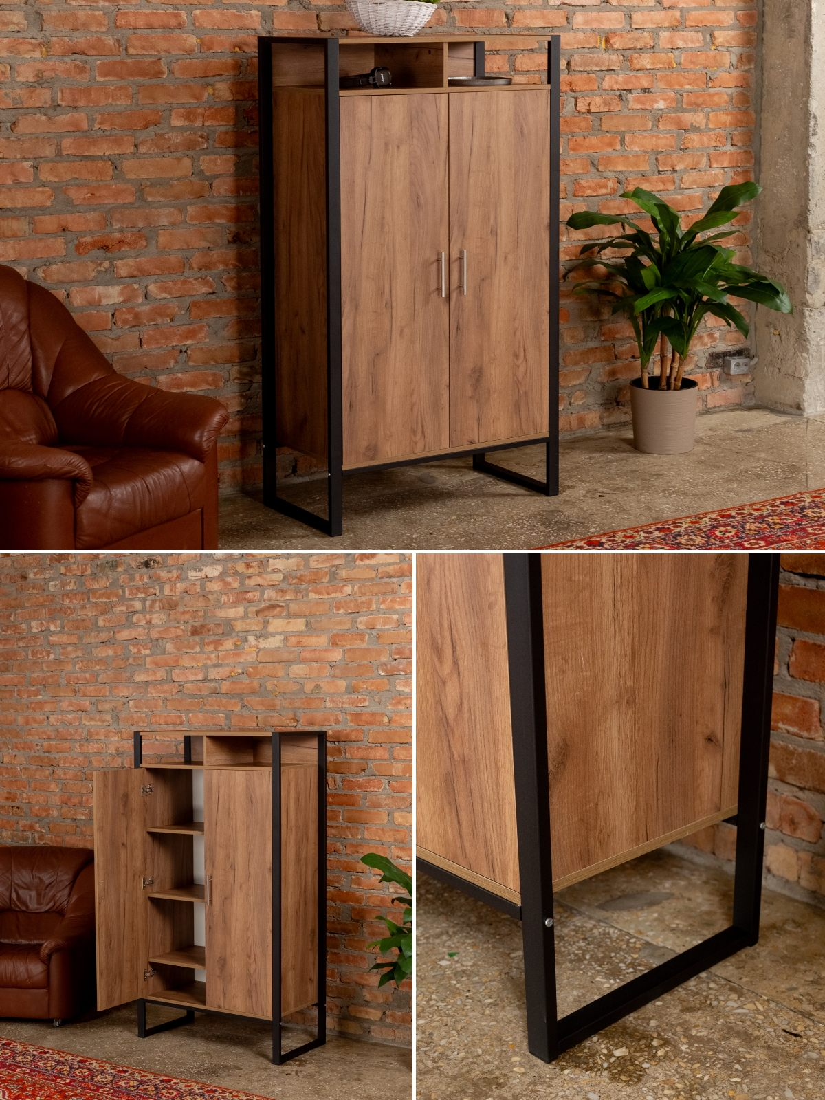 Вместительный и эргономичный шкаф обеспечивает разумную организацию хранения вещей. Модель легко адаптируется под разные нужды. Стиль лофт в сочетании с черным каркасом добавляет строгость и элегантность, делая шкафчик актуальным для современных интерьеров с акцентом на контрасты. Порошковая окраска металлических деталей обеспечивает равномерный цвет без капель и потеков, а текстура металла — матовый муар — придает мебели дополнительный шарм. Черный цвет каркаса гармонирует с кирпичными стенами и темными акцентами, что позволяет создать атмосферу уюта и стиля дома или в коммерческом помещении.