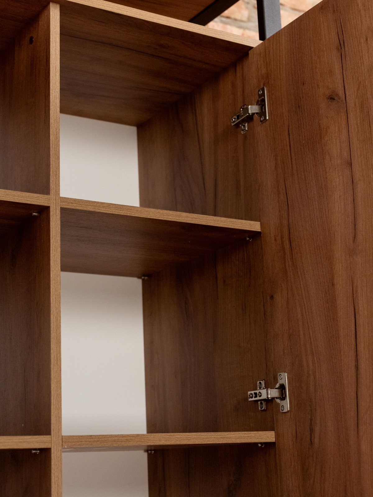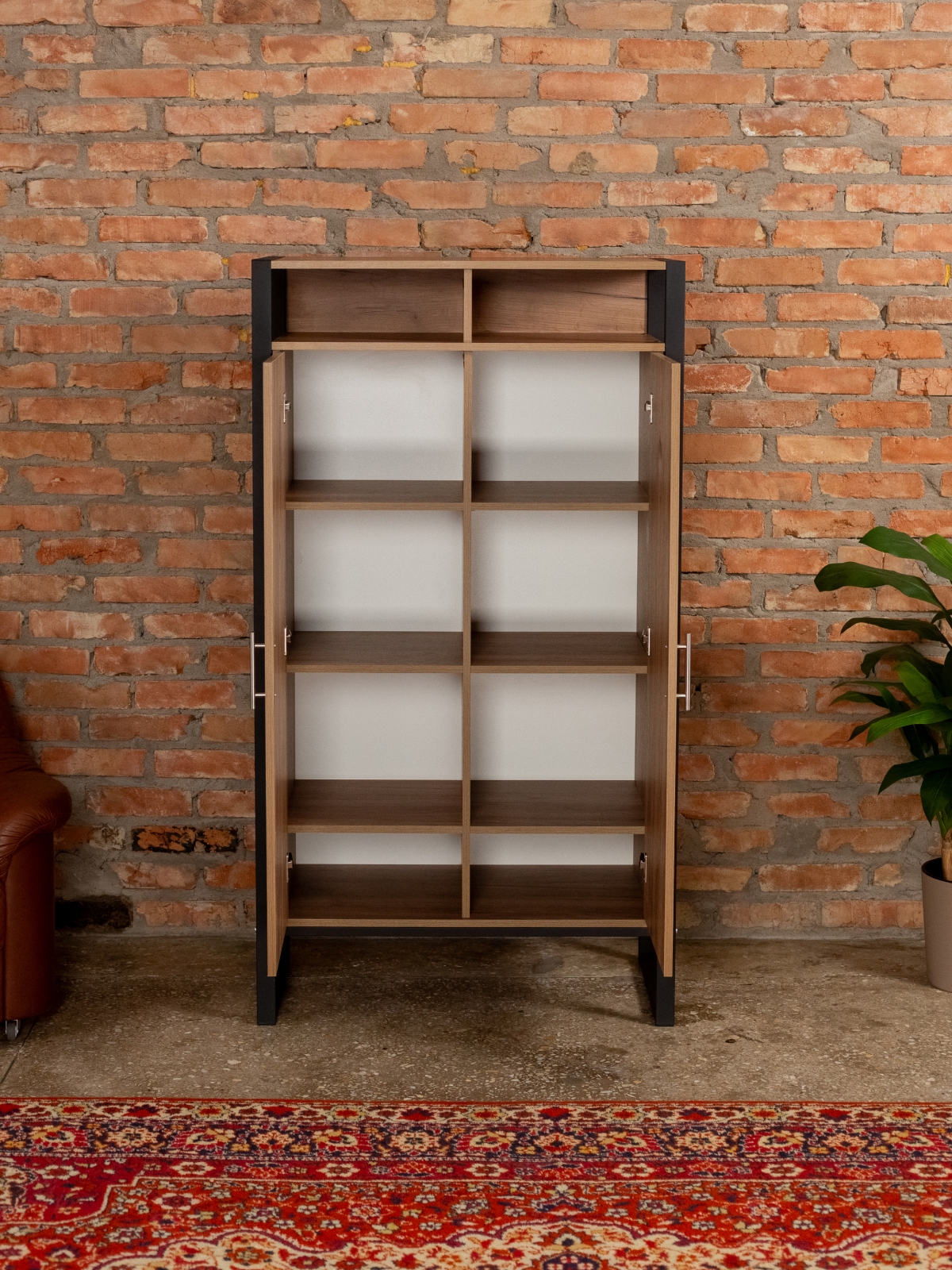 Двухстворчатый распашной шкаф с дверцами и металлическими серыми ручками впишется в интерьер комнаты или офиса. Его с легкостью можно использовать для организации порядка в гардеробной или гостиной. Универсальный дизайн позволяет разместить шкаф на кухне, в спальне, прихожей. Открытые и закрытые полочки обеспечивают удобное распределение вещей и легкий доступ к ним. За дверцами — 8 закрытых полок, где можно разместить белье, обувь, аксессуары или другие необходимые предметы. Две открытые полки отлично подойдут для книг, декора и любимых сувениров.