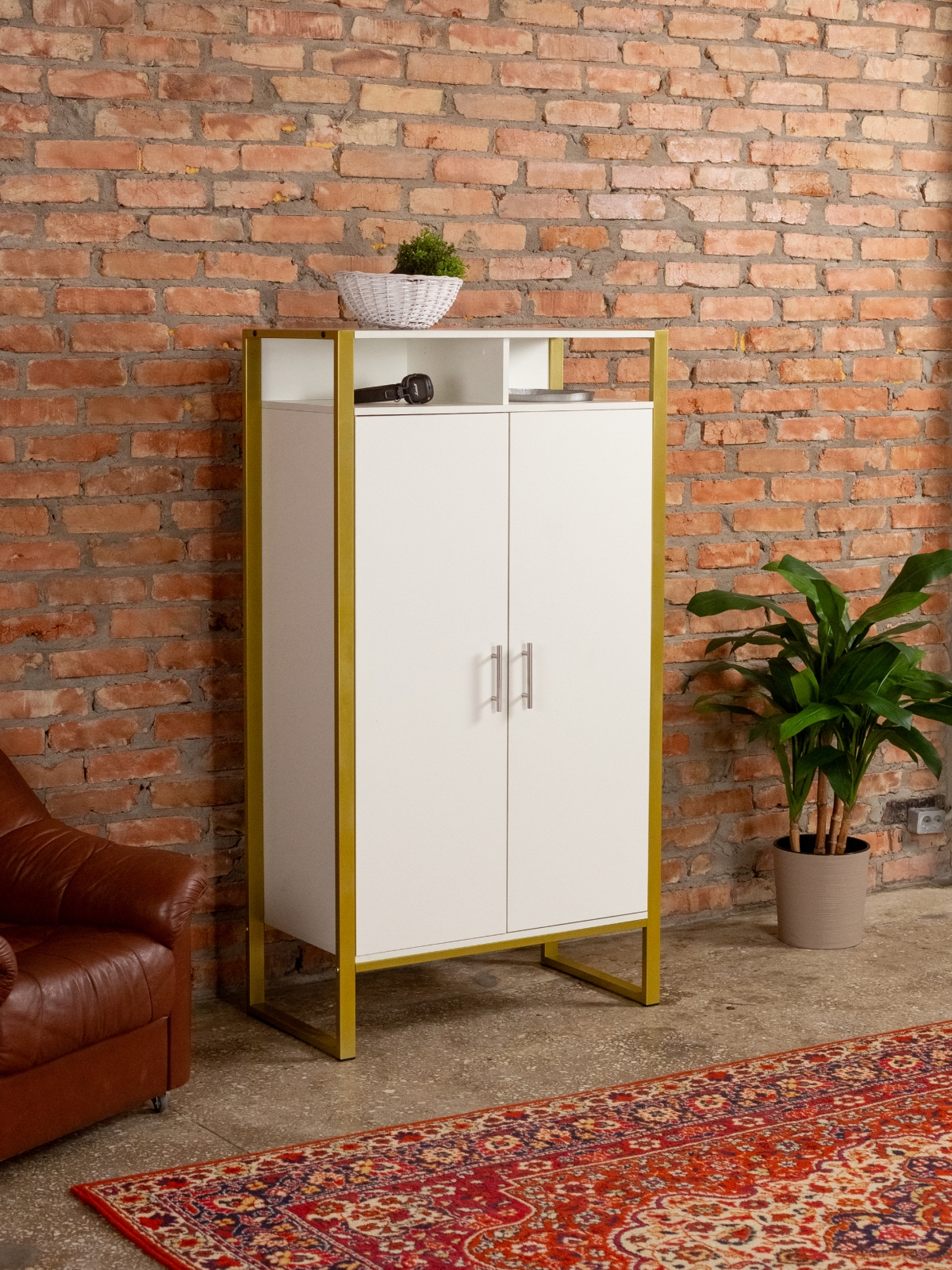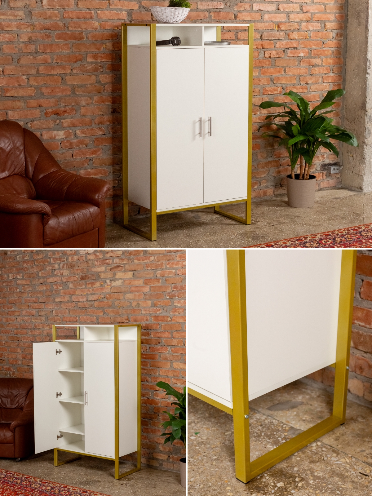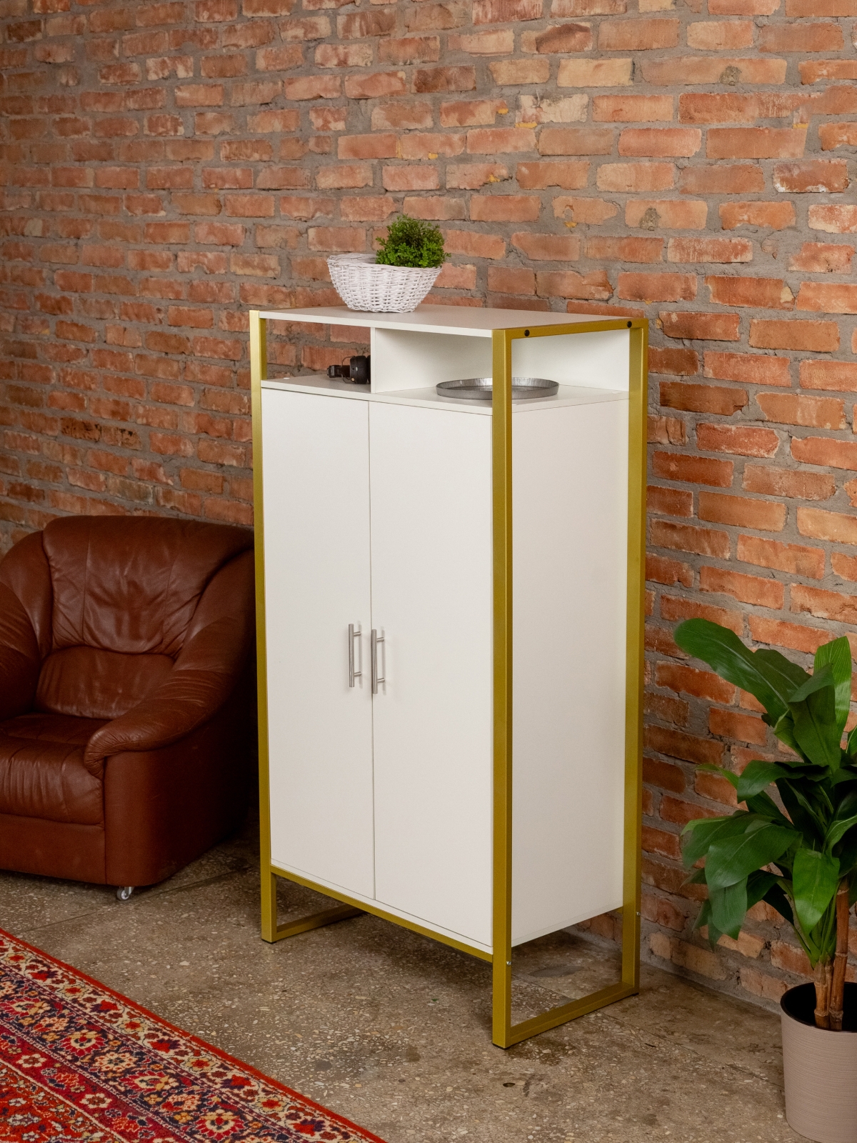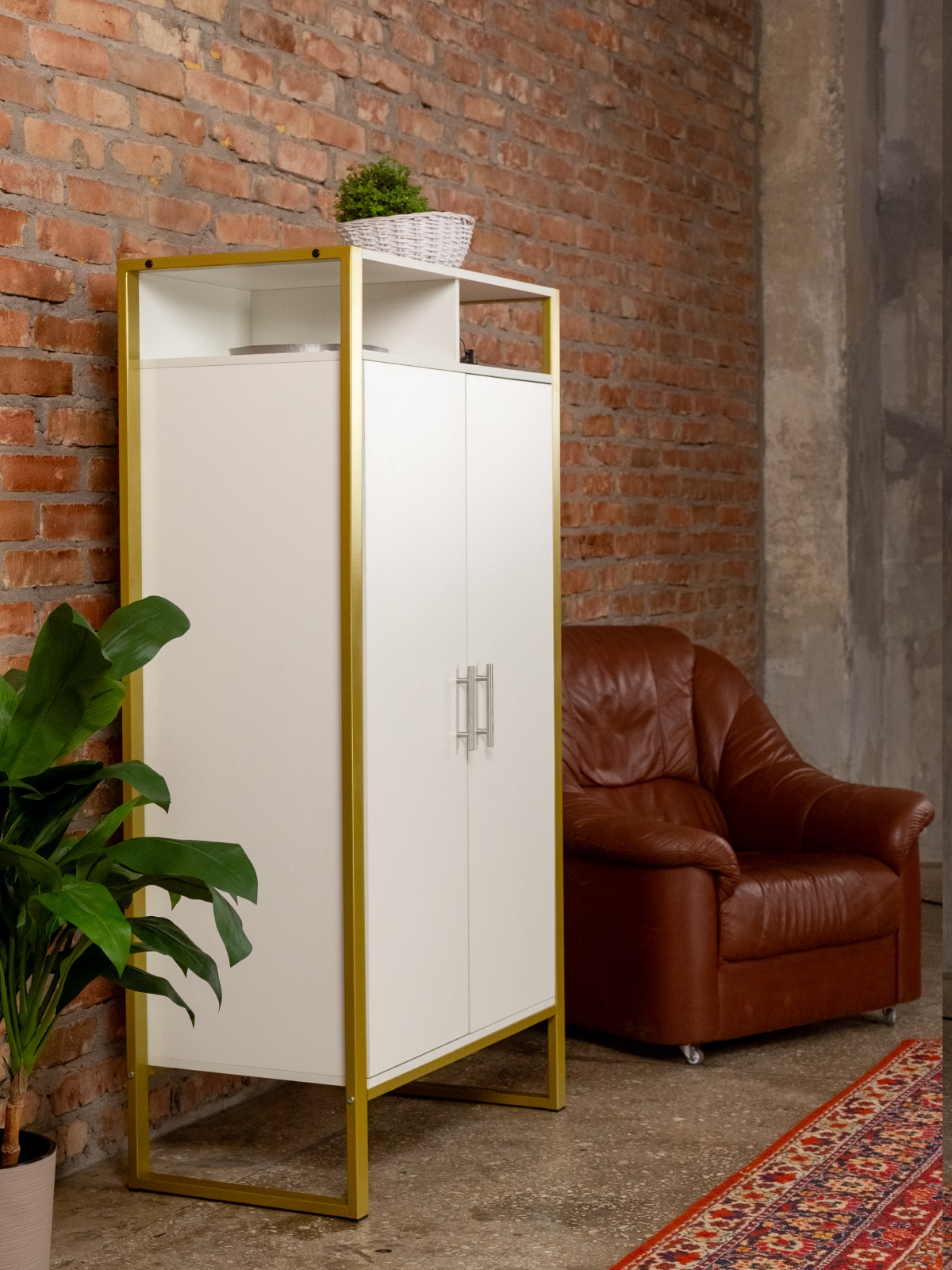 Функциональный и эргономичный шкафчик легко адаптируется под потребности помещения. Разумная организация пространства позволяет легко находить нужные вещи, поддерживать порядок и дополнять интерьер элементами декора. Золотой цвет каркаса делает акцент на стиле glam-лофт, а слияние брутального лофта с гламурными элементами добавляет изысканности любому интерьеру.
