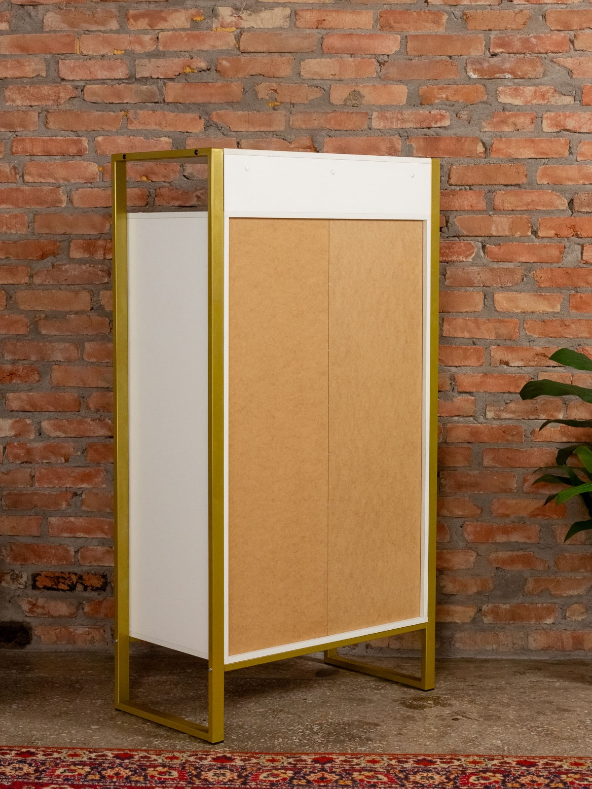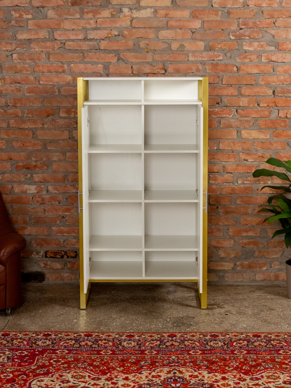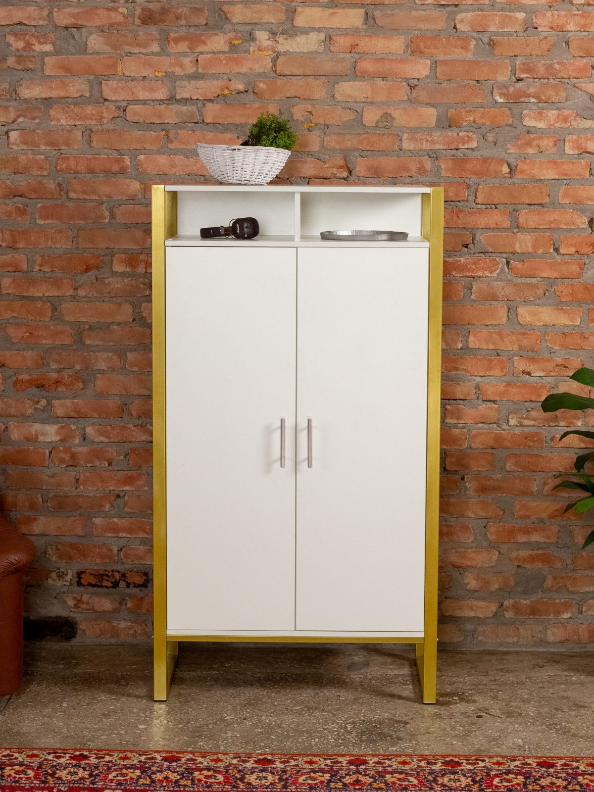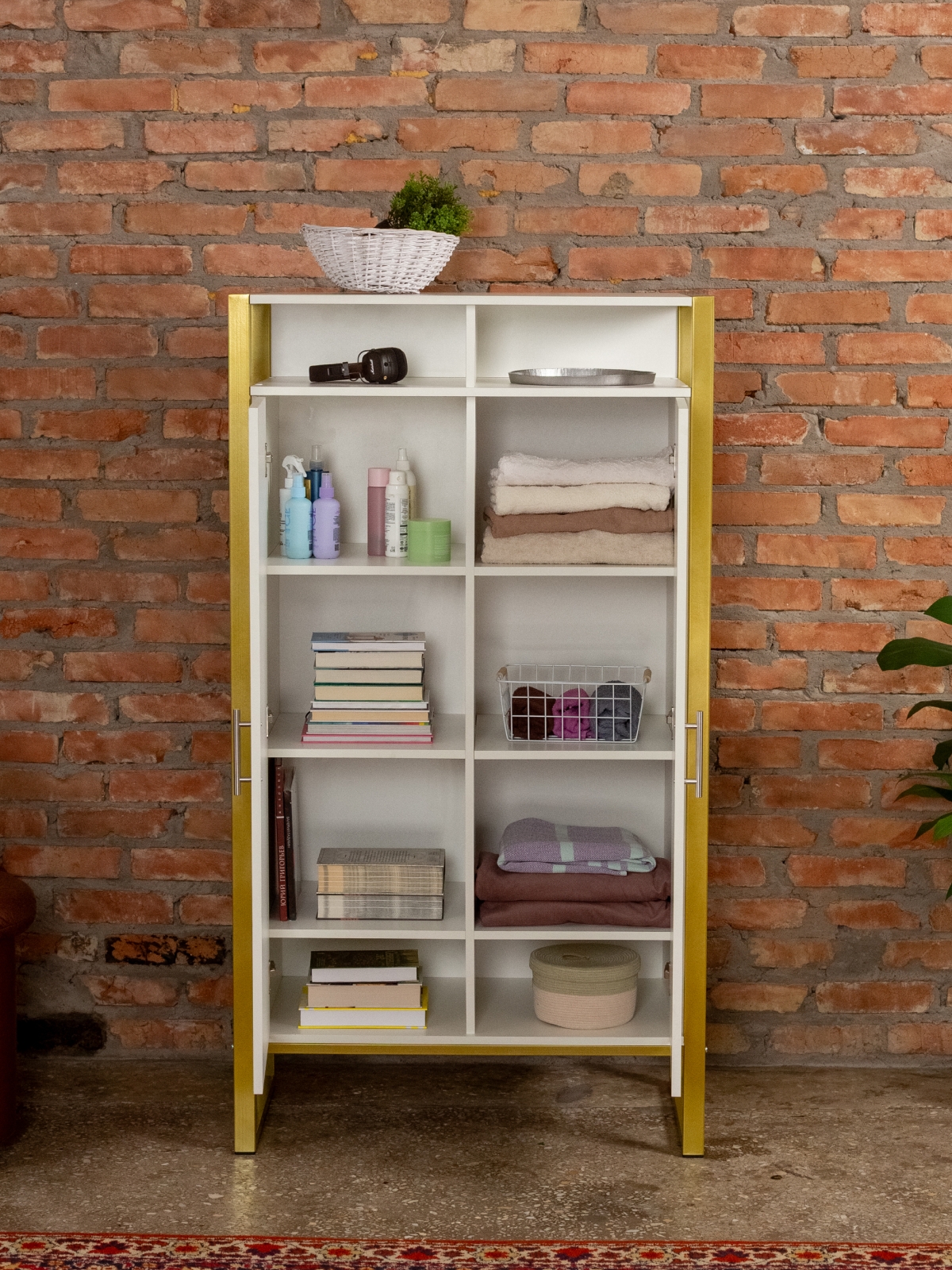 Функциональный и эргономичный шкафчик легко адаптируется под потребности помещения. Разумная организация пространства позволяет легко находить нужные вещи, поддерживать порядок и дополнять интерьер элементами декора. Золотой цвет каркаса делает акцент на стиле glam-лофт, а слияние брутального лофта с гламурными элементами добавляет изысканности любому интерьеру.