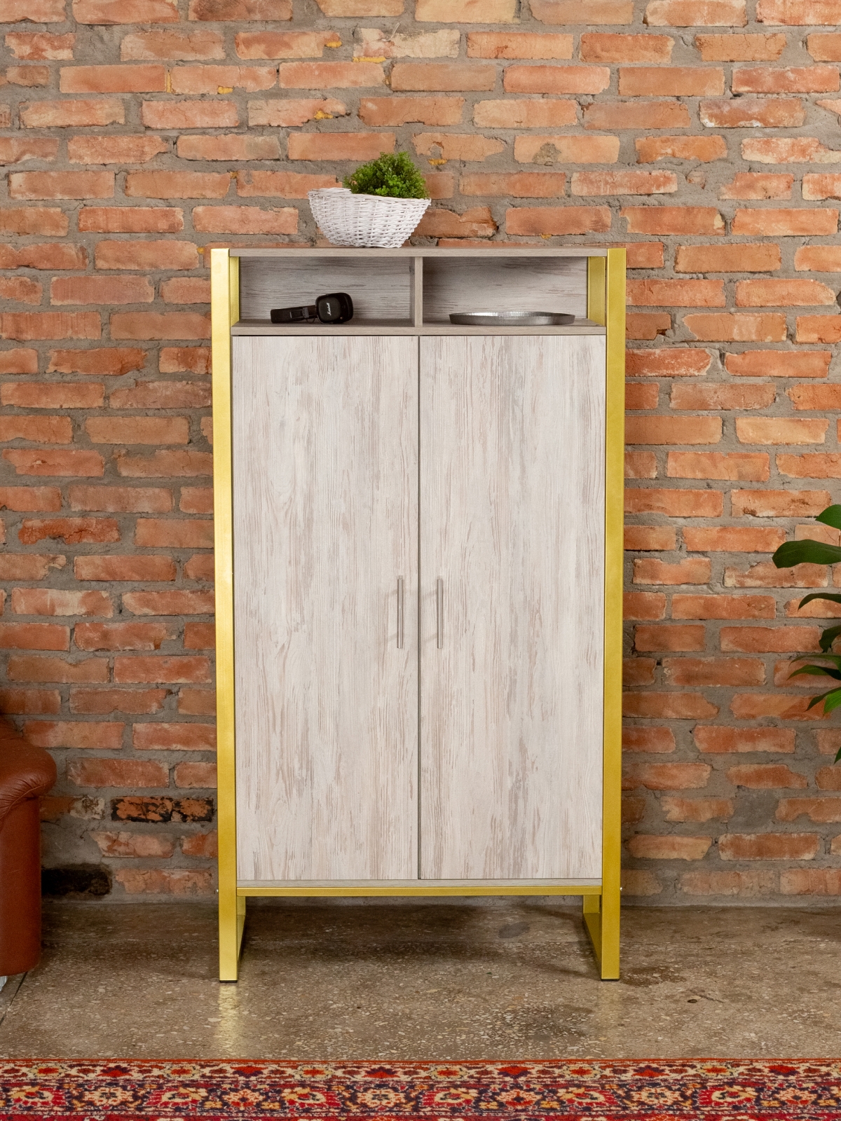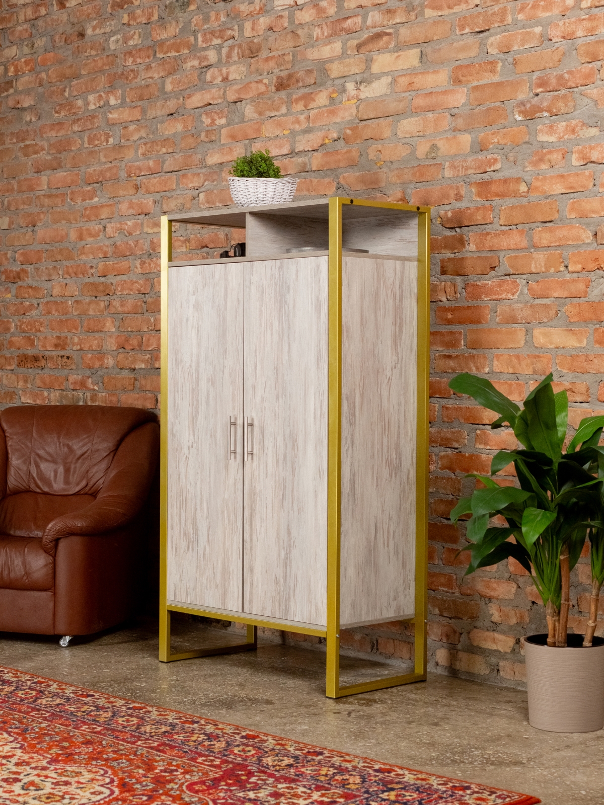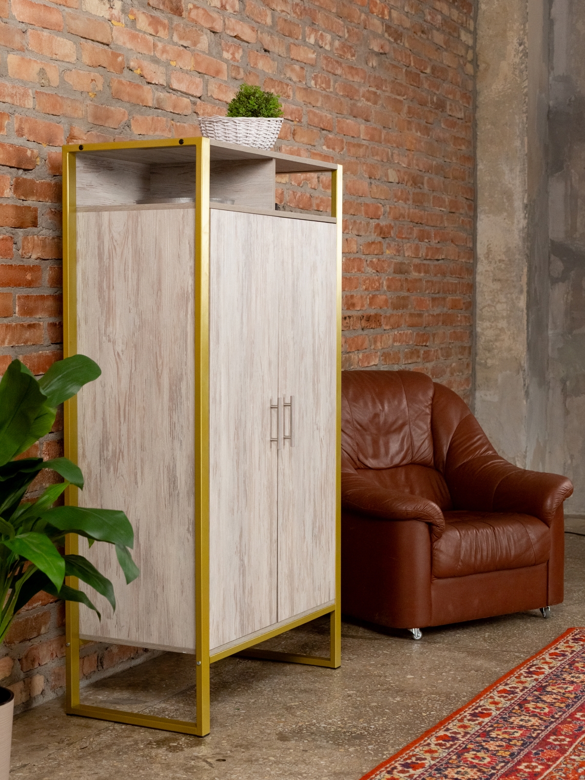Функциональный и эргономичный шкафчик легко адаптируется под потребности помещения. Разумная организация пространства позволяет легко находить нужные вещи, поддерживать порядок и дополнять интерьер элементами декора. Золотой цвет каркаса делает акцент на стиле glam-лофт, а слияние брутального лофта с гламурными элементами добавляет изысканности любому интерьеру.