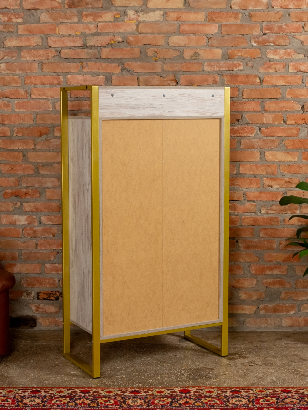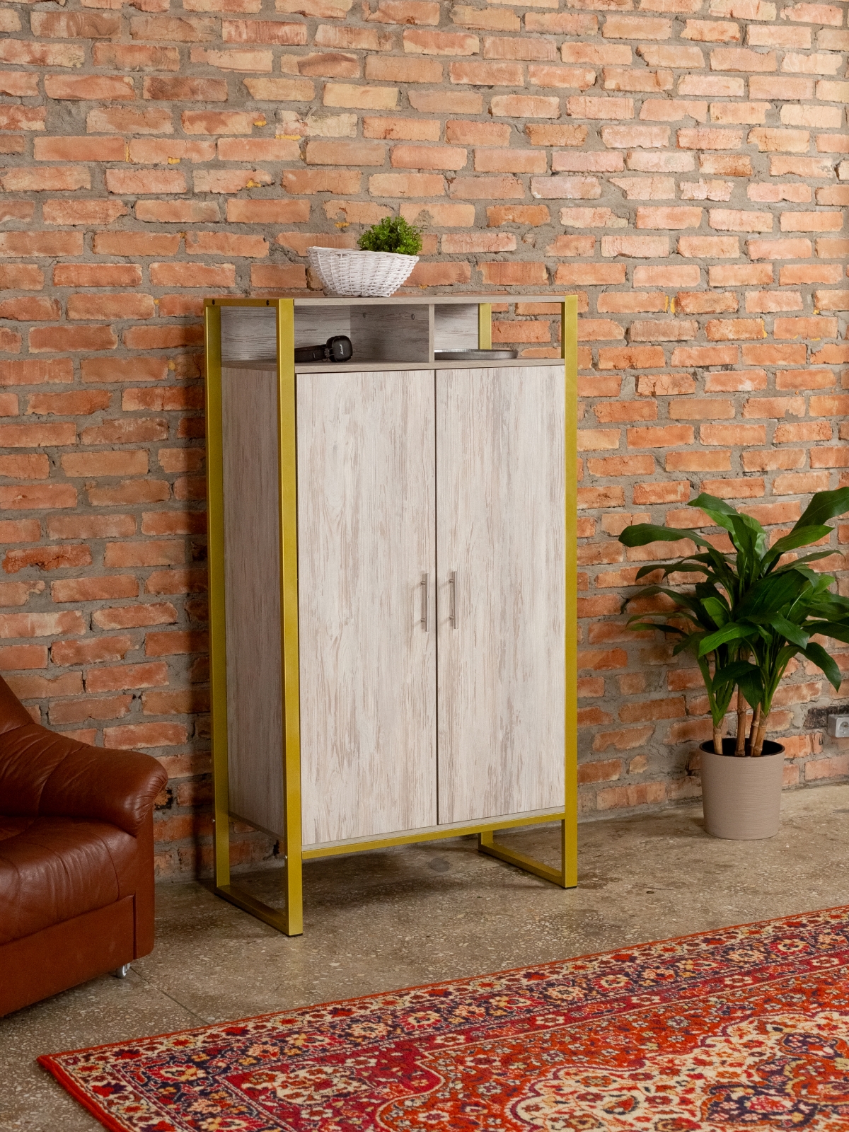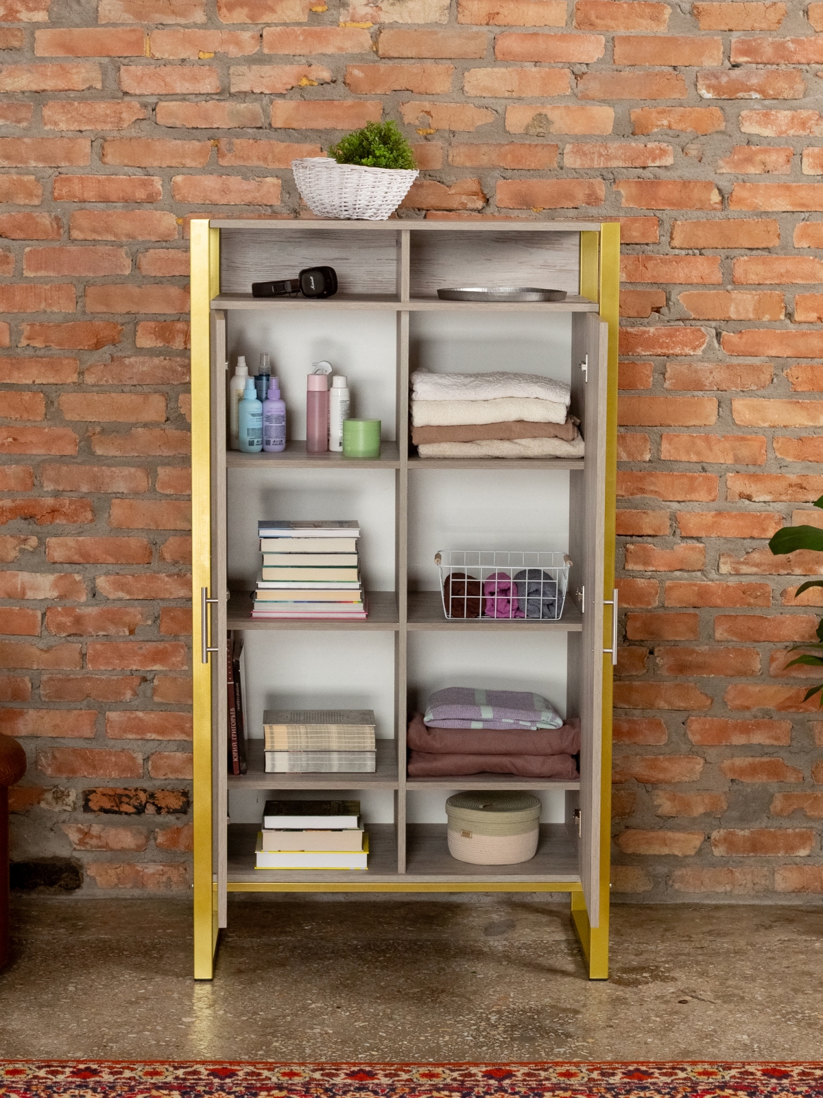 Функциональный и эргономичный шкафчик легко адаптируется под потребности помещения. Разумная организация пространства позволяет легко находить нужные вещи, поддерживать порядок и дополнять интерьер элементами декора. Золотой цвет каркаса делает акцент на стиле glam-лофт, а слияние брутального лофта с гламурными элементами добавляет изысканности любому интерьеру.
