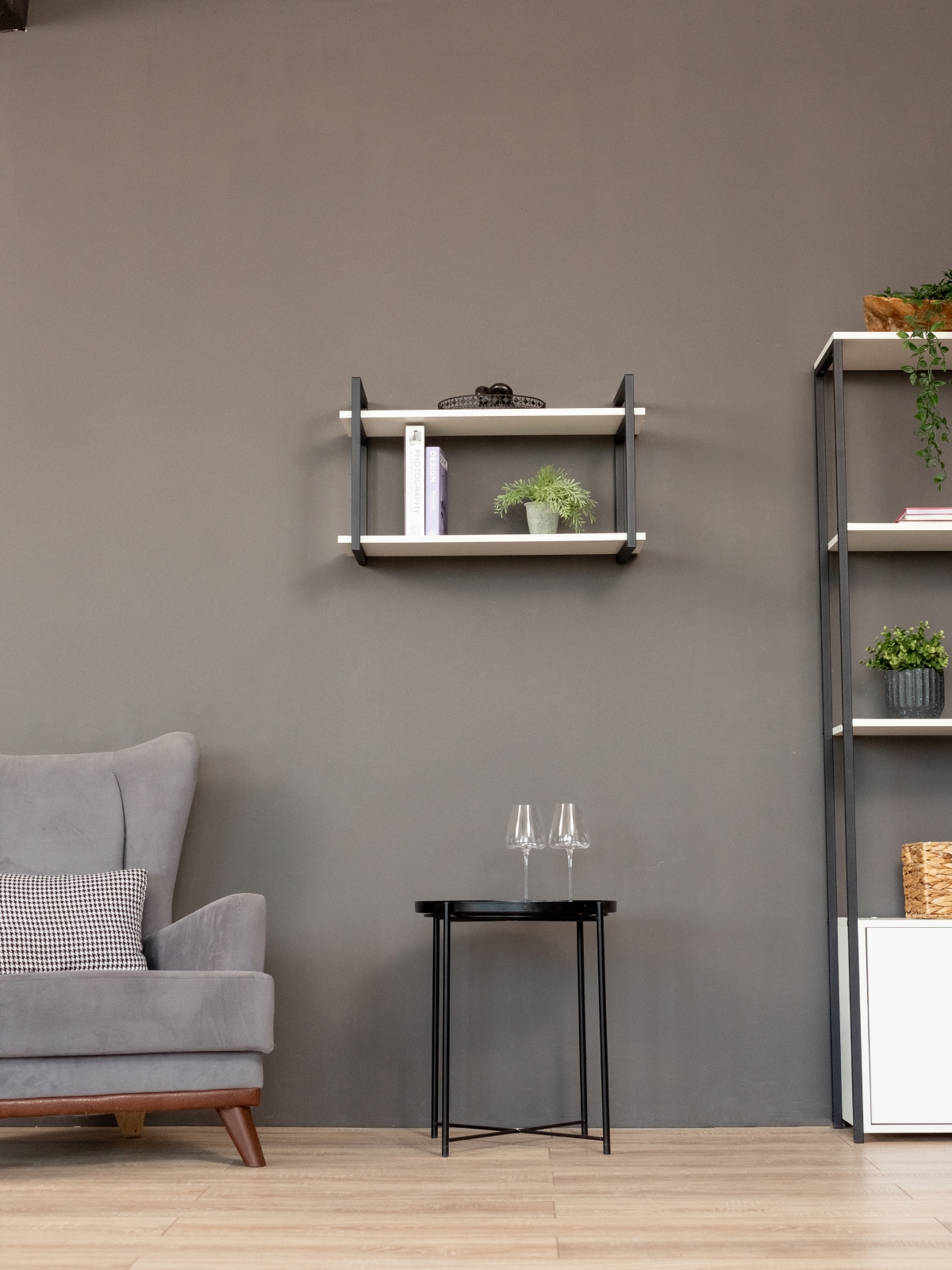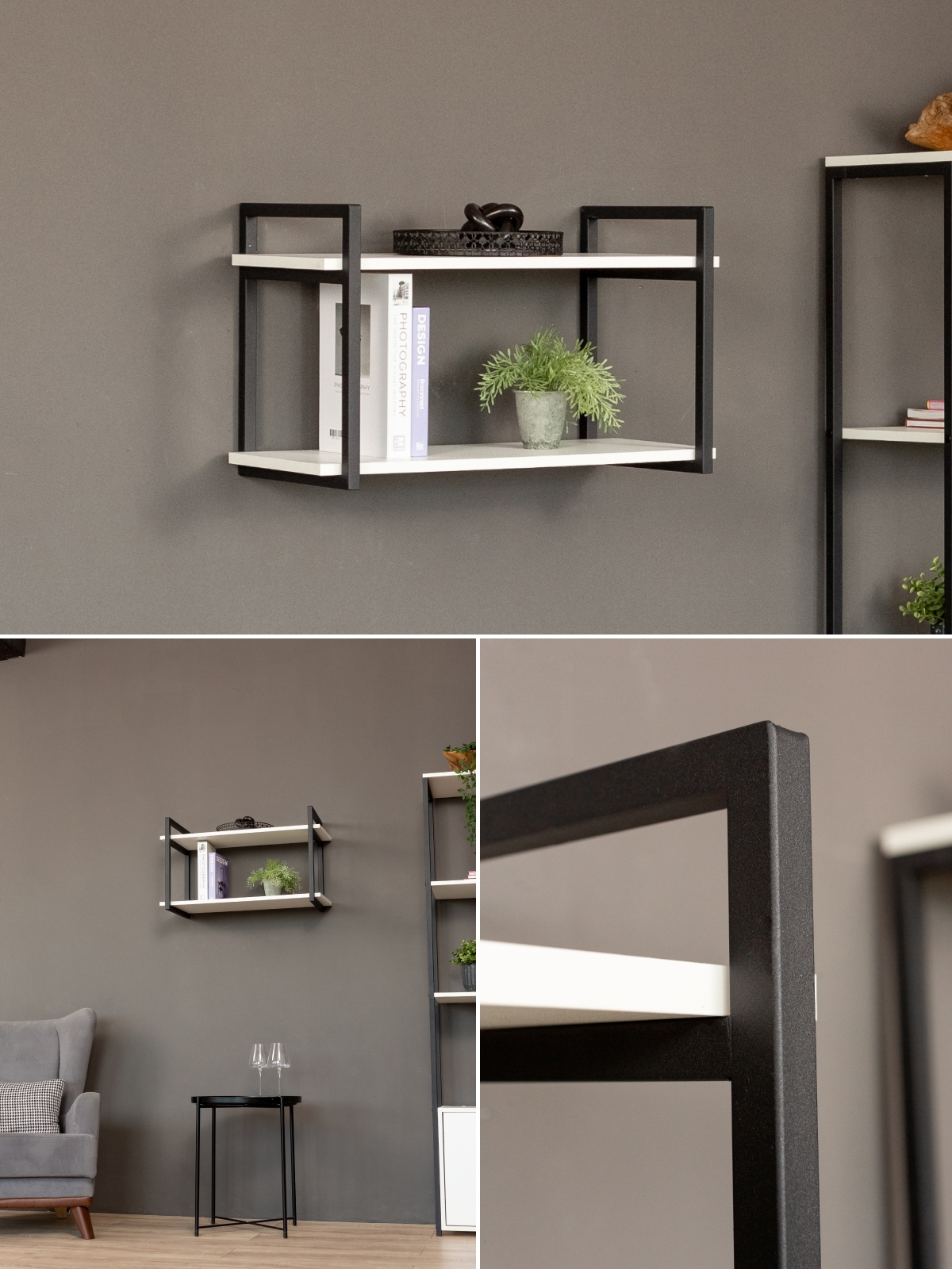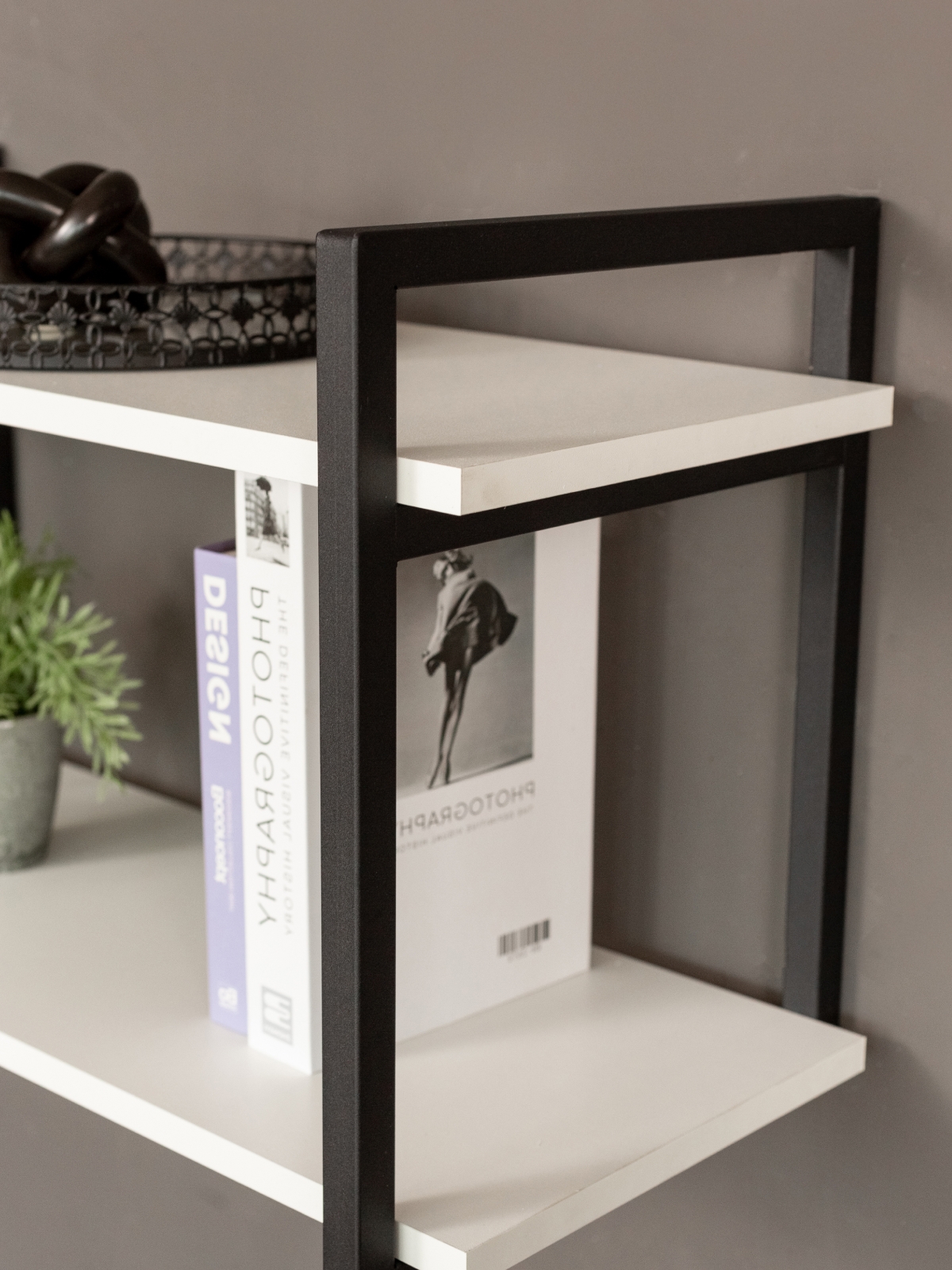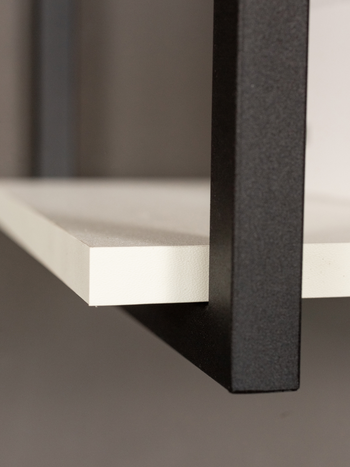 Каркас из металла окрашен качественной порошковой краской в глубокий черный цвет — универсальное решение для современных интерьеров. Краска ложится равномерно, без потеков. Черный металл в сочетании с древесными оттенками придает конструкции эффектную графичность. Полки выполнены из ЛДСП с имитацией натуральной древесины в актуальных оттенках. Они гармонируют с деревянными столешницами, мебелью в нейтральных тонах.