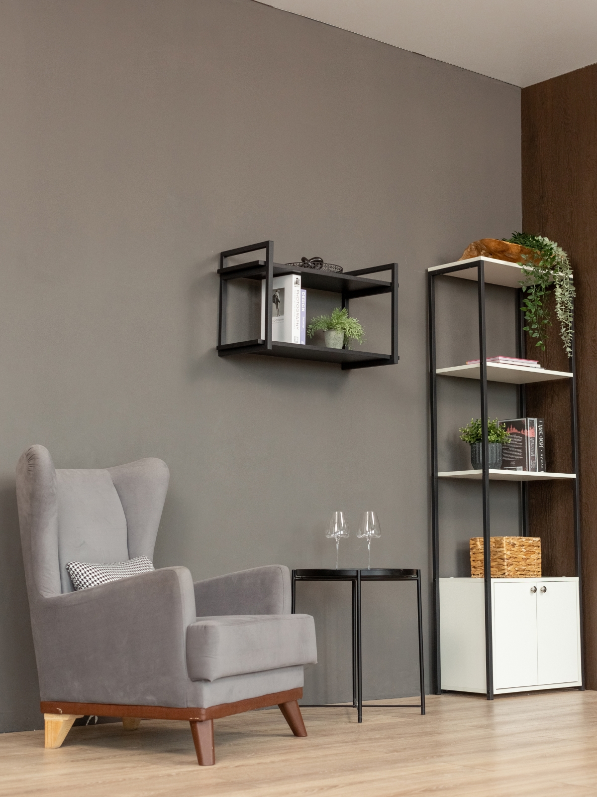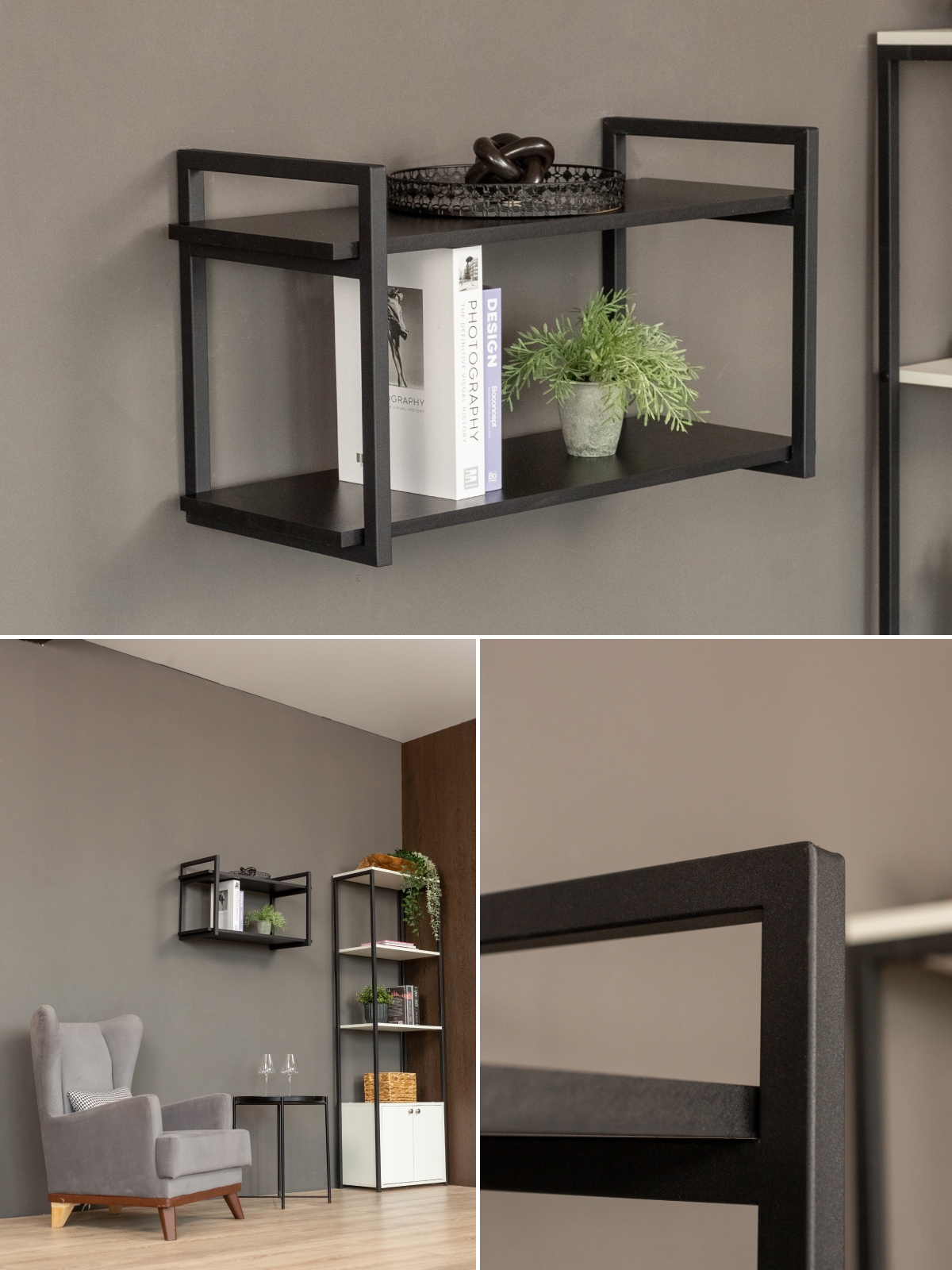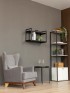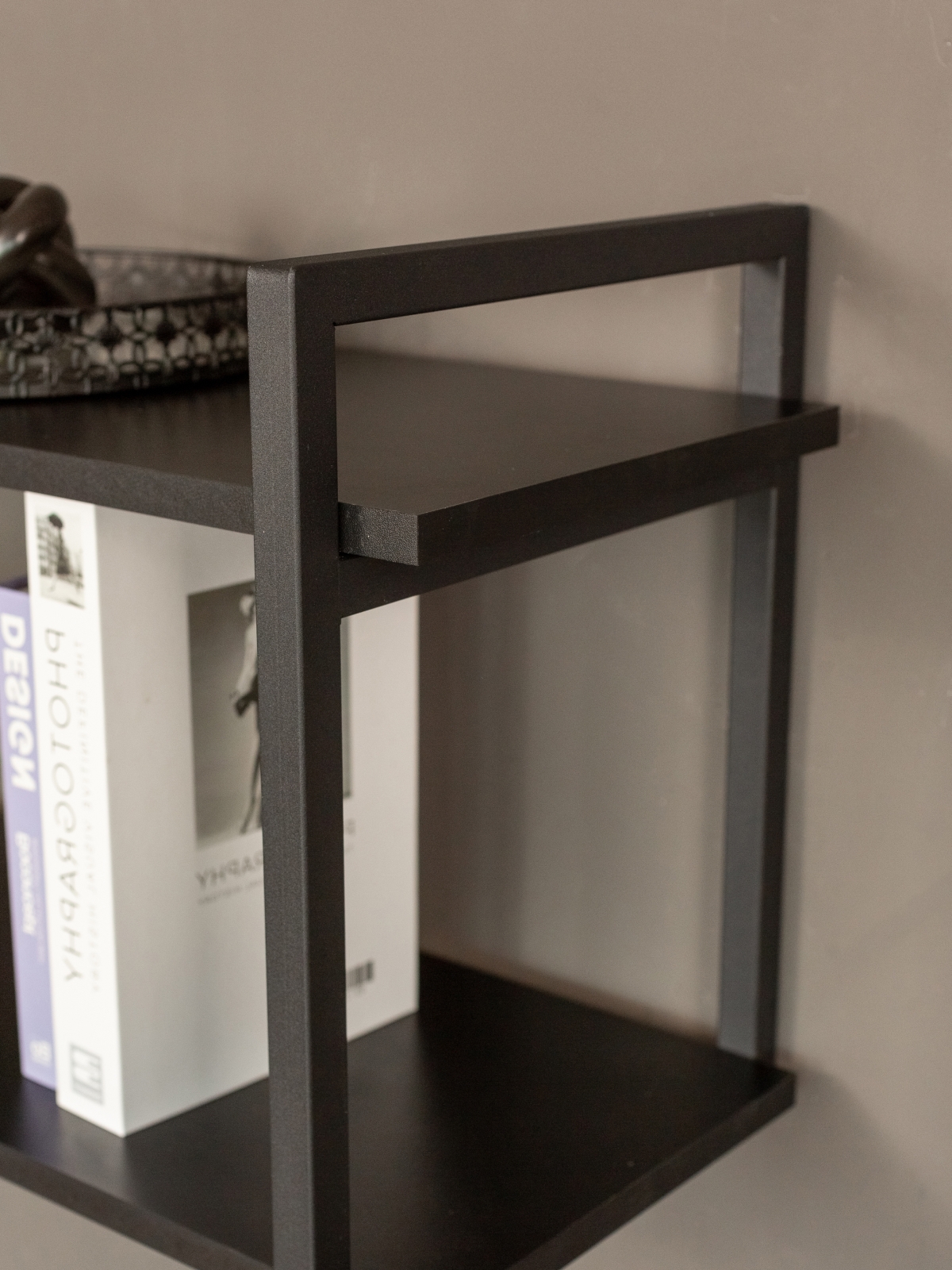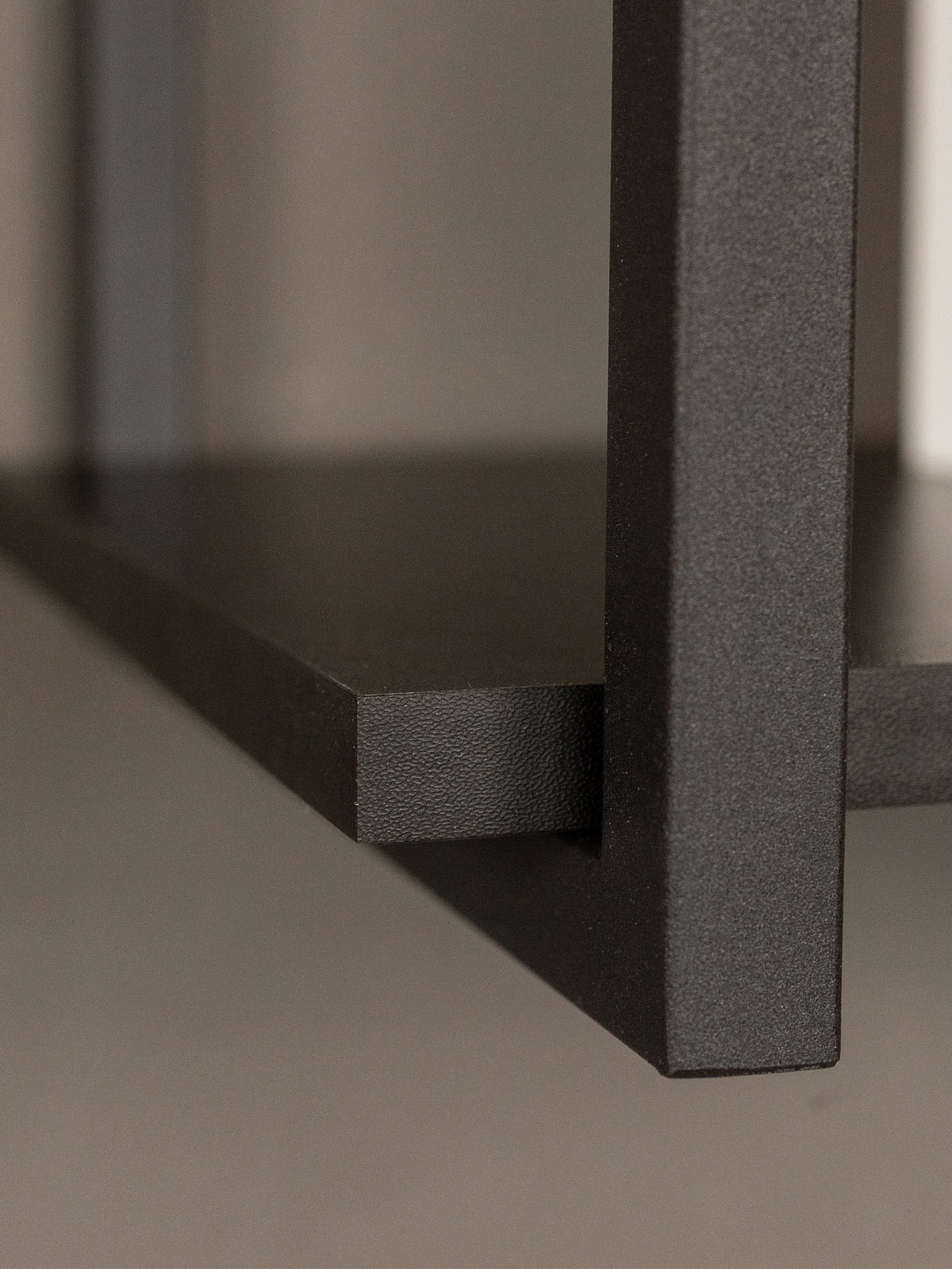 Каркас из металла окрашен качественной порошковой краской в глубокий черный цвет — универсальное решение для современных интерьеров. Краска ложится равномерно, без потеков. Черный металл в сочетании с древесными оттенками придает конструкции эффектную графичность. Полки выполнены из ЛДСП с имитацией натуральной древесины в актуальных оттенках. Они гармонируют с деревянными столешницами, мебелью в нейтральных тонах.