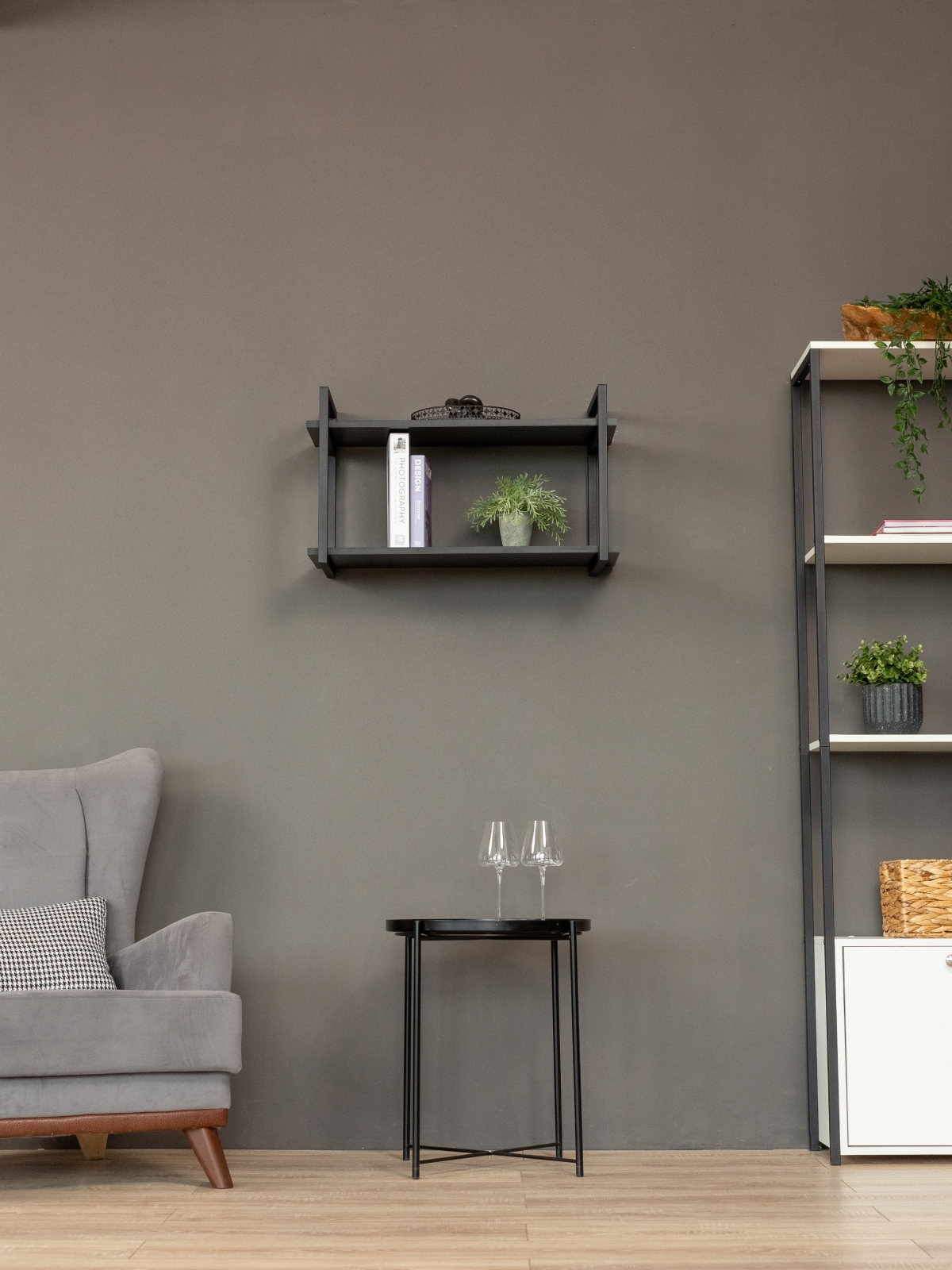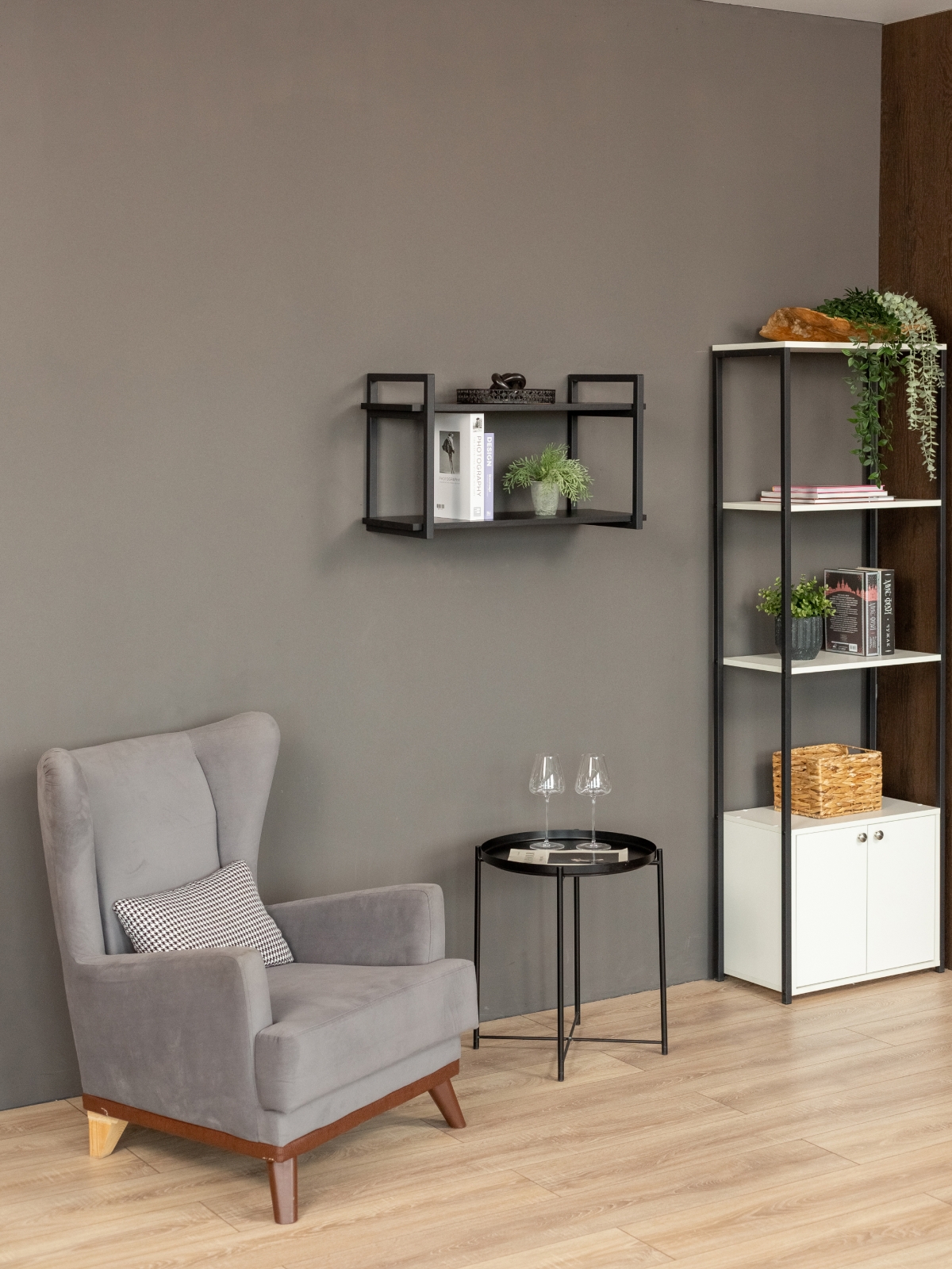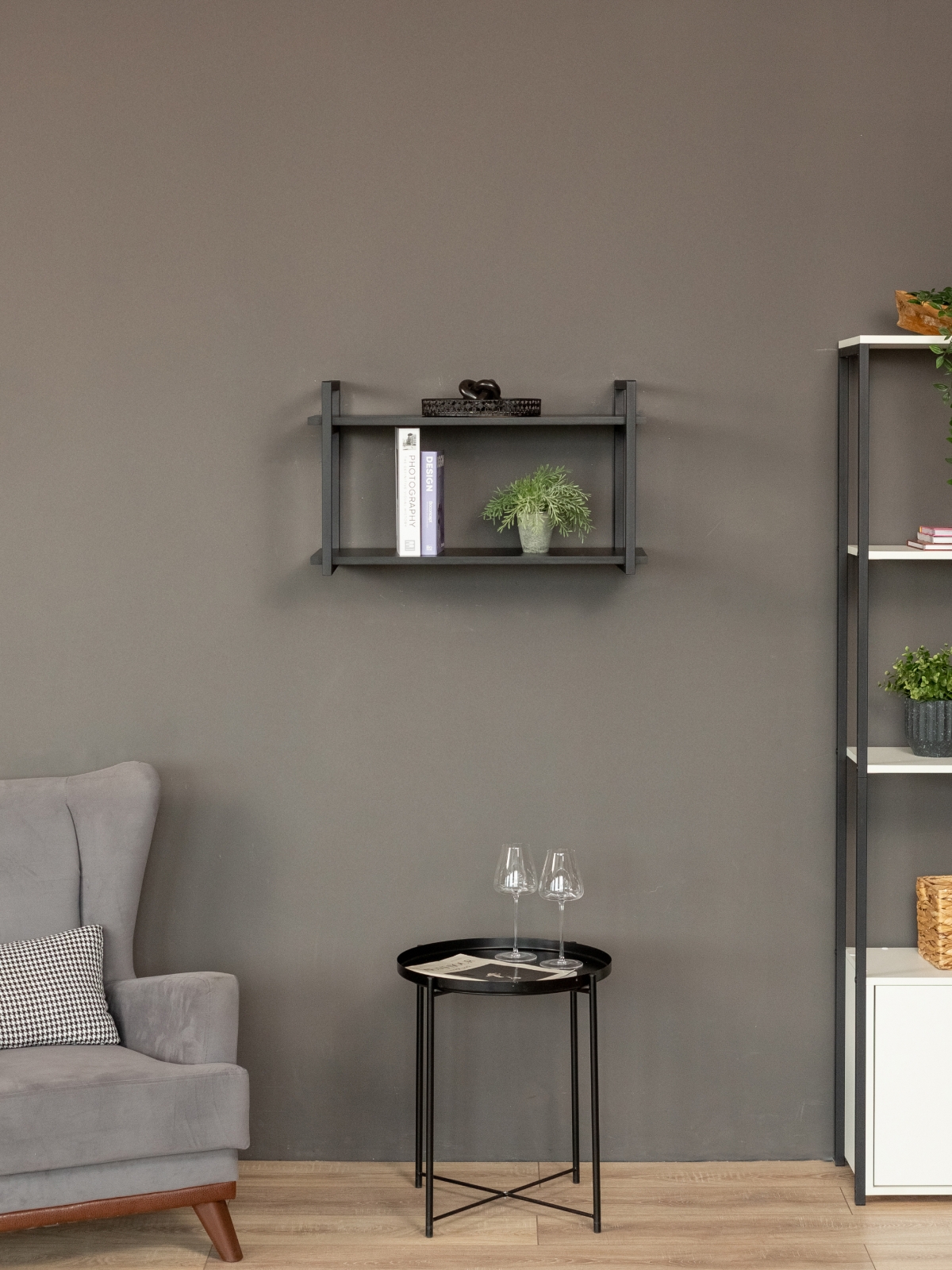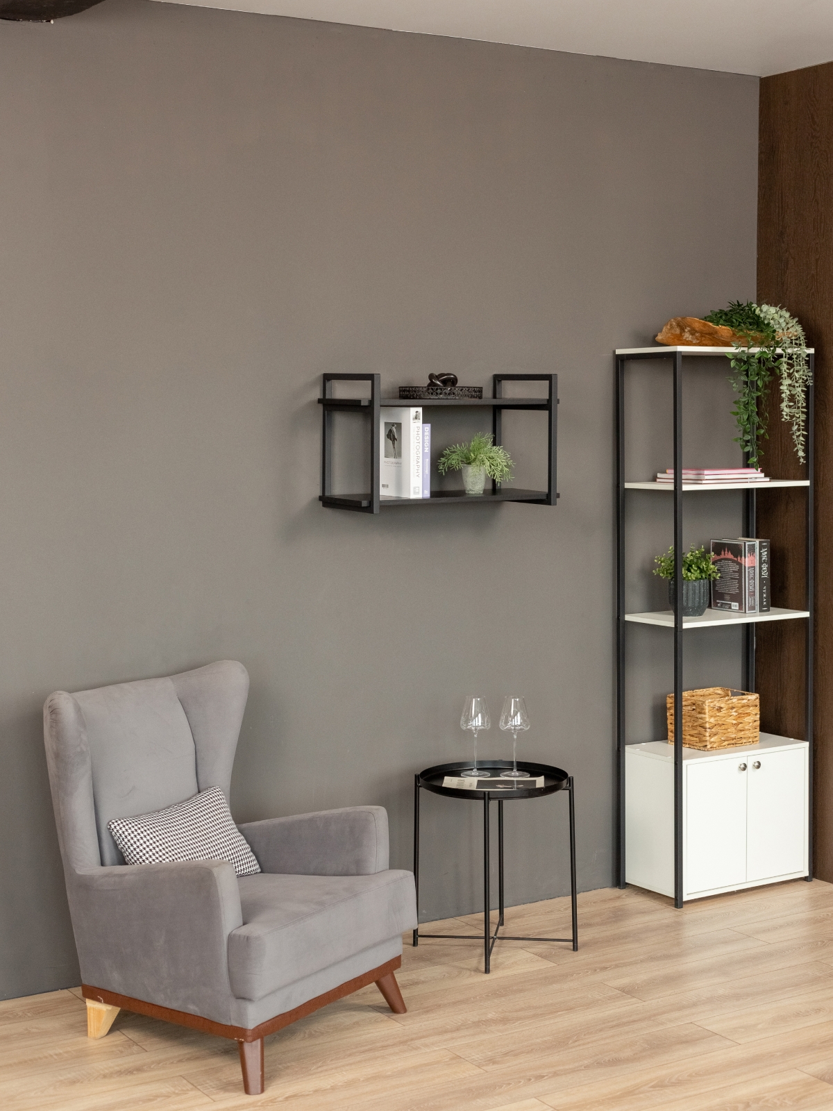 Каркас из металла окрашен качественной порошковой краской в глубокий черный цвет — универсальное решение для современных интерьеров. Краска ложится равномерно, без потеков. Черный металл в сочетании с древесными оттенками придает конструкции эффектную графичность. Полки выполнены из ЛДСП с имитацией натуральной древесины в актуальных оттенках. Они гармонируют с деревянными столешницами, мебелью в нейтральных тонах.