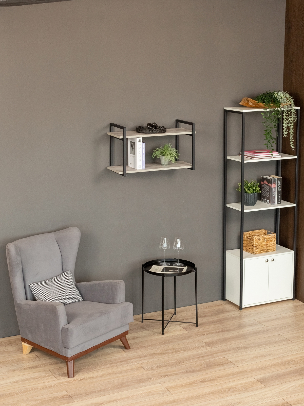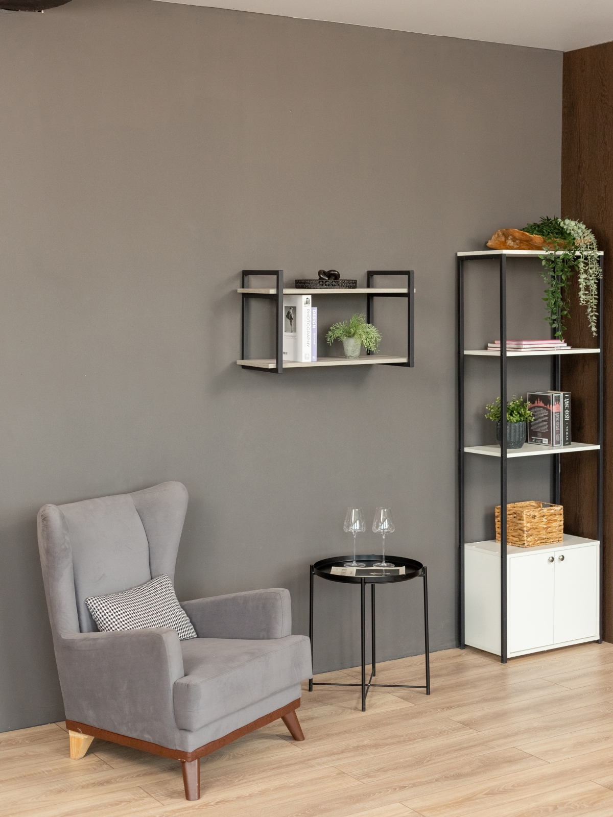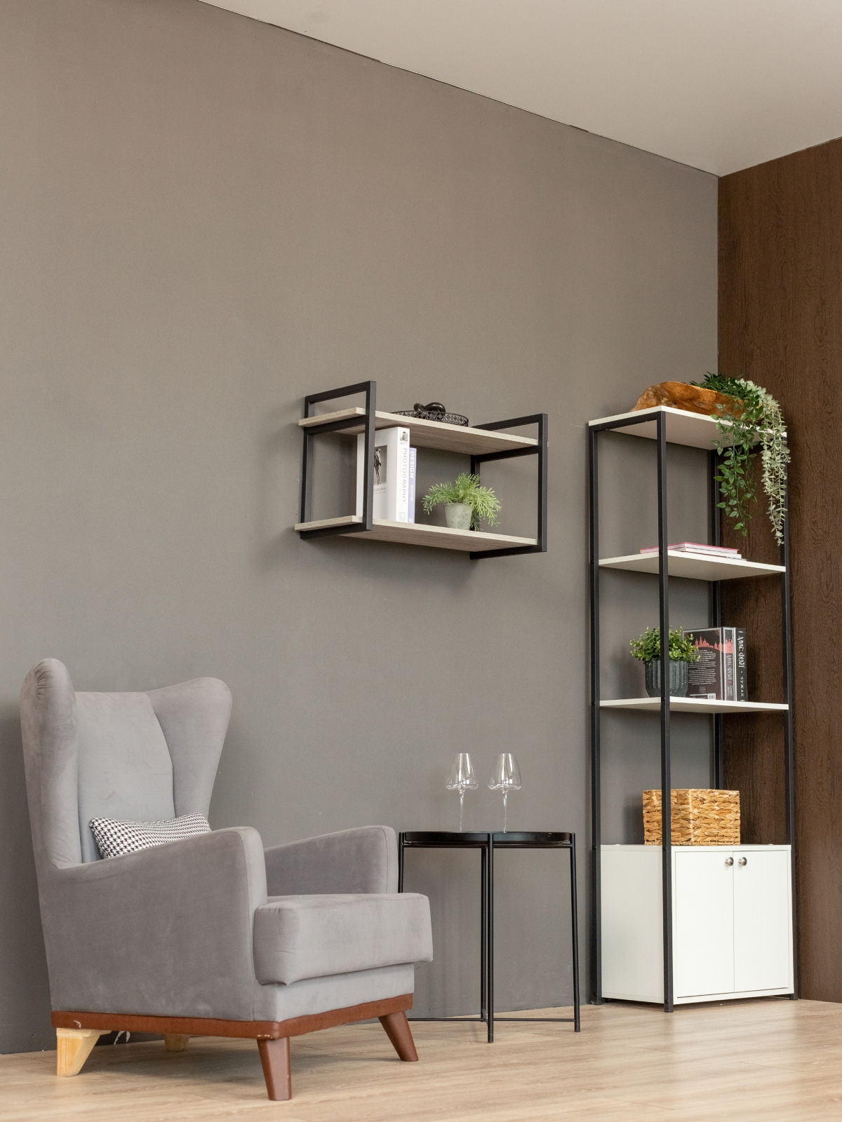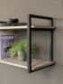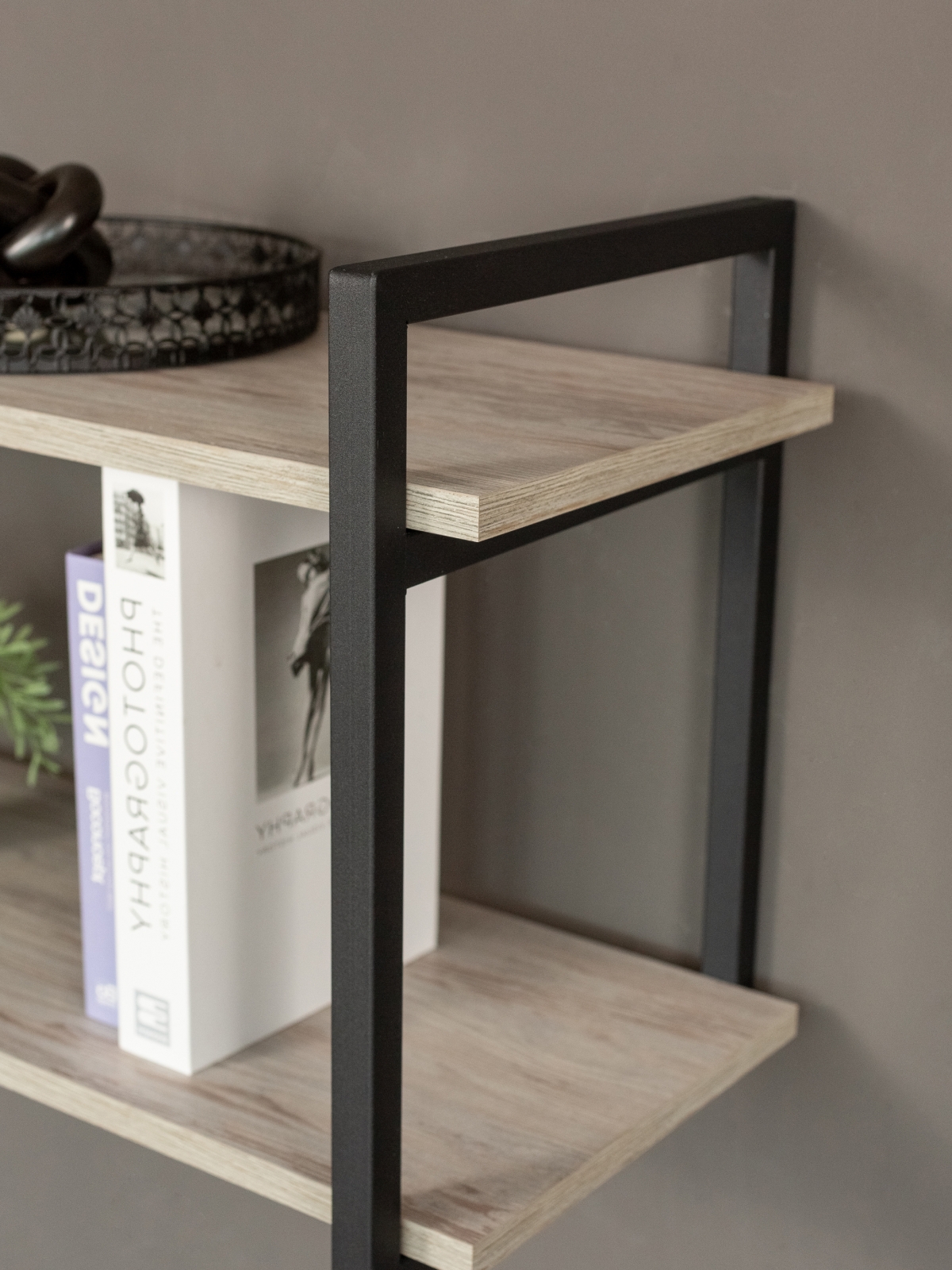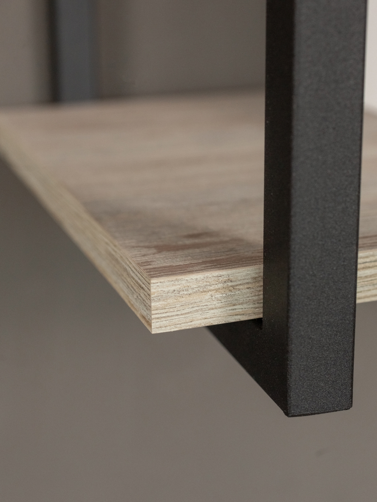 Каркас из металла окрашен качественной порошковой краской в глубокий черный цвет — универсальное решение для современных интерьеров. Краска ложится равномерно, без потеков. Черный металл в сочетании с древесными оттенками придает конструкции эффектную графичность. Полки выполнены из ЛДСП с имитацией натуральной древесины в актуальных оттенках. Они гармонируют с деревянными столешницами, мебелью в нейтральных тонах.