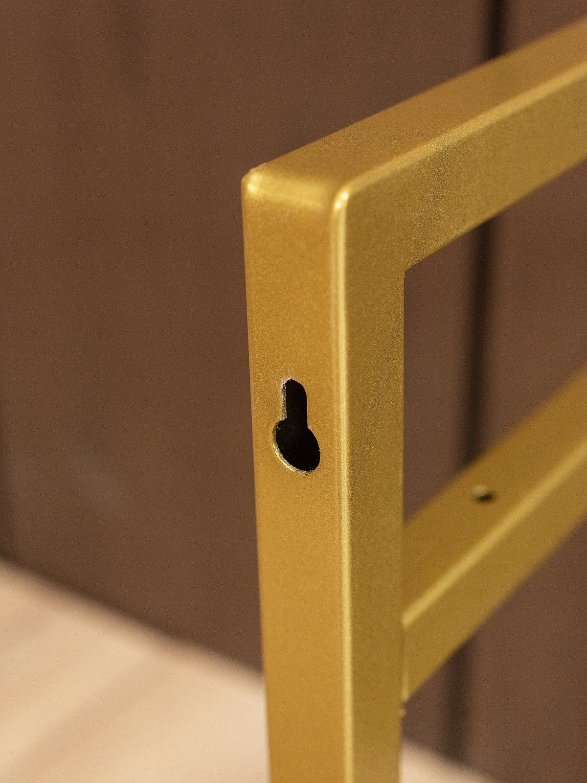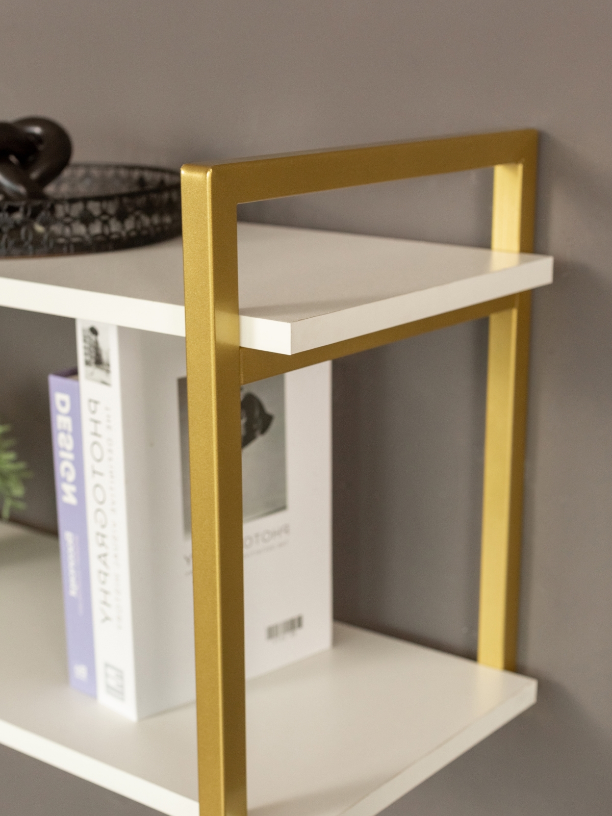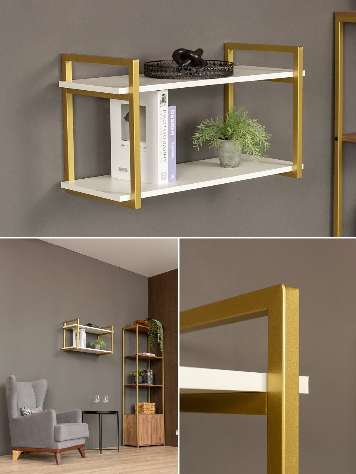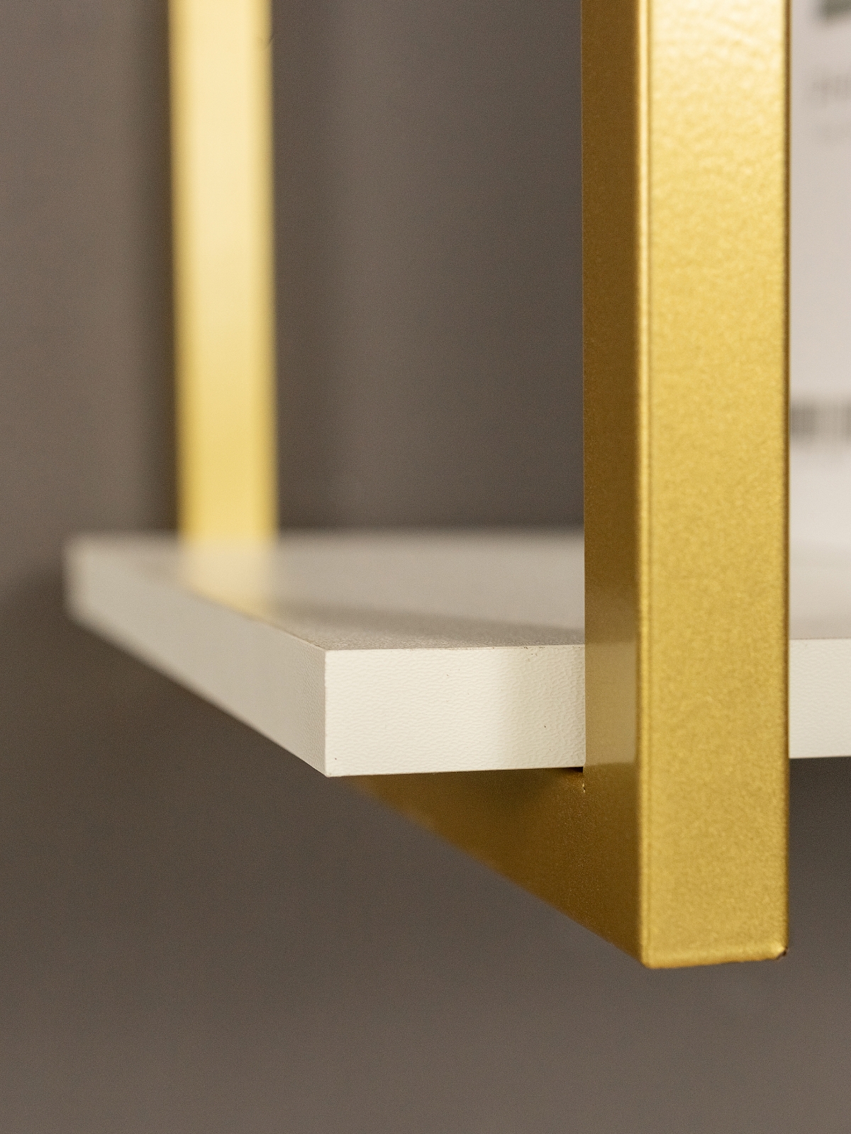 Порошковая окраска металла обеспечивает равномерное и долговечное покрытие без потеков. Золотой цвет каркаса делает «Онегу» особенно выразительной в интерьерах с элементами латунной фурнитуры, мраморными или зеркальными вставками. Полка органично впишется в интерьеры в стиле глэм-лофт, ар-деко и минимализм с элементами шика. Ее можно легко комбинировать с золотистыми или черными светильниками, бархатными акцентами или абстрактным настенным декором.