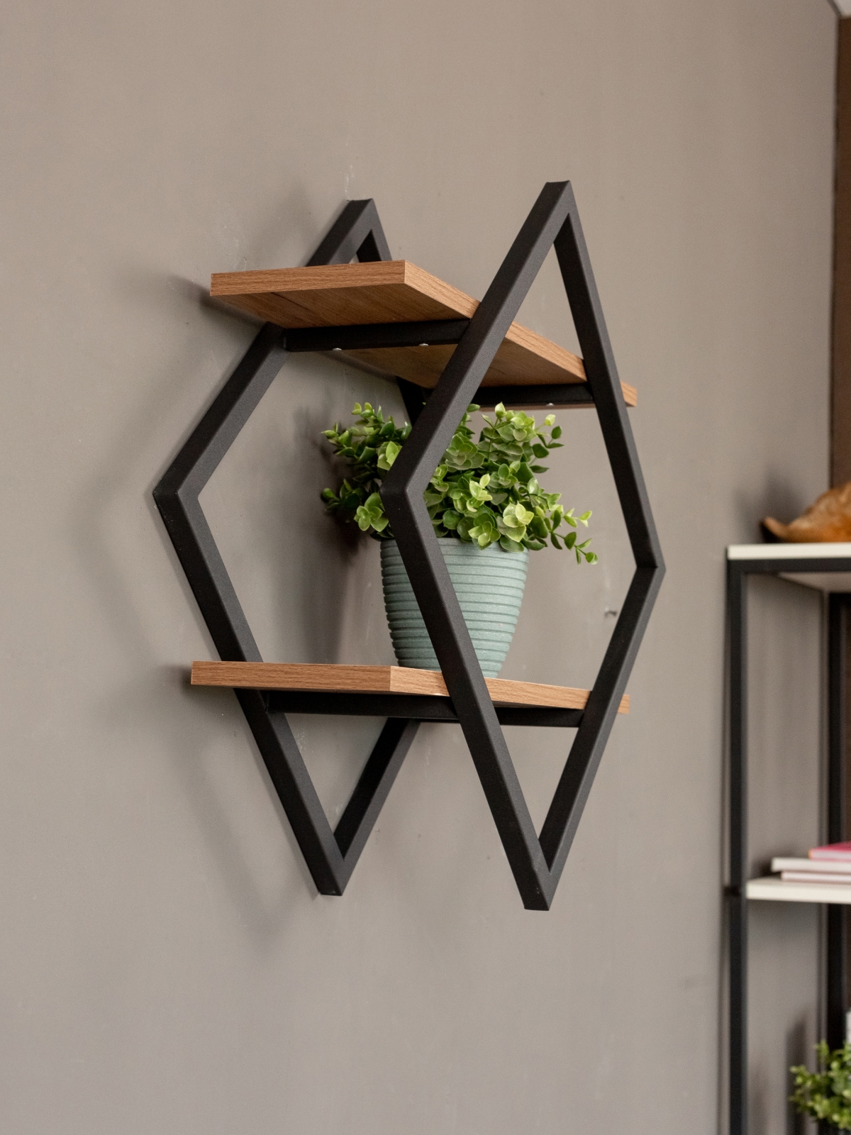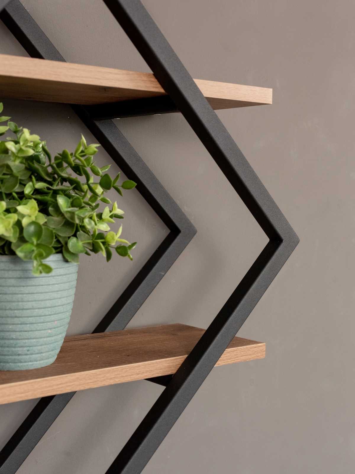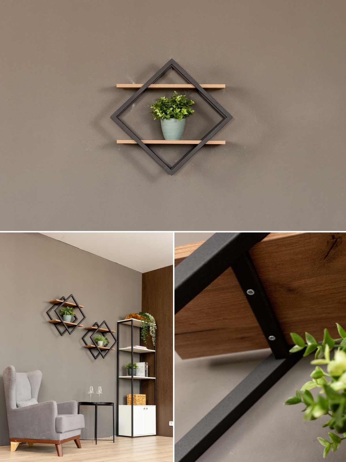 Настенная полка Вилен в оригинальной геометрической форме гармонично впишется в интерьеры в стилях лофт и минимализм, а также освежит обстановку. Она станет функциональным местом для хранения книг, предметов декора, папок с документами и разных мелочей. В гостиной и спальне настенная полка может быть основным интерьерным акцентом. Дополнить необычную ромбическую конструкцию можно сувенирами или фотографиями. Полка подойдет и для домашнего кабинета или библиотеки. Она станет интересной деталью и разбавит строгий стиль помещения. В прихожей на полке лофт можно разместить ключи, перчатки, шарфы и разные бытовые мелочи. Двухъярусная полка на стену позволяет оптимизировать пространство маленькой квартиры или квартиры-студии. Приглушенные монохромные оттенки изделия идеальны для интерьеров с минималистичными чертами. Металлический каркас покрыт порошковой краской. Такой метод окрашивания обеспечивает защиту металла от коррозии и равномерное черное покрытие. Прочные полки под цветы из ЛДСП в оттенках амаретто и кашемир повторяют цвет и текстуру натуральной древесины.