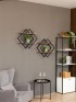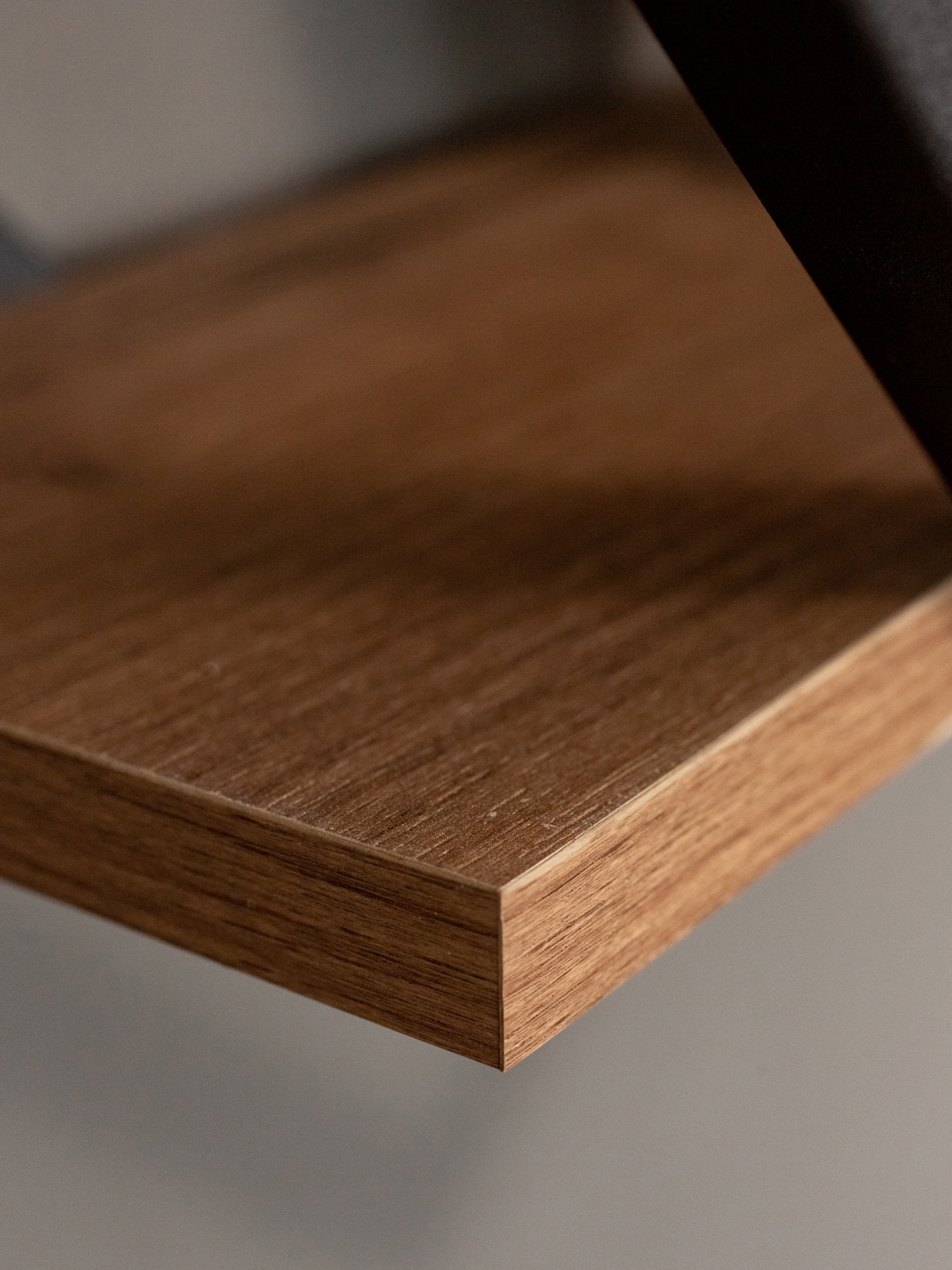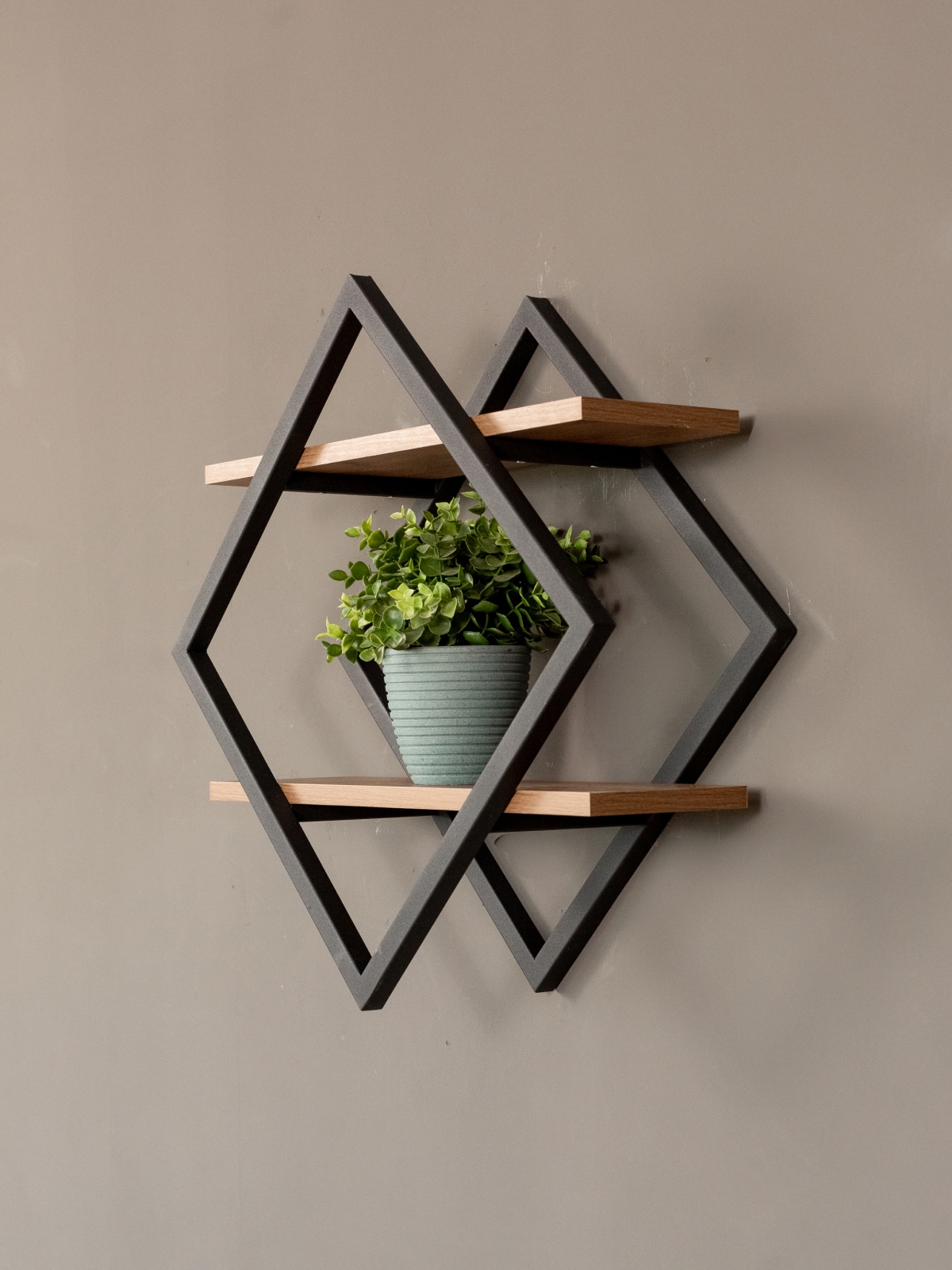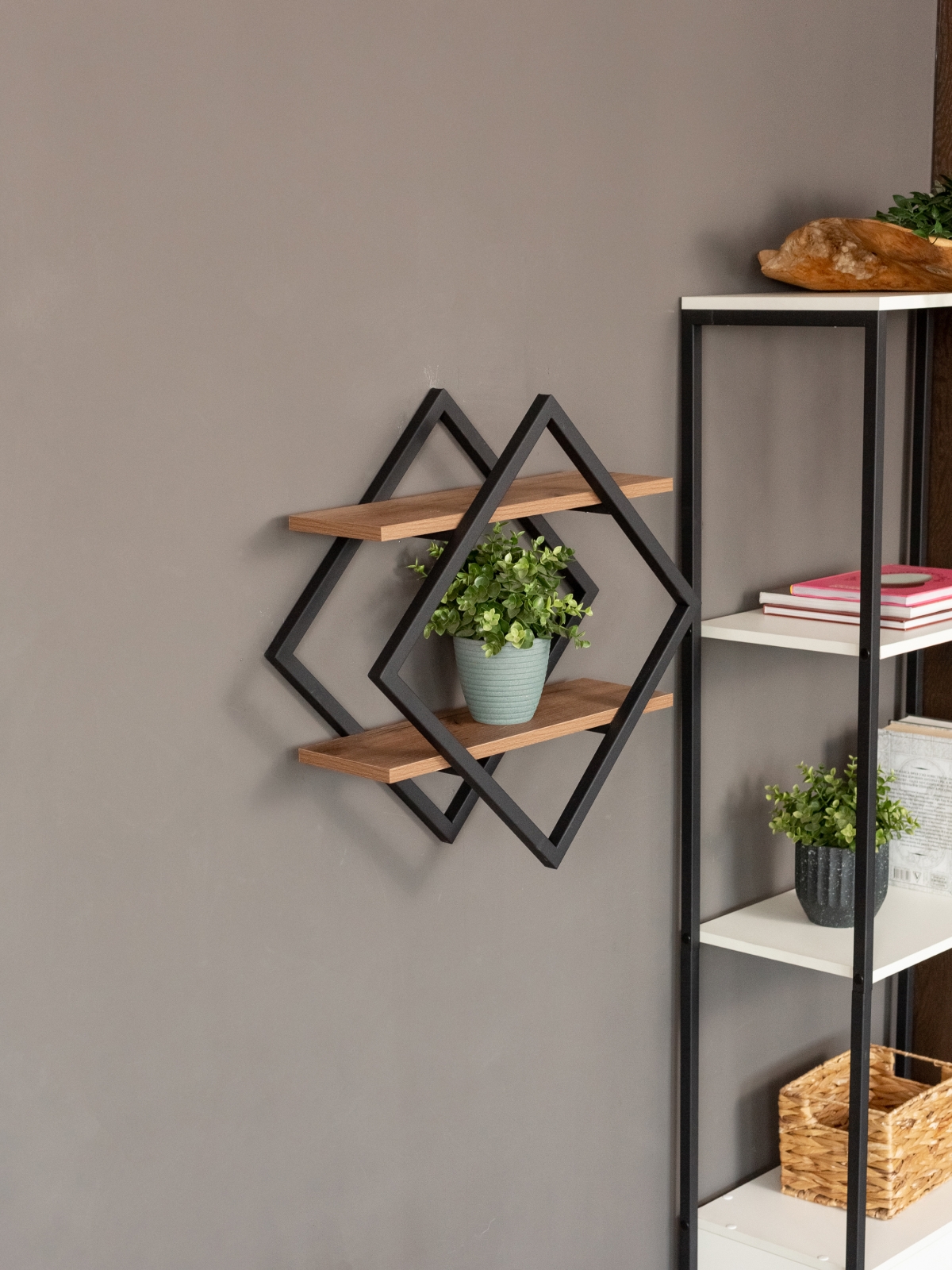 Настенная полка Вилен в оригинальной геометрической форме гармонично впишется в интерьеры в стилях лофт и минимализм, а также освежит обстановку. Она станет функциональным местом для хранения книг, предметов декора, папок с документами и разных мелочей. В гостиной и спальне настенная полка может быть основным интерьерным акцентом. Дополнить необычную ромбическую конструкцию можно сувенирами или фотографиями. Полка подойдет и для домашнего кабинета или библиотеки. Она станет интересной деталью и разбавит строгий стиль помещения. В прихожей на полке лофт можно разместить ключи, перчатки, шарфы и разные бытовые мелочи. Двухъярусная полка на стену позволяет оптимизировать пространство маленькой квартиры или квартиры-студии. Приглушенные монохромные оттенки изделия идеальны для интерьеров с минималистичными чертами. Металлический каркас покрыт порошковой краской. Такой метод окрашивания обеспечивает защиту металла от коррозии и равномерное черное покрытие. Прочные полки под цветы из ЛДСП в оттенках амаретто и кашемир повторяют цвет и текстуру натуральной древесины.