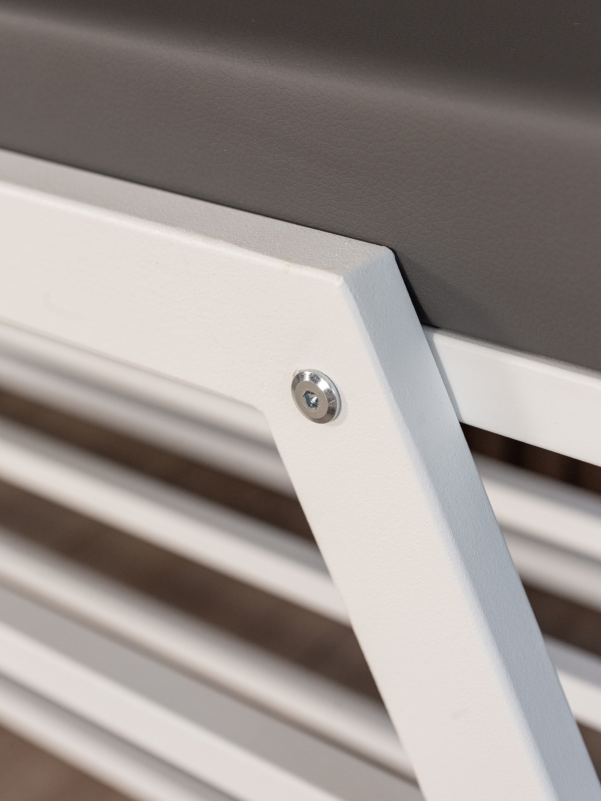 Каркас выполнен из прочного металла и окрашен полимерно-порошковой краской в чистый белый цвет. Это покрытие устойчиво к износу, не боится механических повреждений и сохраняет свежесть оттенка надолго. Белый металлический каркас — активная интерьерная деталь, подчеркивающая легкость и воздушность помещения. Изделие с таким каркасом отлично смотрится в интерьерах с преобладанием светлых тонов, помогает визуально расширить пространство и создает ощущение свежести и порядка.
