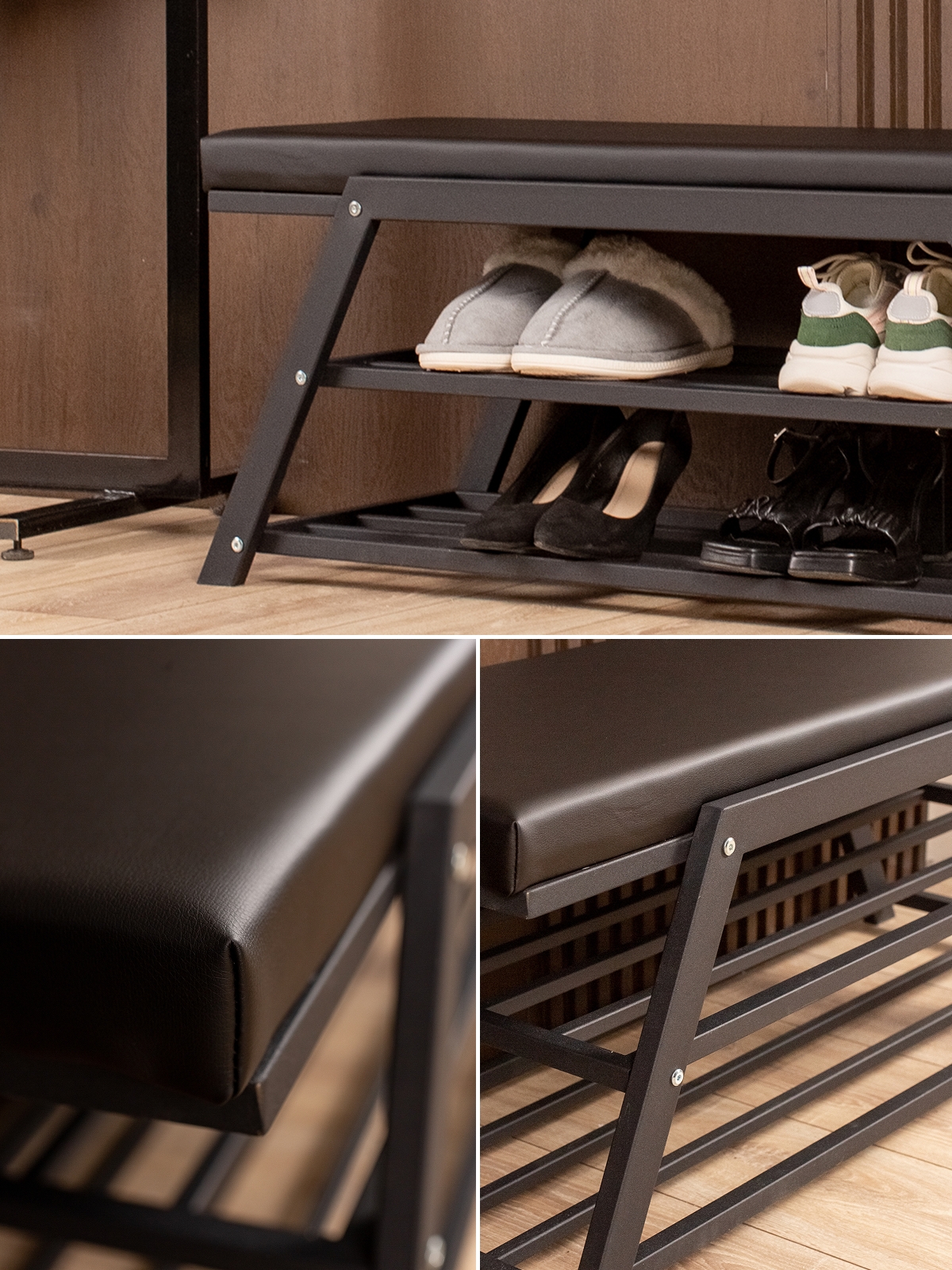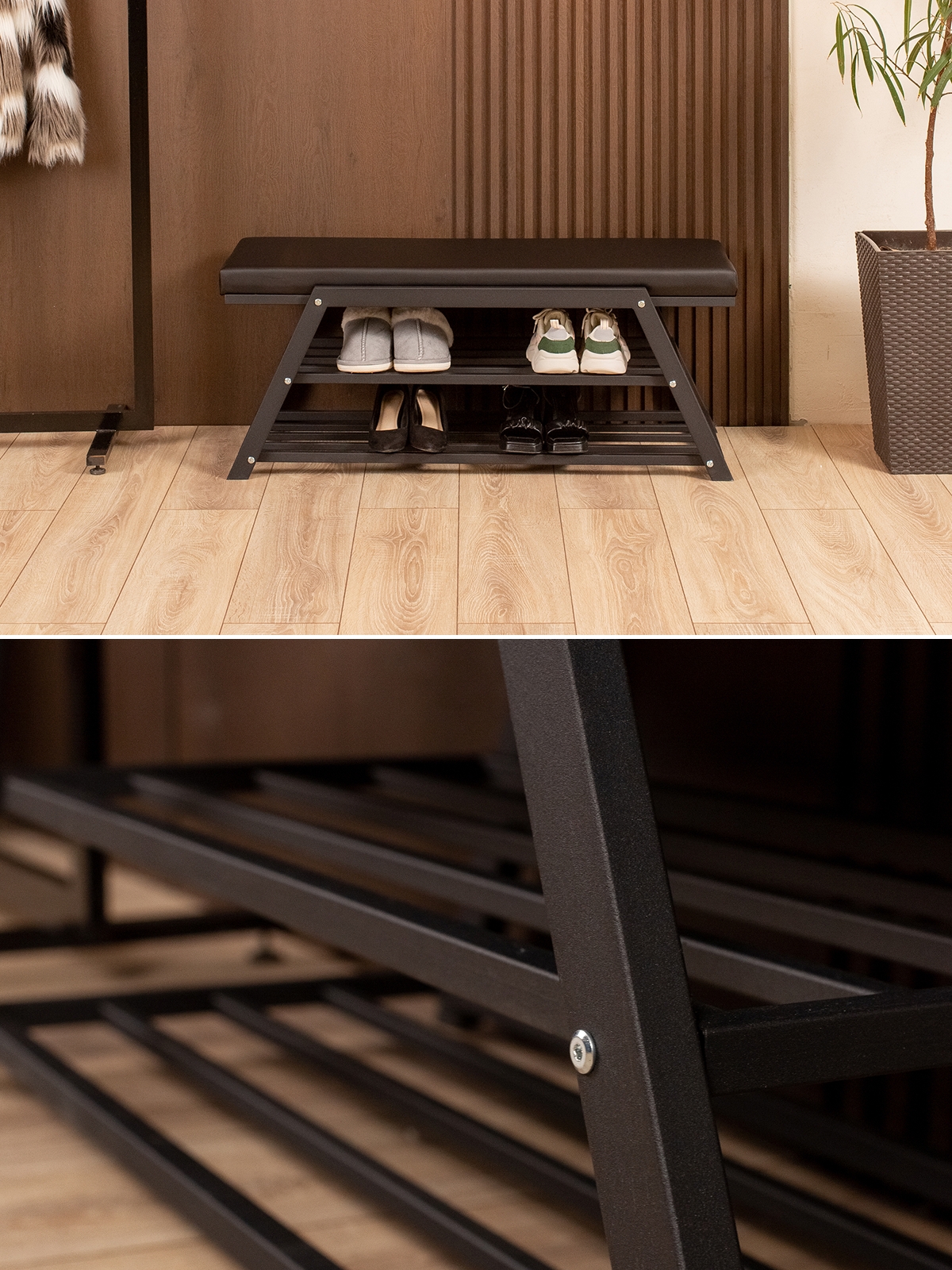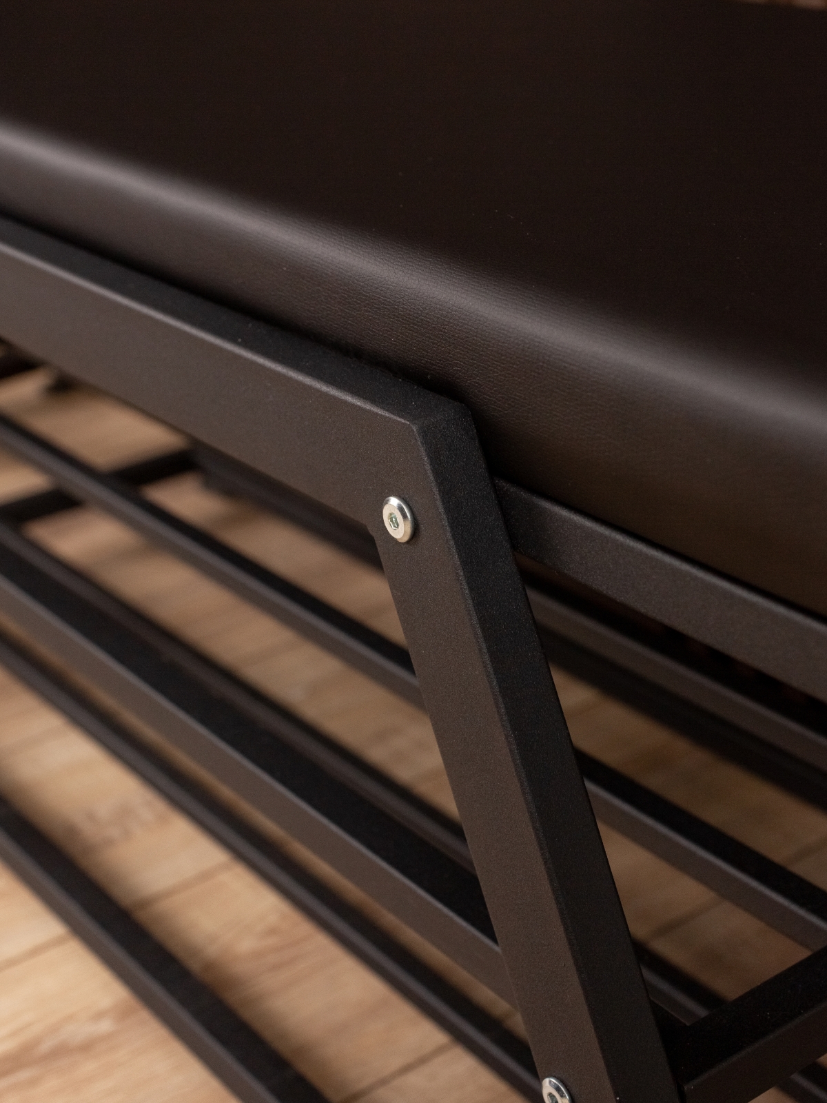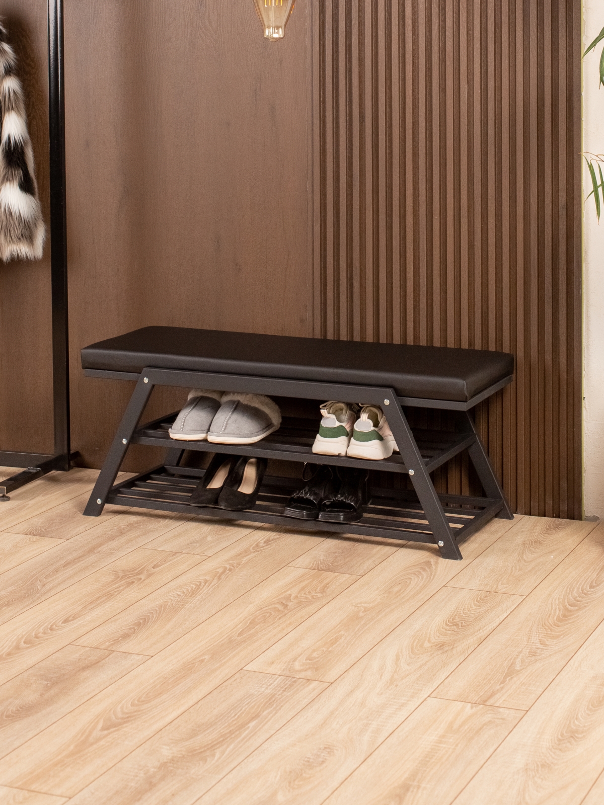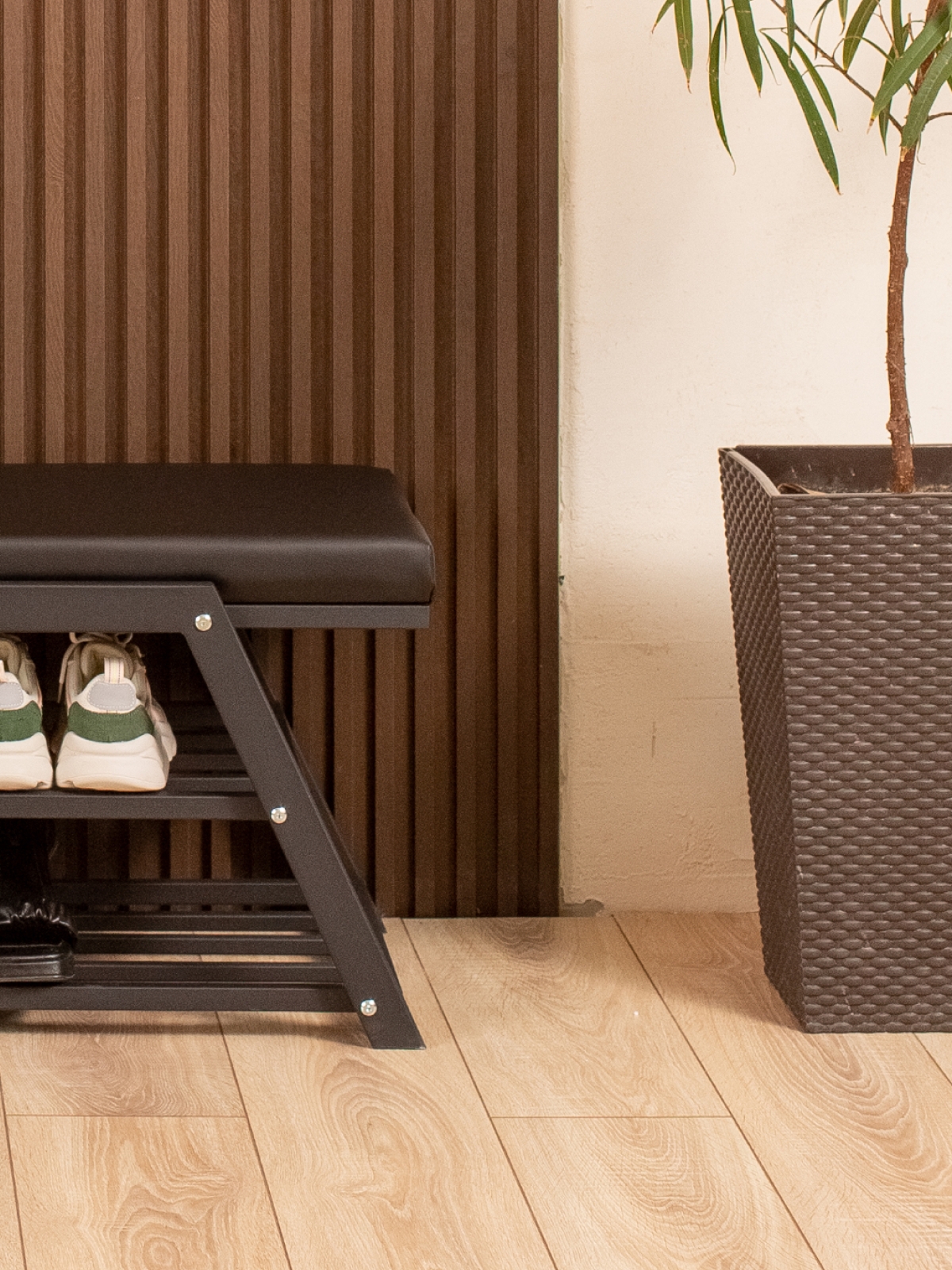 Обувница «Акера» сочетает в себе две ключевые функции: место для хранения обуви и комфортное сиденье. Две полки из металла вмещают повседневные пары и позволяют удобно рассортировать обувь всей семьи. Полки легко очищаются и сохраняют опрятный внешний вид даже при активной эксплуатации. Мягкое сиденье над ними — приятный бонус для тех, кто предпочитает снимать и надевать обувь сидя. Оно эргономично, не продавливается со временем и обеспечивает комфортную посадку.