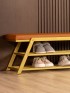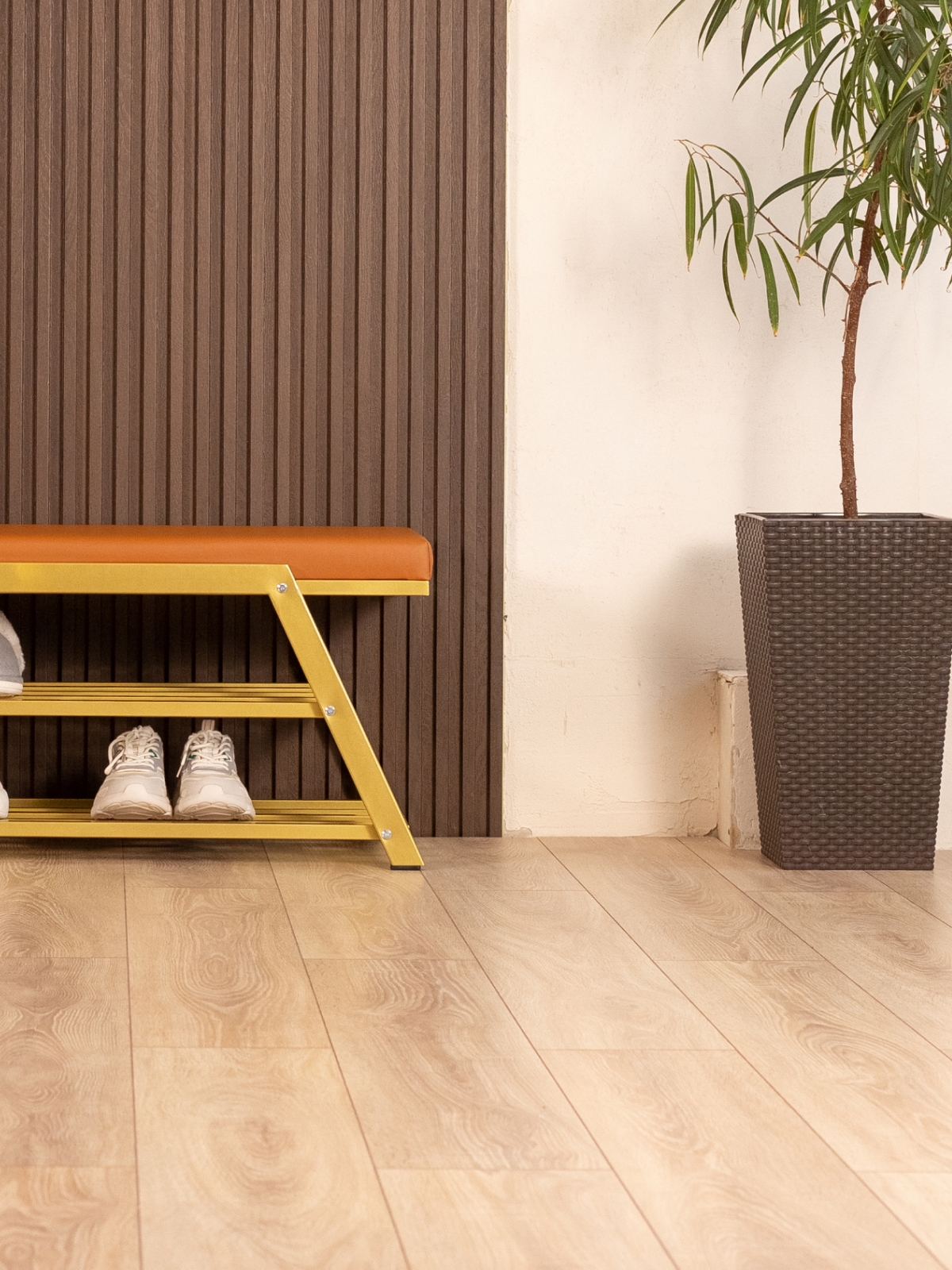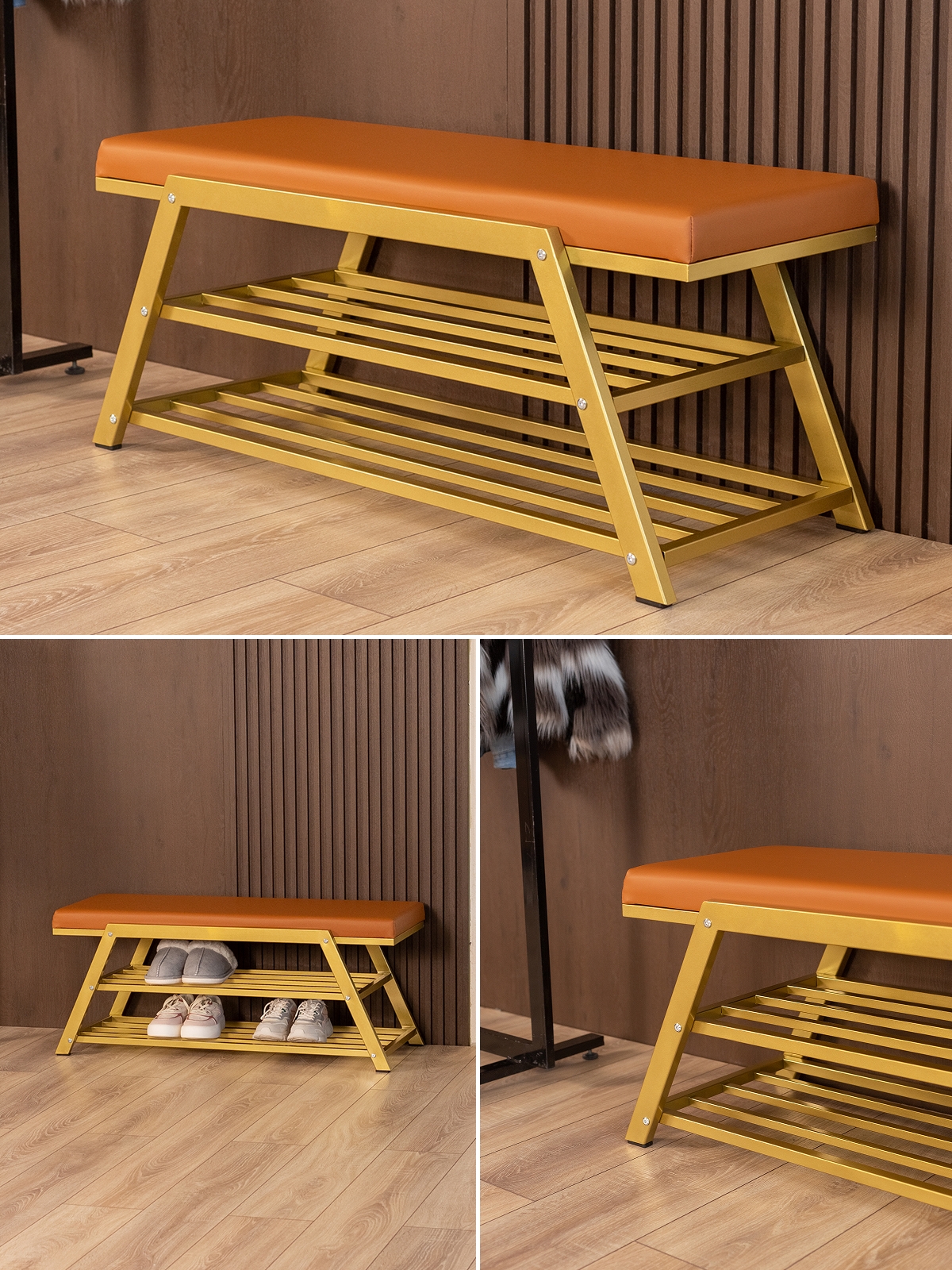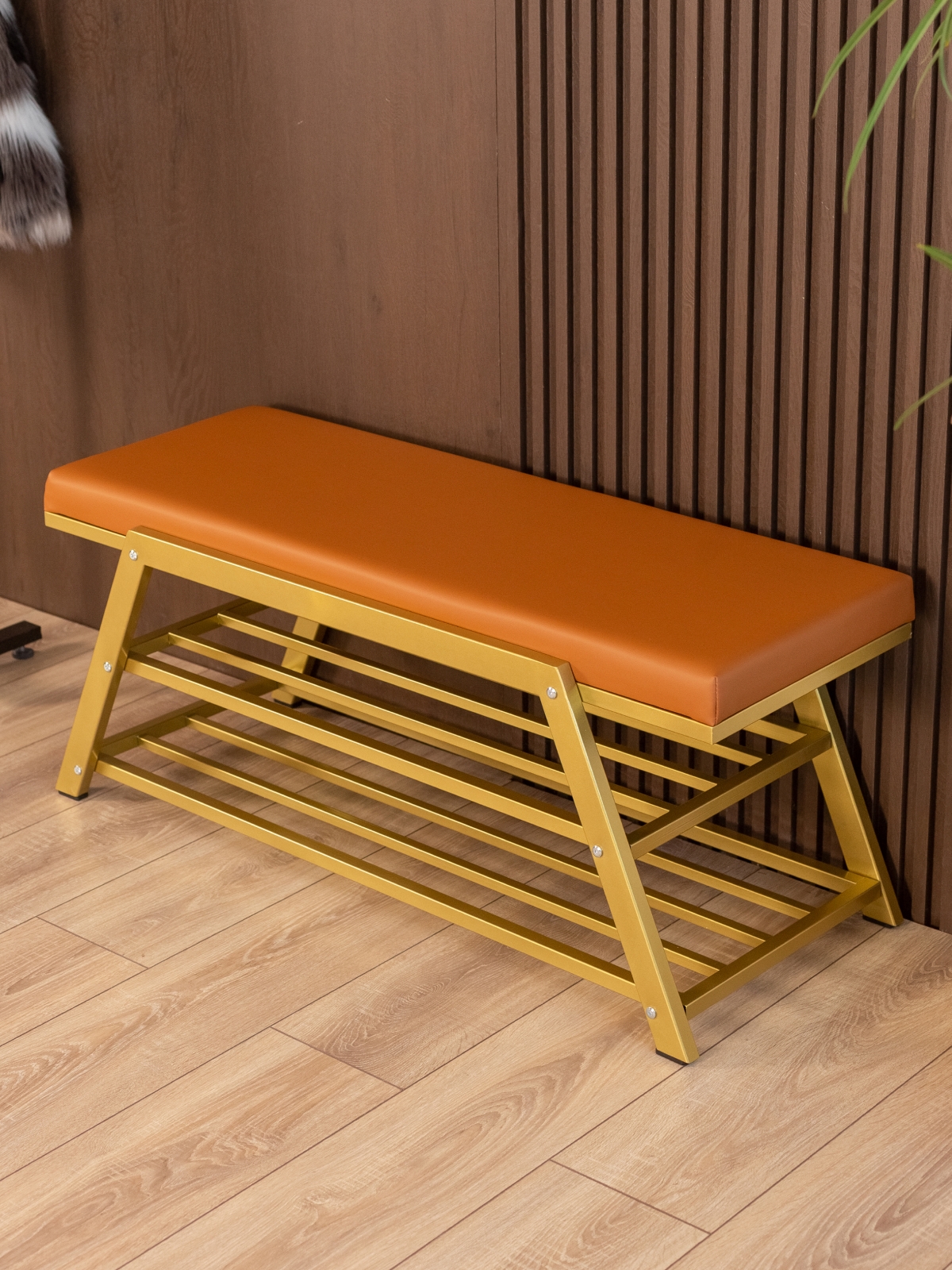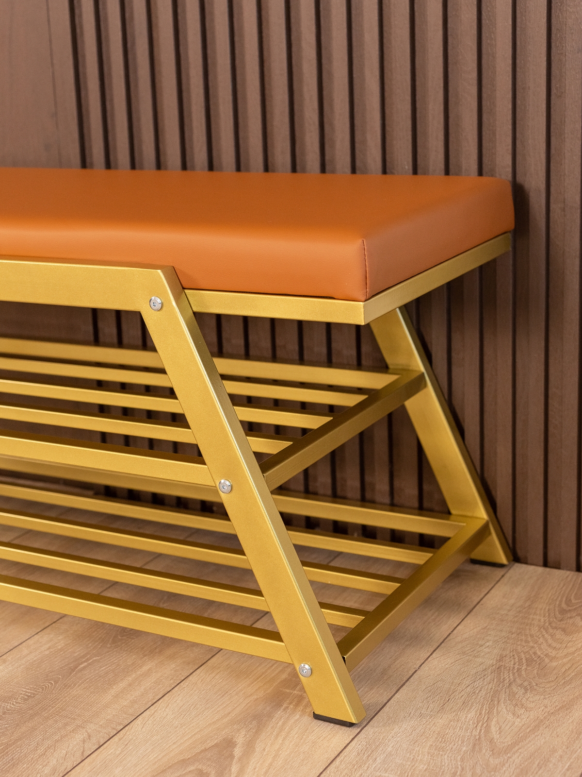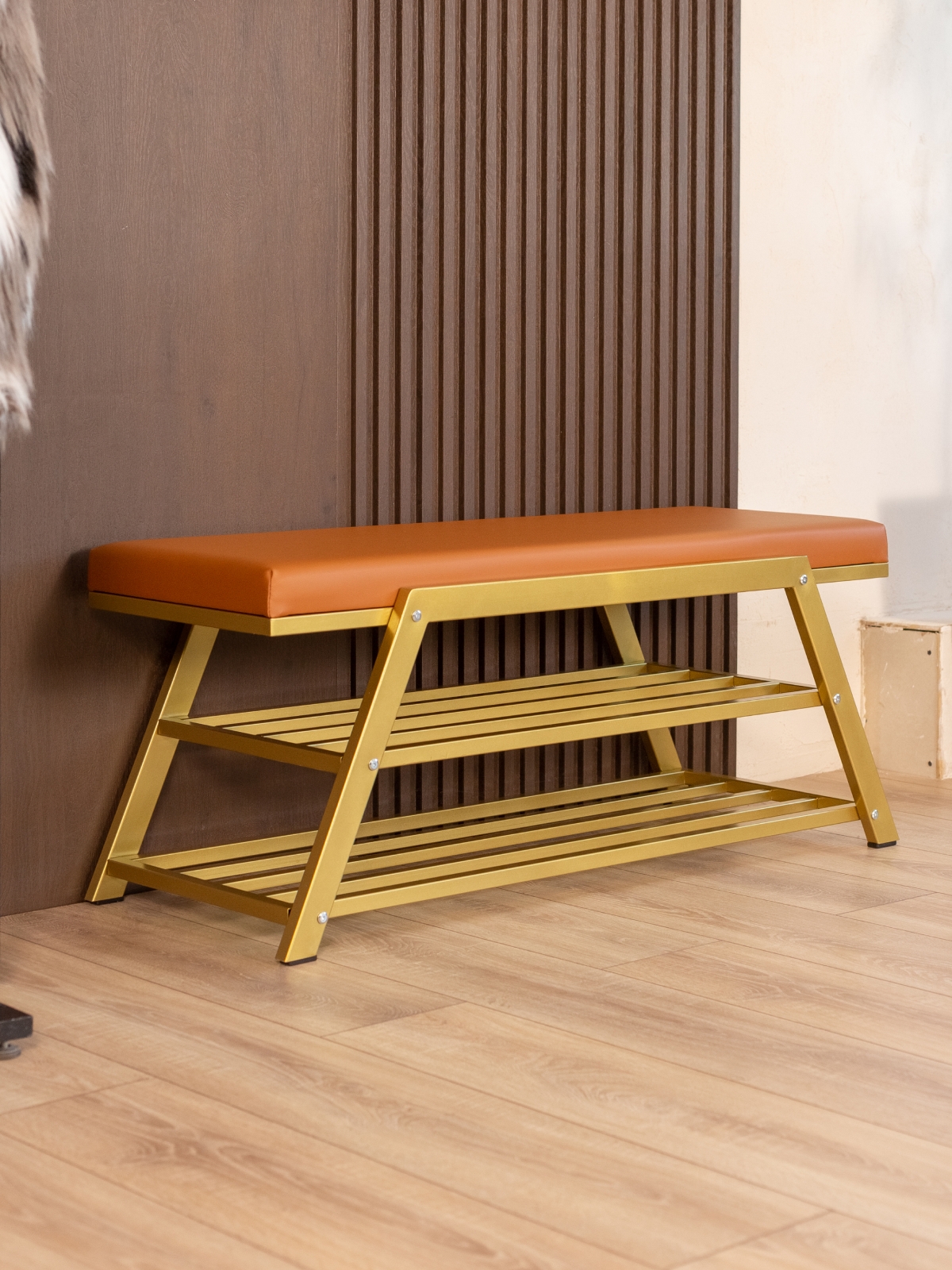 Обувница идеально подходит для интерьеров в стиле glam-лофт, где брутальные материалы сочетаются с глянцевыми и мягкими фактурами. Золотой металл эффектно смотрится в окружении мрамора, стекла, зеркал, бархата. Приветствуются насыщенные глубокие оттенки — изумрудный, сапфировый, бордовый. В сочетании с мягкой обивкой сиденья — из велюра или экокожи — создается композиция, в которой строгость линий уравновешивается уютом и комфортом.