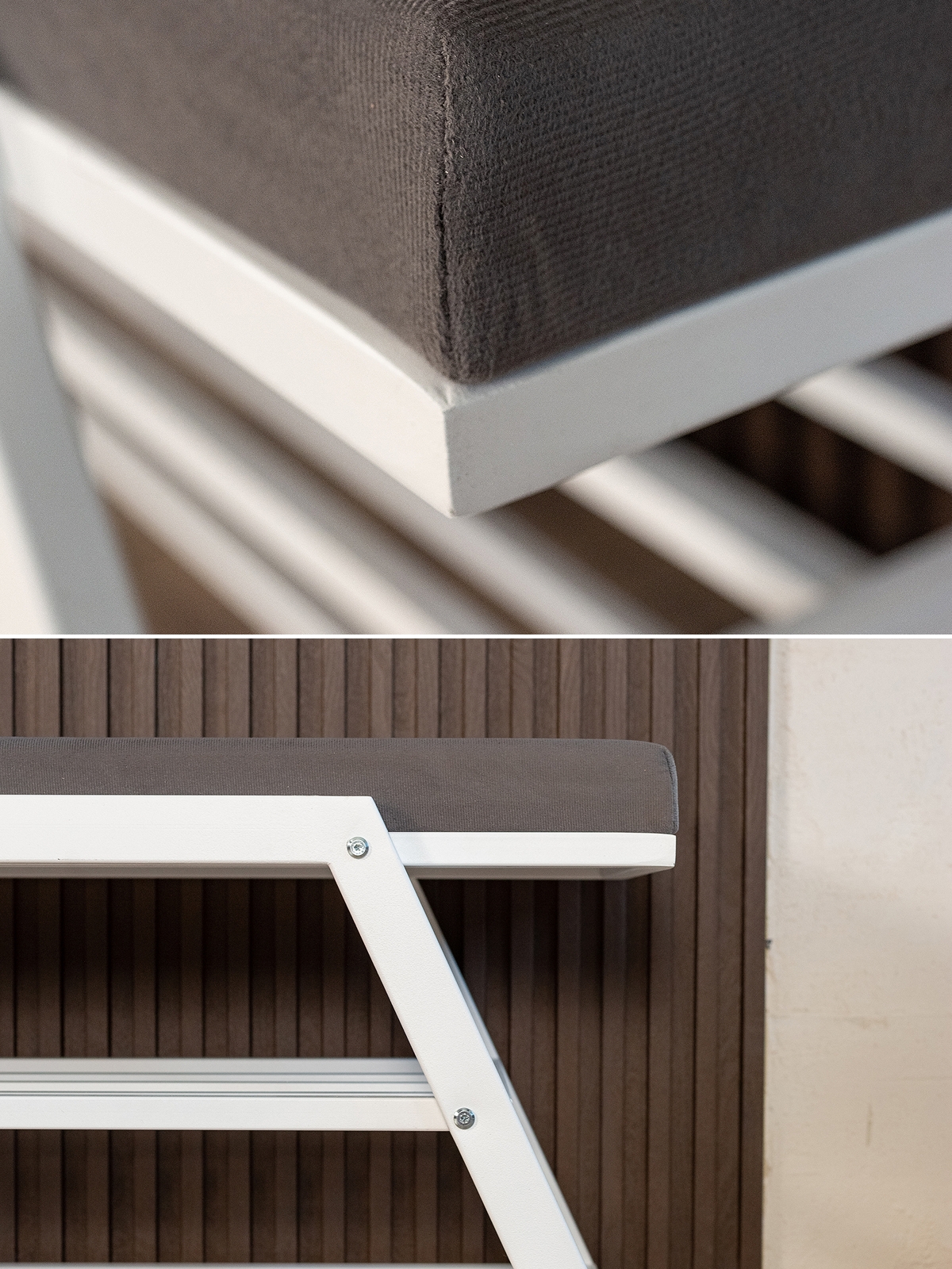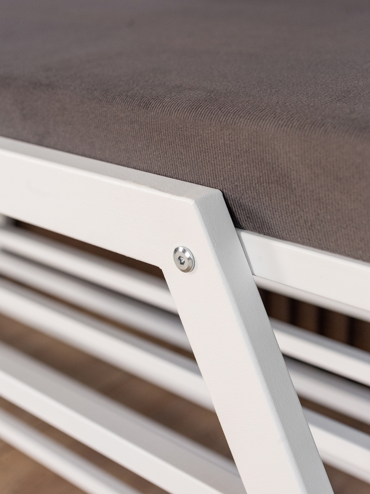 Каркас выполнен из прочного металла и окрашен полимерно-порошковой краской в чистый белый цвет. Это покрытие устойчиво к износу, не боится механических повреждений и сохраняет свежесть оттенка надолго. Белый металлический каркас — активная интерьерная деталь, подчеркивающая легкость и воздушность помещения. Изделие с таким каркасом отлично смотрится в интерьерах с преобладанием светлых тонов, помогает визуально расширить пространство и создает ощущение свежести и порядка.