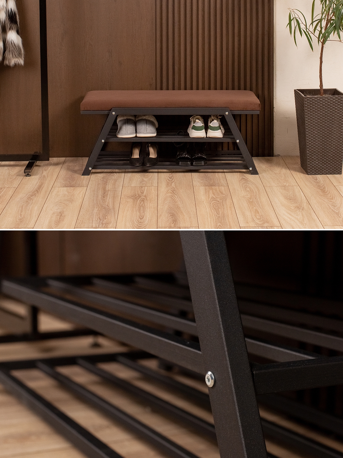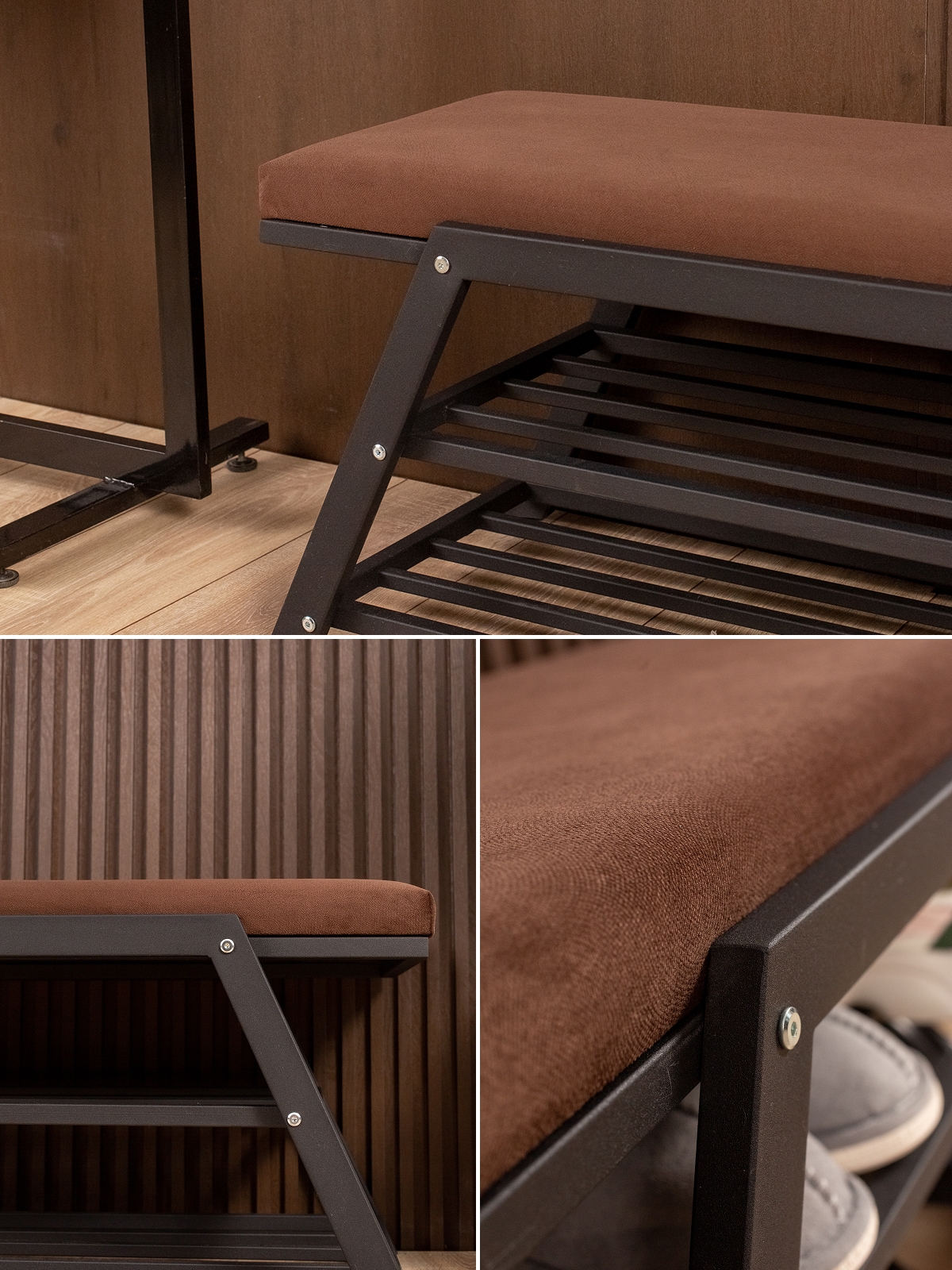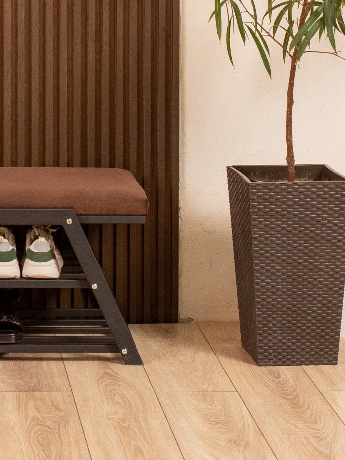 Обувница «Акера» сочетает в себе две ключевые функции: место для хранения обуви и комфортное сиденье. Две полки из металла вмещают повседневные пары и позволяют удобно рассортировать обувь всей семьи. Полки легко очищаются и сохраняют опрятный внешний вид даже при активной эксплуатации. Мягкое сиденье над ними — приятный бонус для тех, кто предпочитает снимать и надевать обувь сидя. Оно эргономично, не продавливается со временем и обеспечивает комфортную посадку.