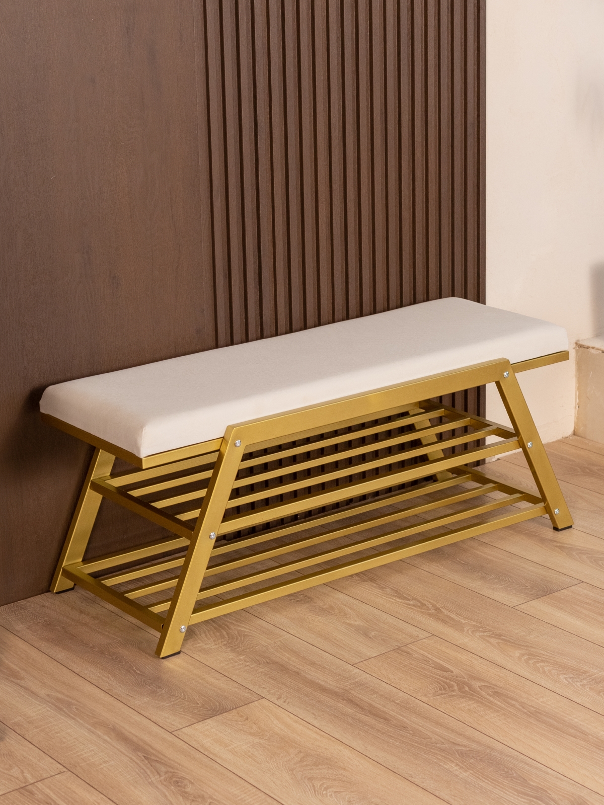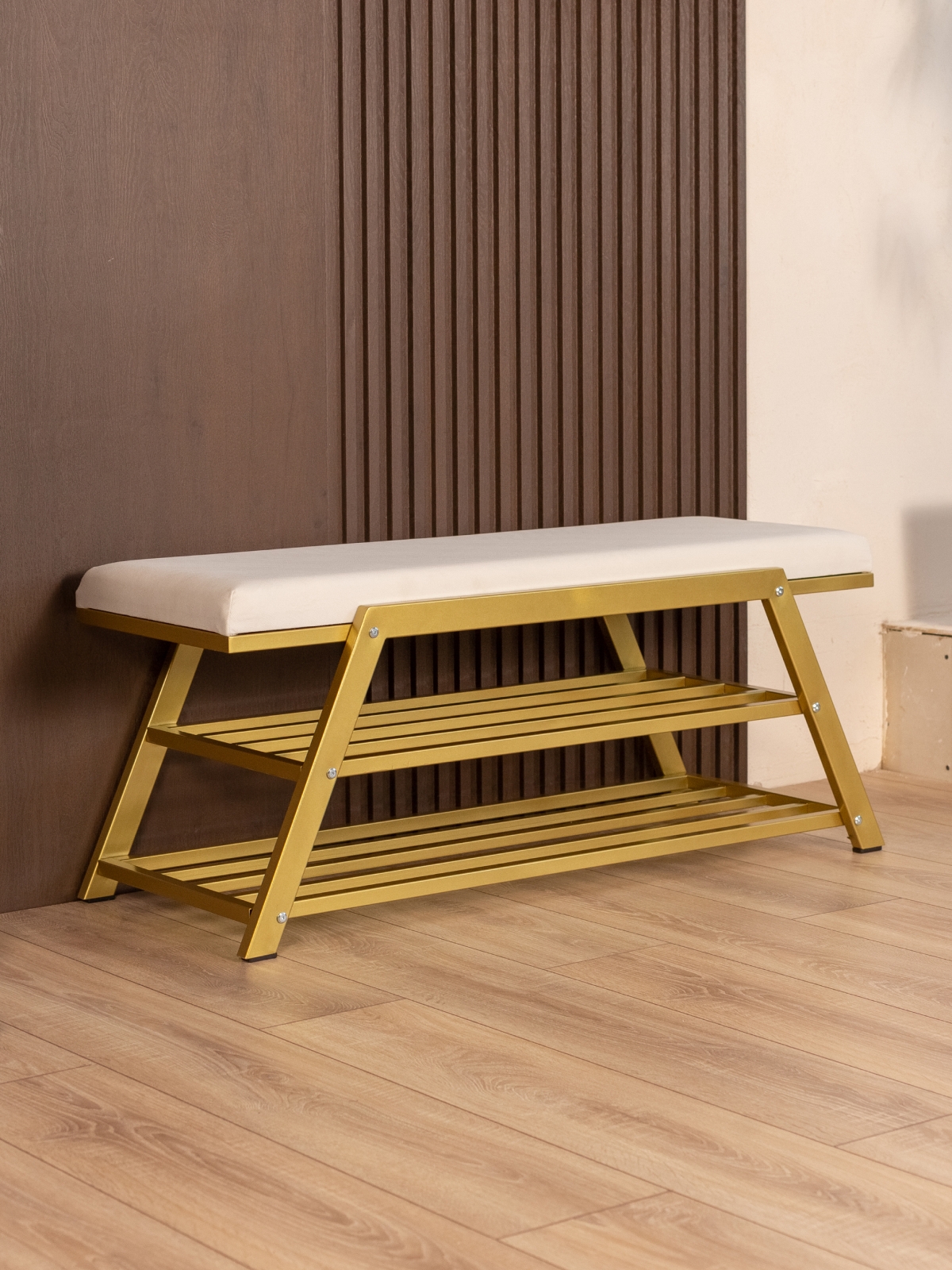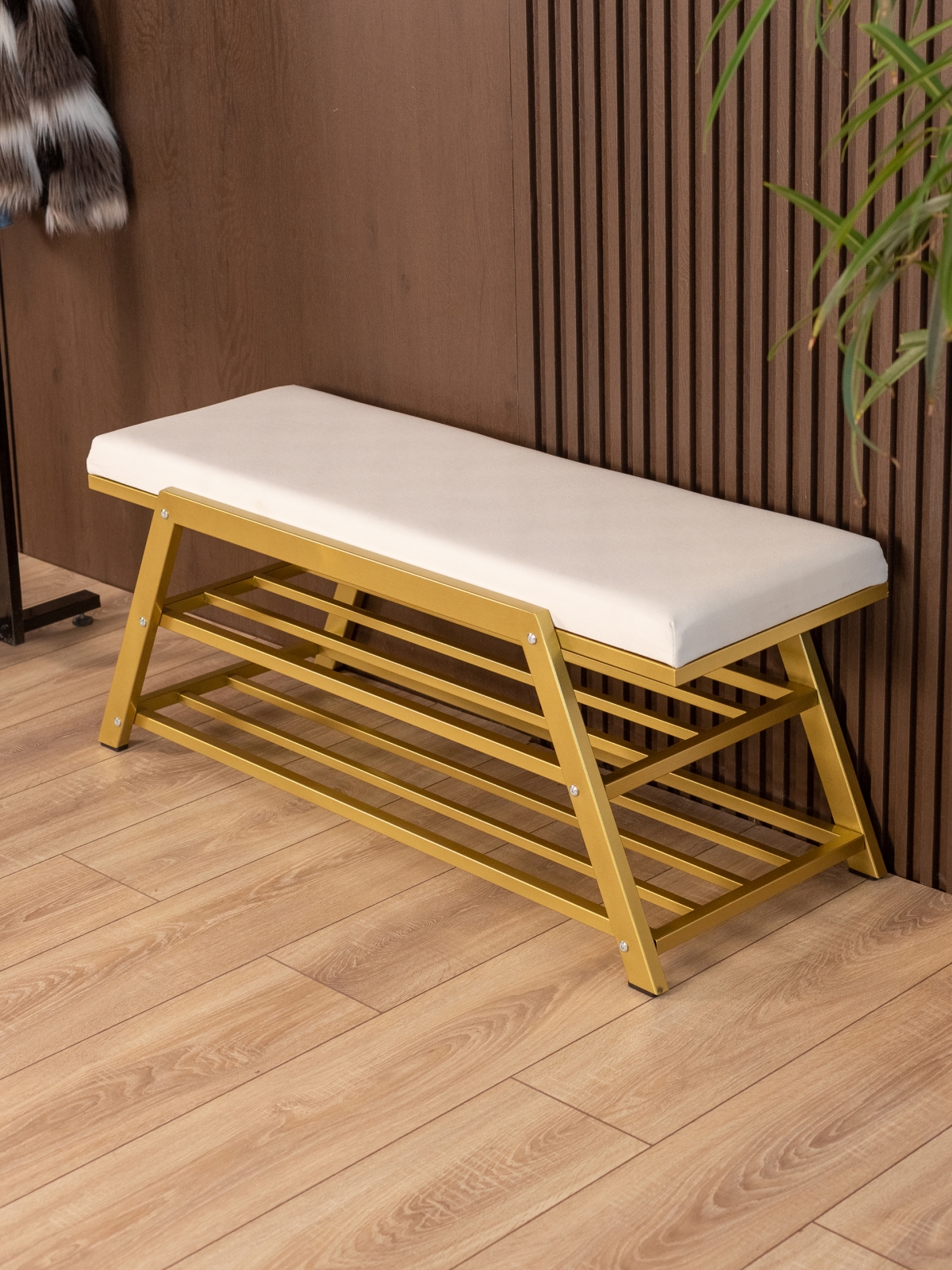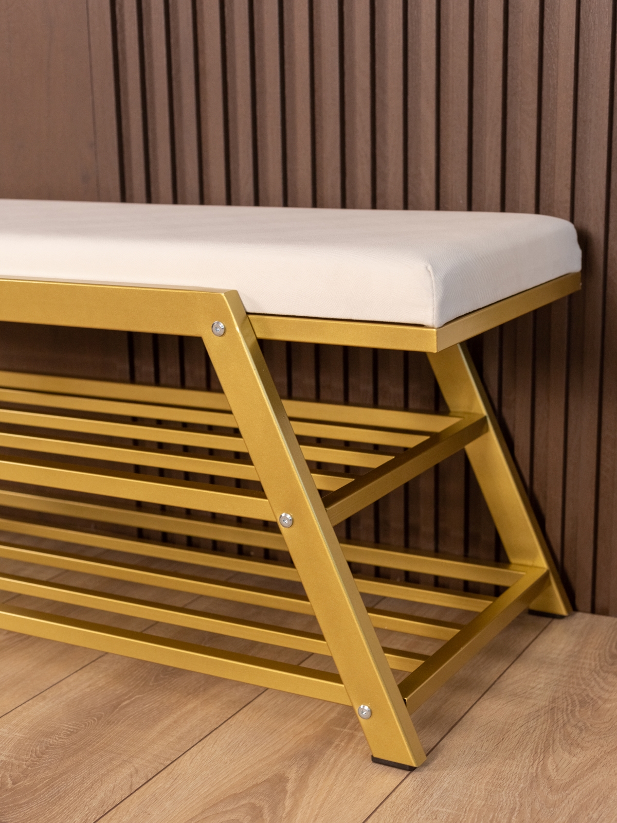 Обувница идеально подходит для интерьеров в стиле glam-лофт, где брутальные материалы сочетаются с глянцевыми и мягкими фактурами. Золотой металл эффектно смотрится в окружении мрамора, стекла, зеркал, бархата. Приветствуются насыщенные глубокие оттенки — изумрудный, сапфировый, бордовый. В сочетании с мягкой обивкой сиденья — из велюра или экокожи — создается композиция, в которой строгость линий уравновешивается уютом и комфортом.