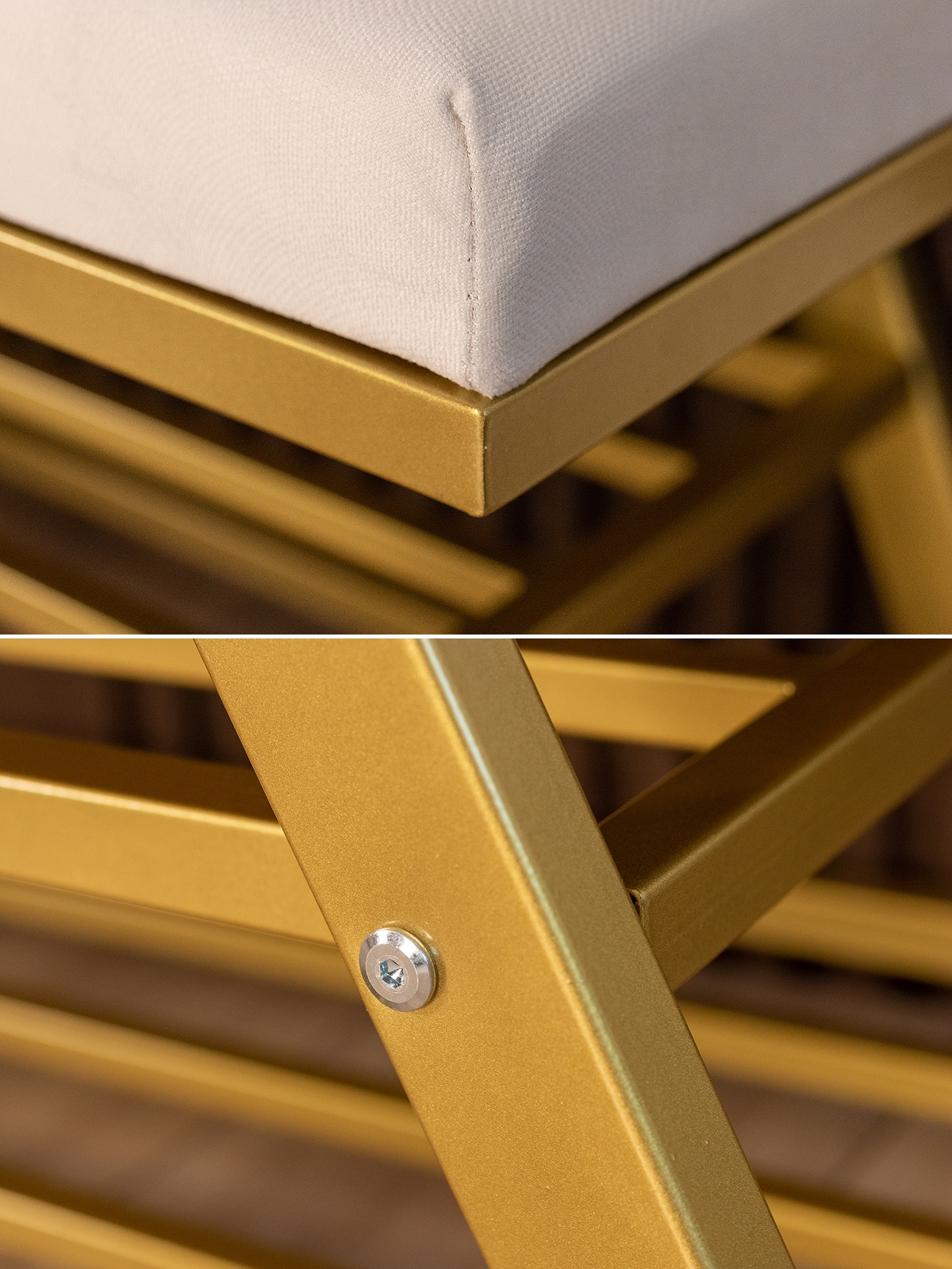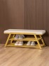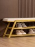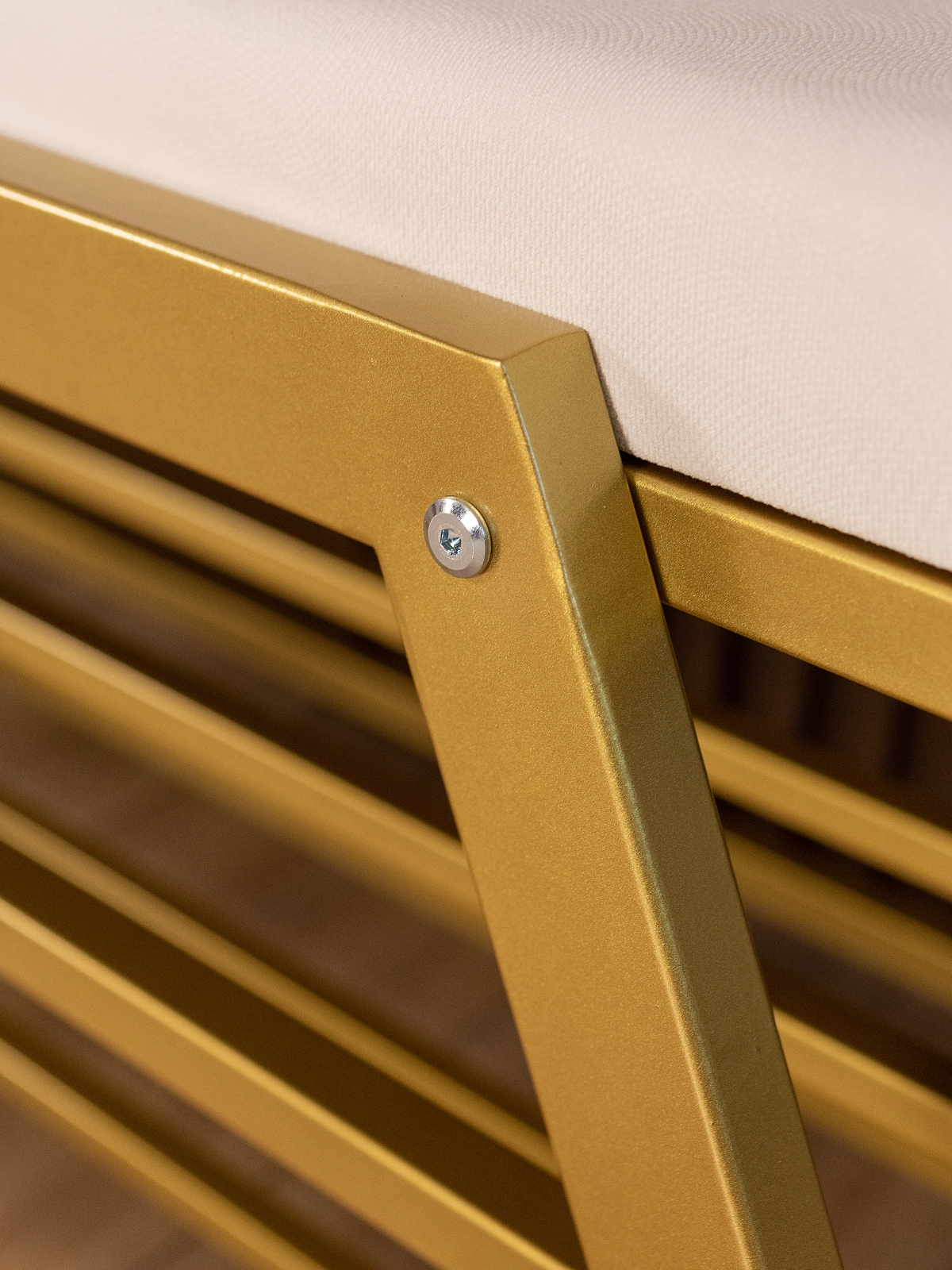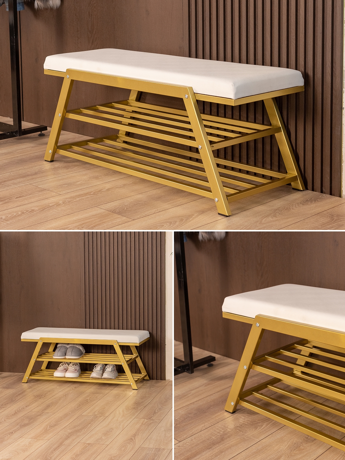 Обувница идеально подходит для интерьеров в стиле glam-лофт, где брутальные материалы сочетаются с глянцевыми и мягкими фактурами. Золотой металл эффектно смотрится в окружении мрамора, стекла, зеркал, бархата. Приветствуются насыщенные глубокие оттенки — изумрудный, сапфировый, бордовый. В сочетании с мягкой обивкой сиденья — из велюра или экокожи — создается композиция, в которой строгость линий уравновешивается уютом и комфортом.