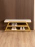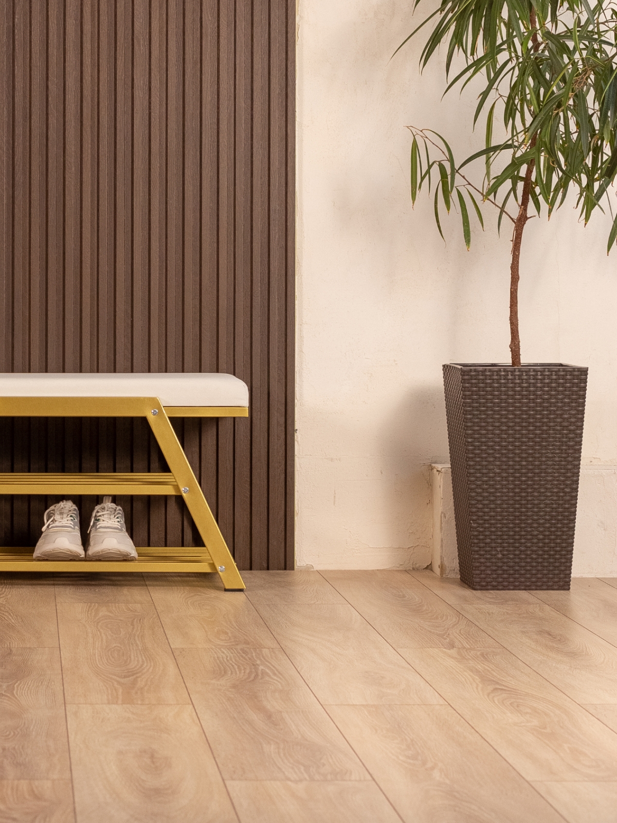 Главная изюминка — металлический каркас, окрашенный в благородный золотой цвет с помощью полимерно-порошковой краски. Этот способ покрытия обеспечивает стойкость оттенка, защищает металл от царапин и сохраняет блеск на протяжении долгого времени. Золотой каркас добавляет интерьеру мягкий теплый отблеск, превращая даже простую прихожую в атмосферное и стильное пространство. Это акцент, который работает сразу на нескольких уровнях: визуально притягивает взгляд, усиливает общее впечатление от интерьера и создает ощущение уюта с ноткой шика.