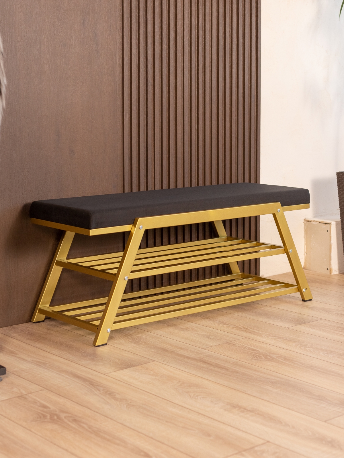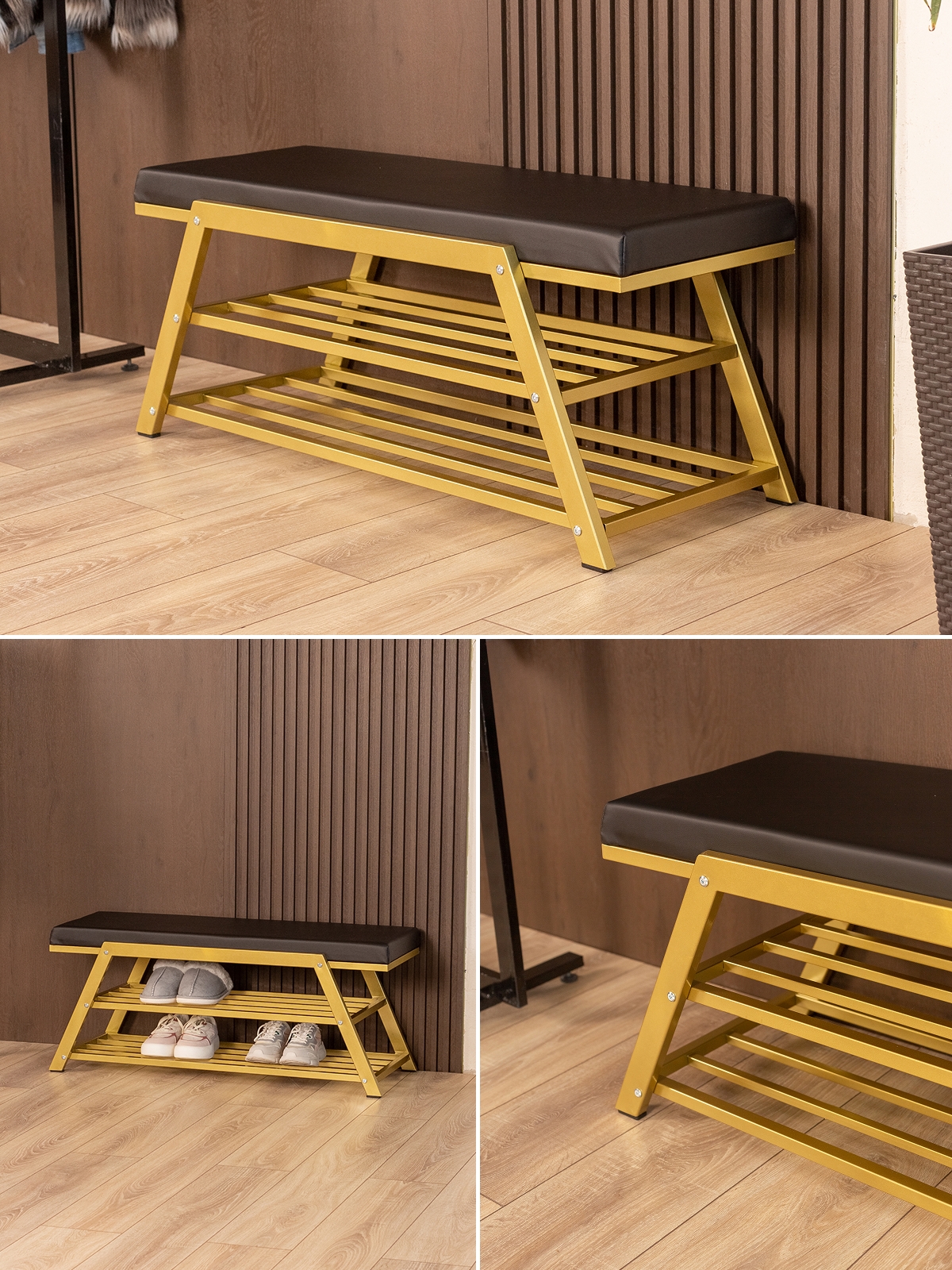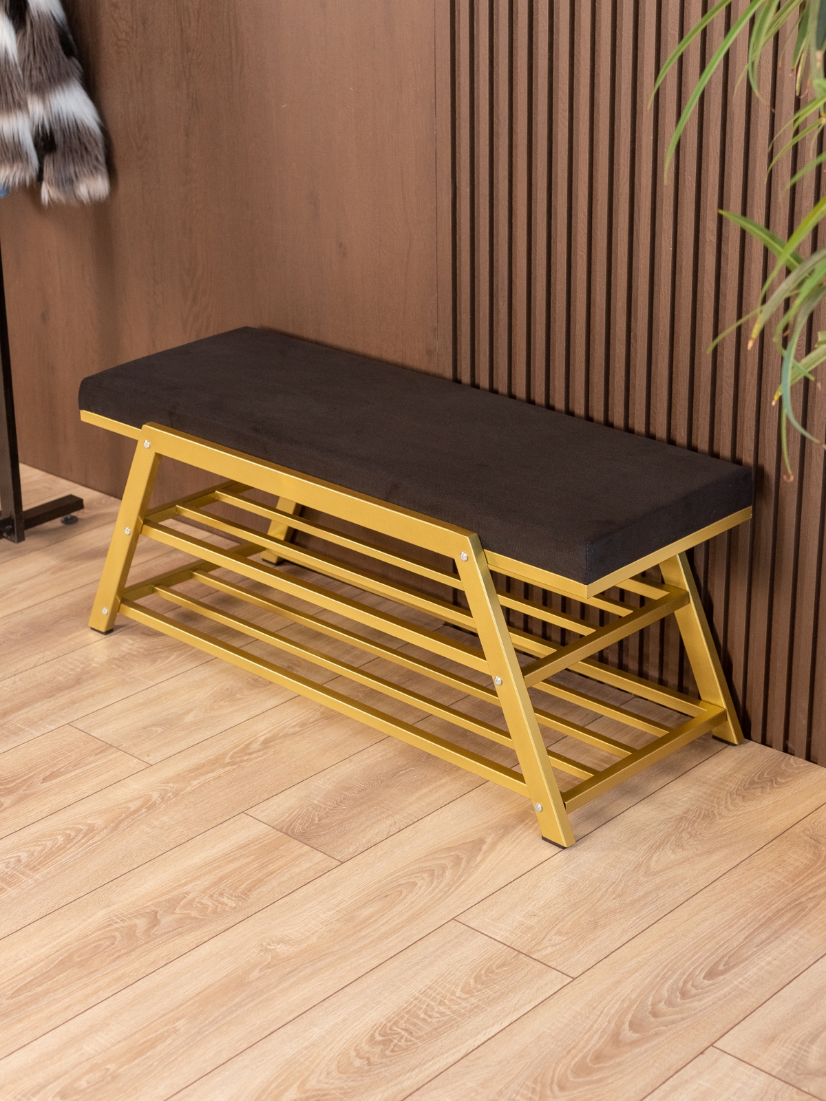 Обувница идеально подходит для интерьеров в стиле glam-лофт, где брутальные материалы сочетаются с глянцевыми и мягкими фактурами. Золотой металл эффектно смотрится в окружении мрамора, стекла, зеркал, бархата. Приветствуются насыщенные глубокие оттенки — изумрудный, сапфировый, бордовый. В сочетании с мягкой обивкой сиденья — из велюра или экокожи — создается композиция, в которой строгость линий уравновешивается уютом и комфортом.