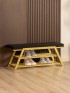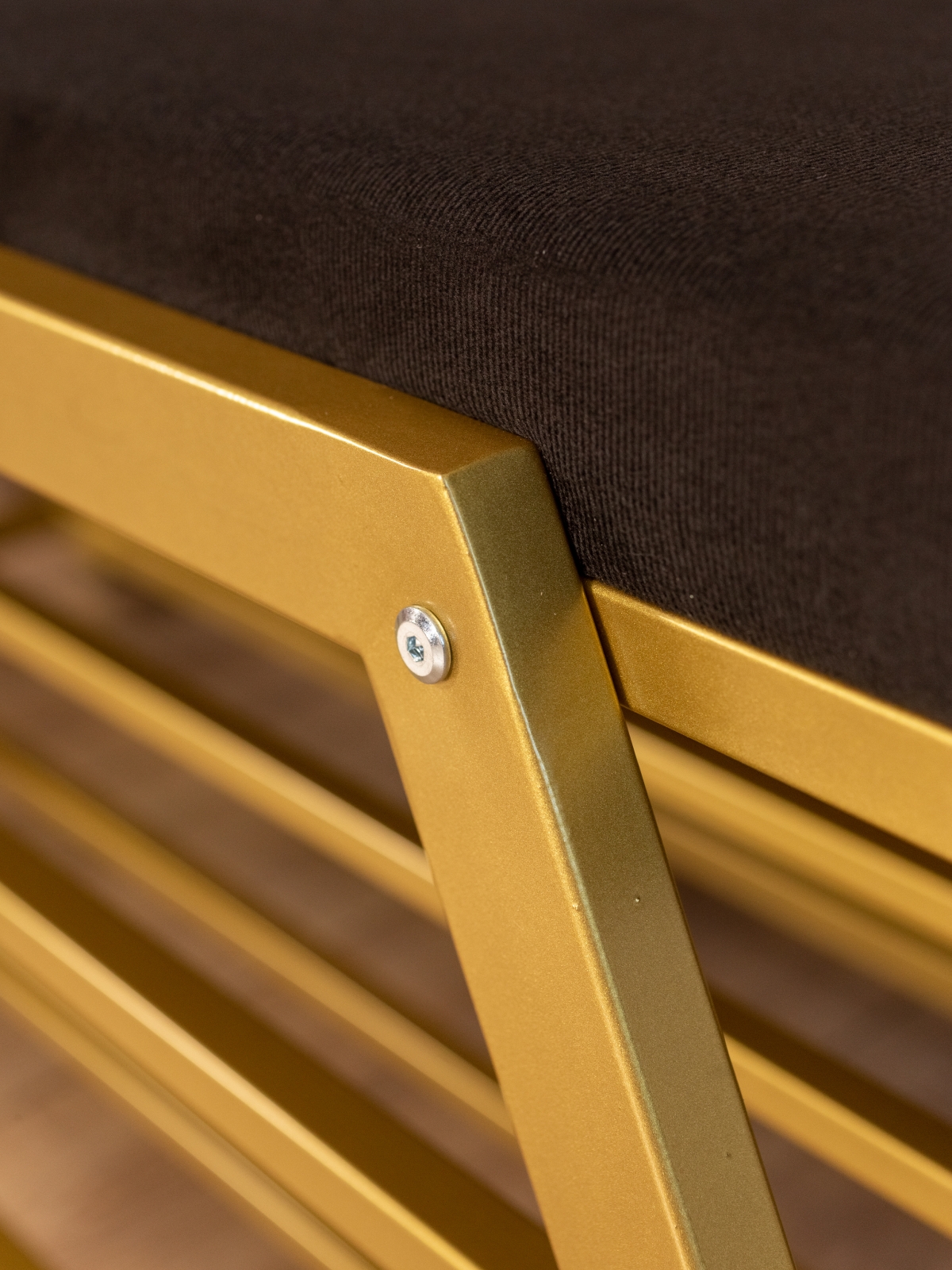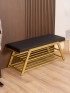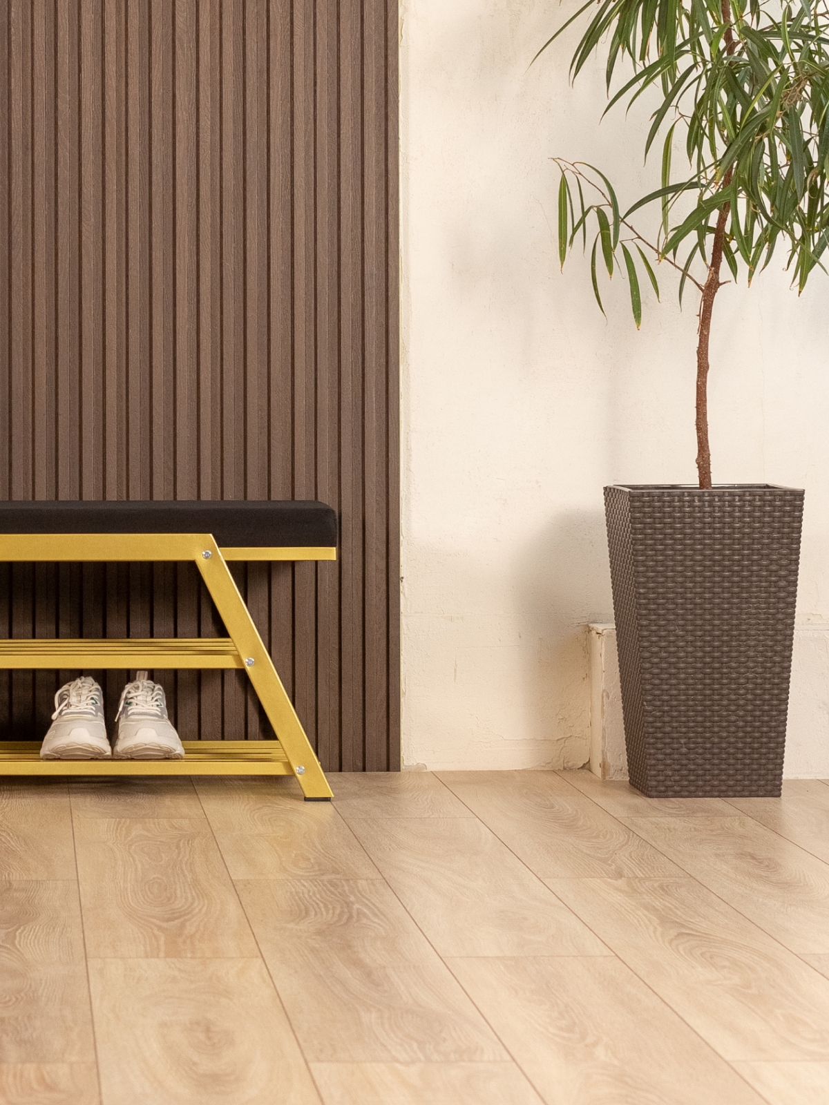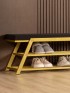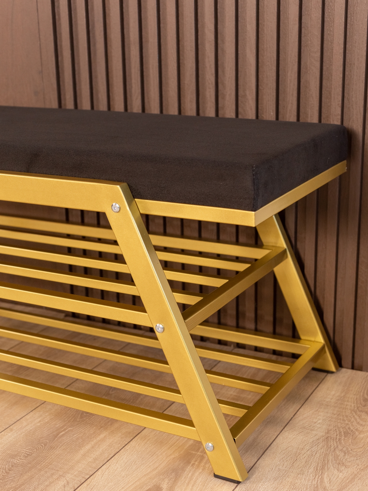 Обувница идеально подходит для интерьеров в стиле glam-лофт, где брутальные материалы сочетаются с глянцевыми и мягкими фактурами. Золотой металл эффектно смотрится в окружении мрамора, стекла, зеркал, бархата. Приветствуются насыщенные глубокие оттенки — изумрудный, сапфировый, бордовый. В сочетании с мягкой обивкой сиденья — из велюра или экокожи — создается композиция, в которой строгость линий уравновешивается уютом и комфортом.