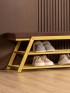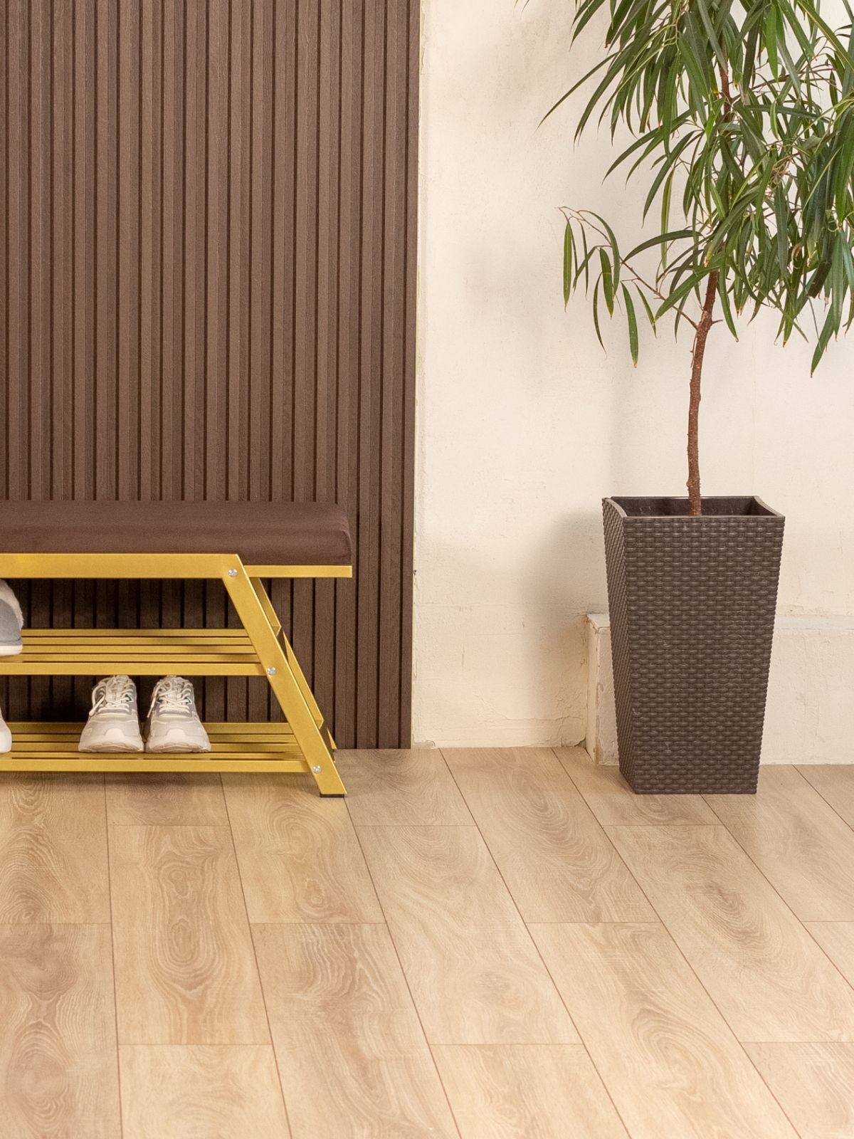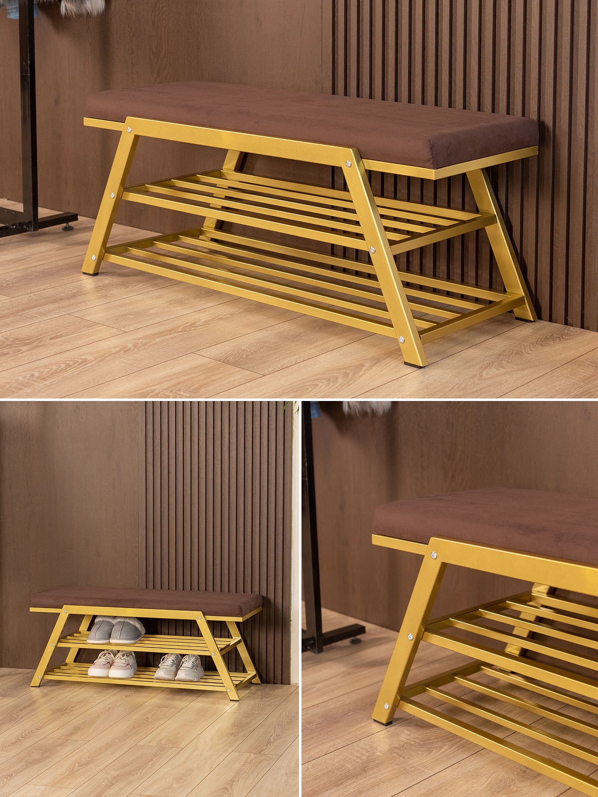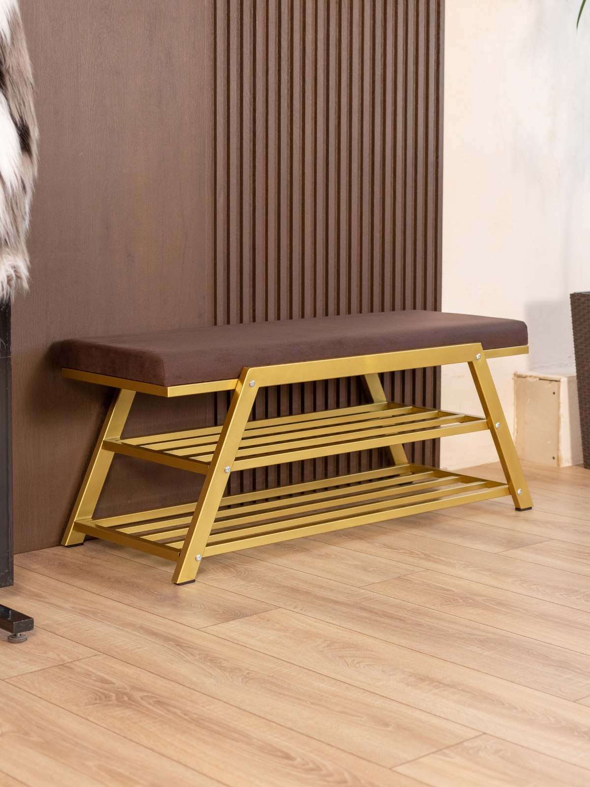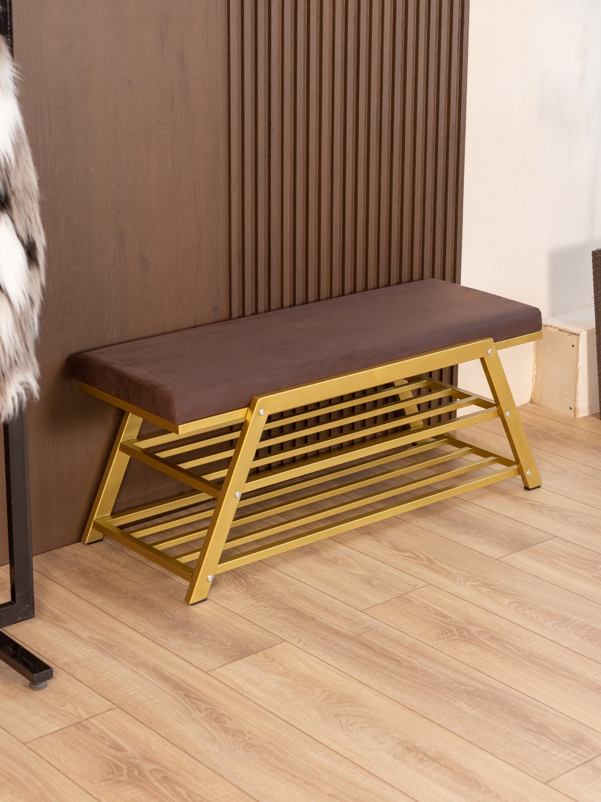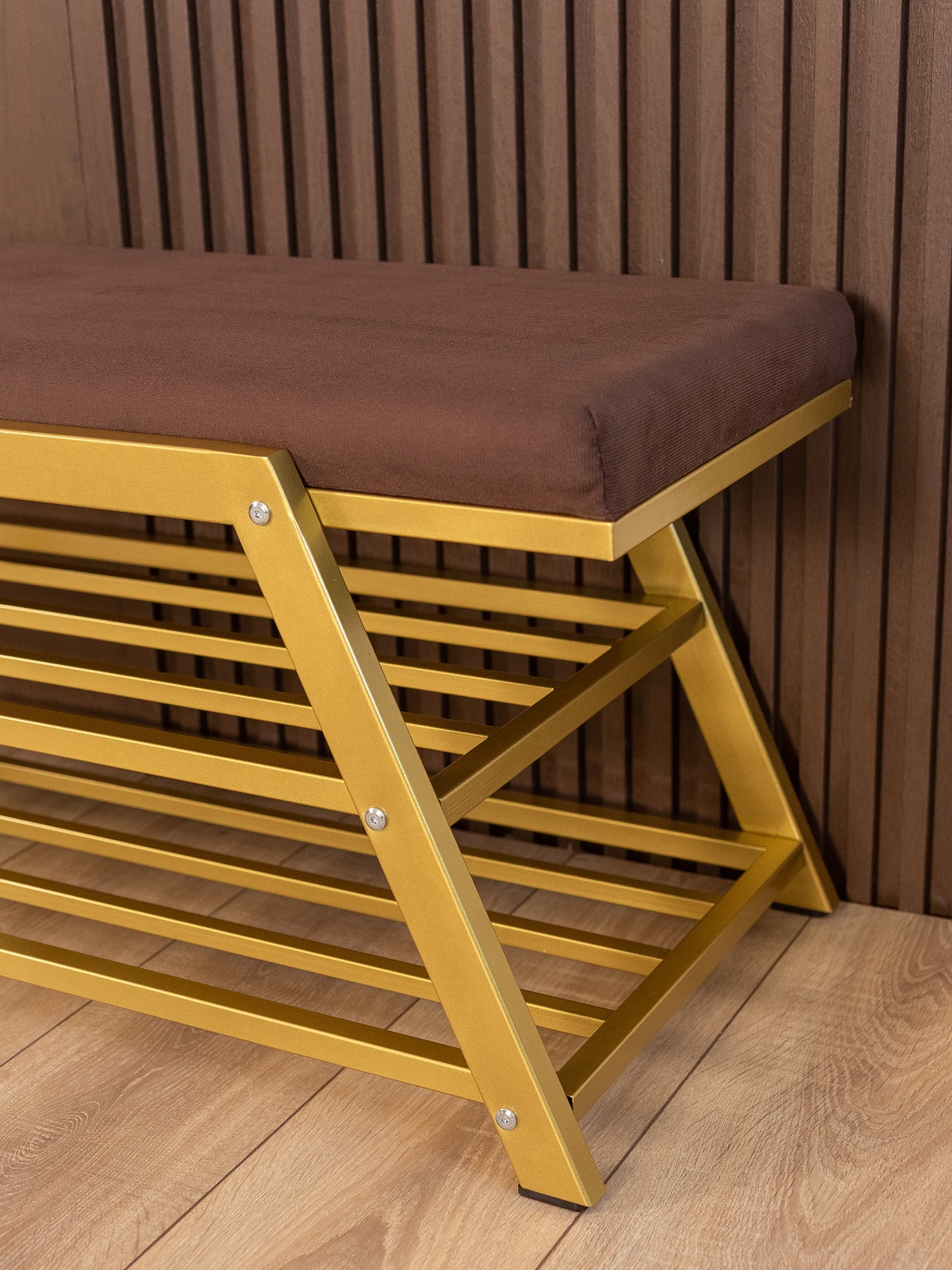 Обувница идеально подходит для интерьеров в стиле glam-лофт, где брутальные материалы сочетаются с глянцевыми и мягкими фактурами. Золотой металл эффектно смотрится в окружении мрамора, стекла, зеркал, бархата. Приветствуются насыщенные глубокие оттенки — изумрудный, сапфировый, бордовый. В сочетании с мягкой обивкой сиденья — из велюра или экокожи — создается композиция, в которой строгость линий уравновешивается уютом и комфортом.