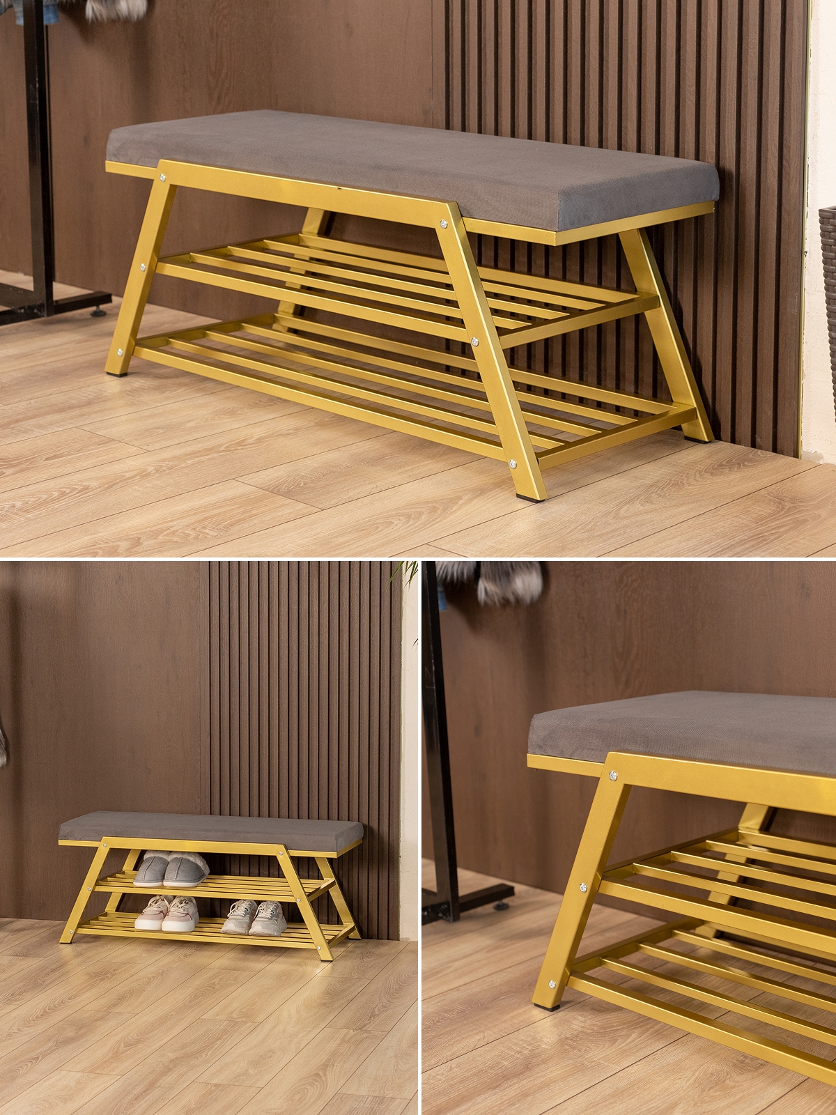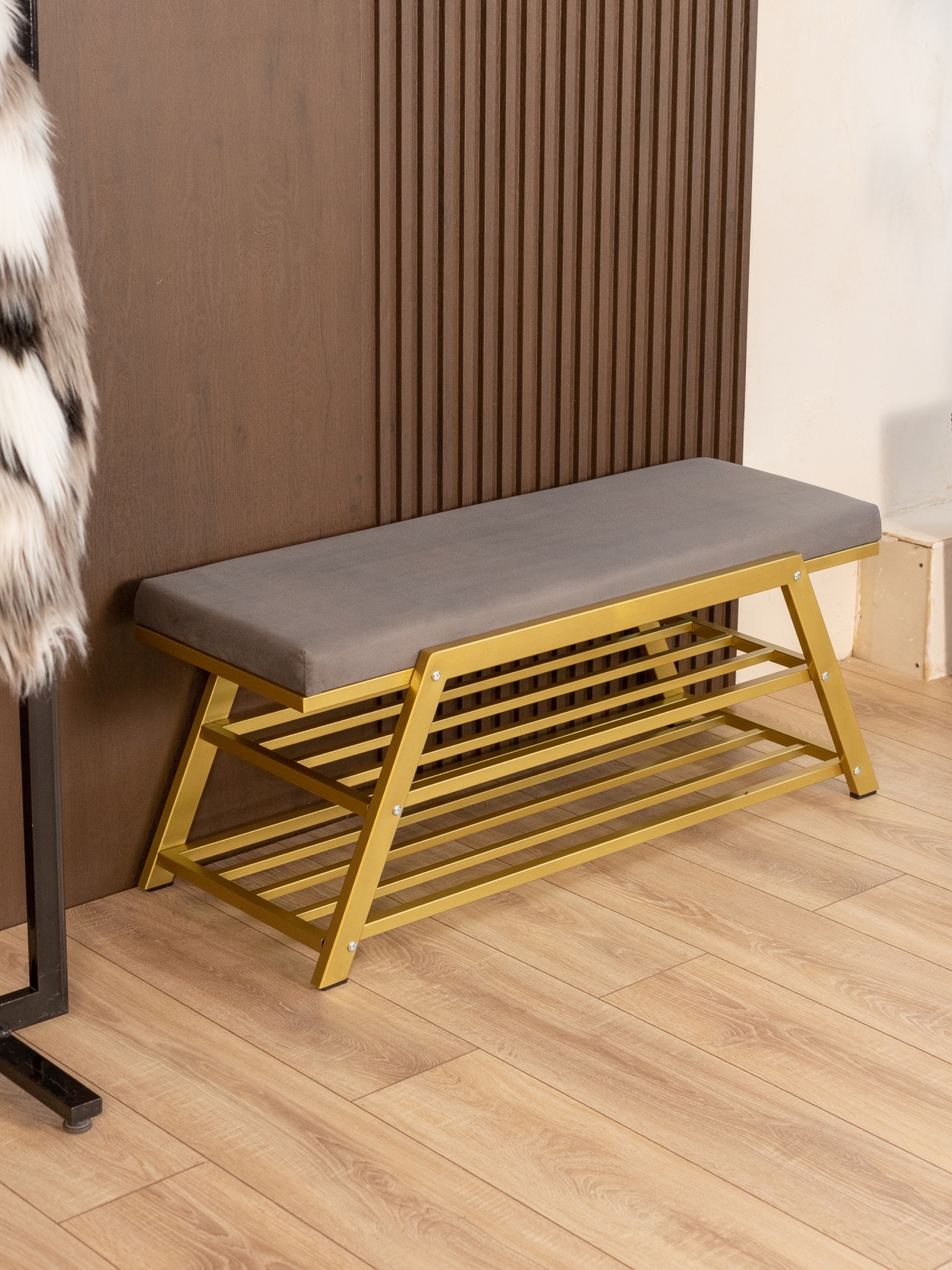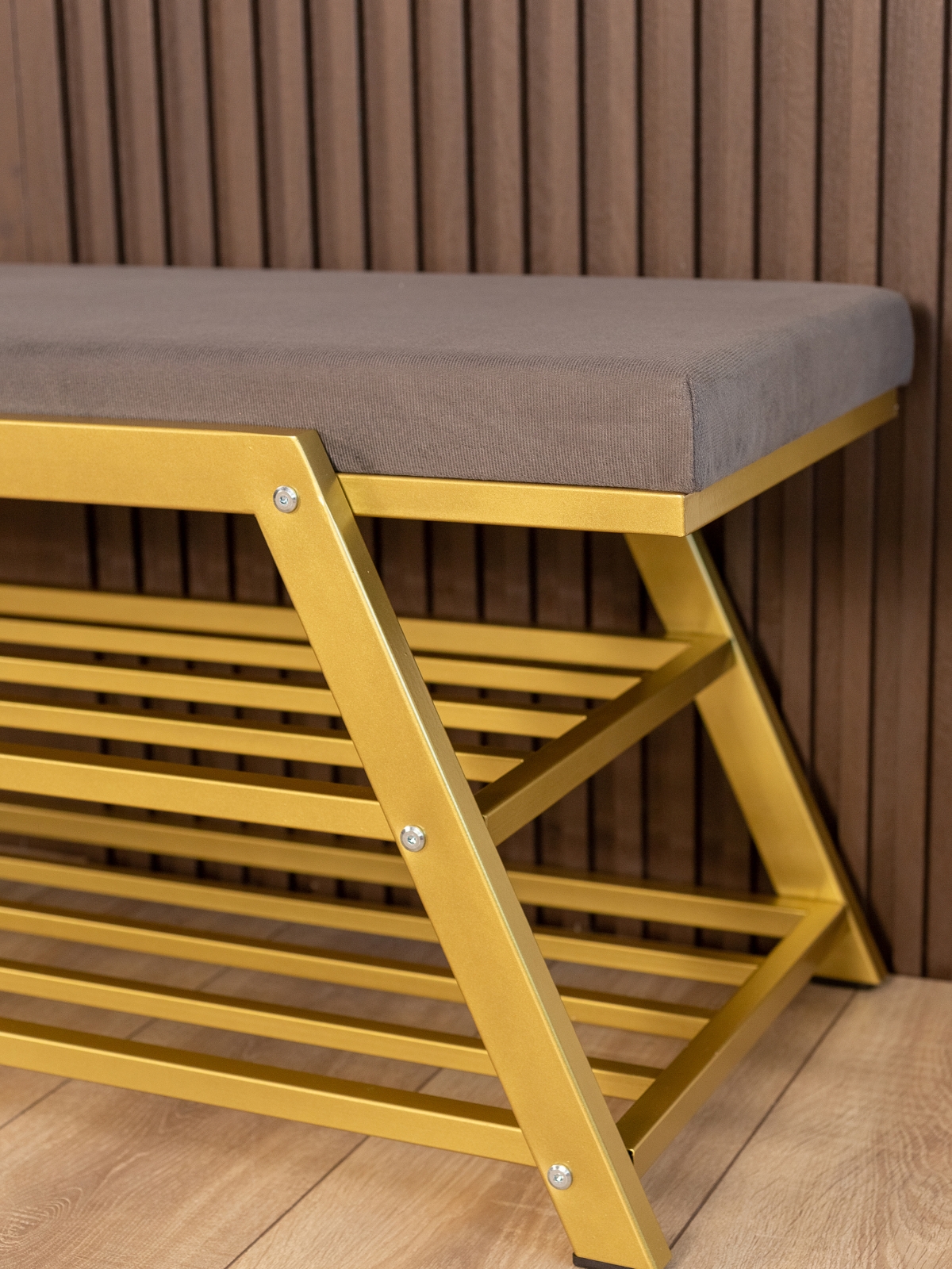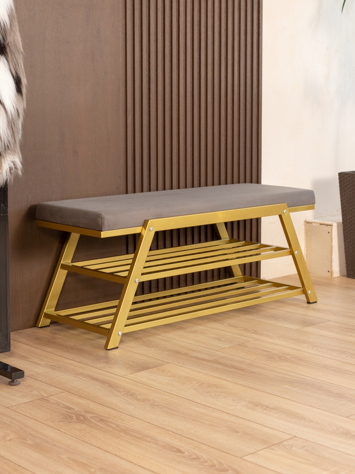 Обувница идеально подходит для интерьеров в стиле glam-лофт, где брутальные материалы сочетаются с глянцевыми и мягкими фактурами. Золотой металл эффектно смотрится в окружении мрамора, стекла, зеркал, бархата. Приветствуются насыщенные глубокие оттенки — изумрудный, сапфировый, бордовый. В сочетании с мягкой обивкой сиденья — из велюра или экокожи — создается композиция, в которой строгость линий уравновешивается уютом и комфортом.