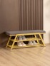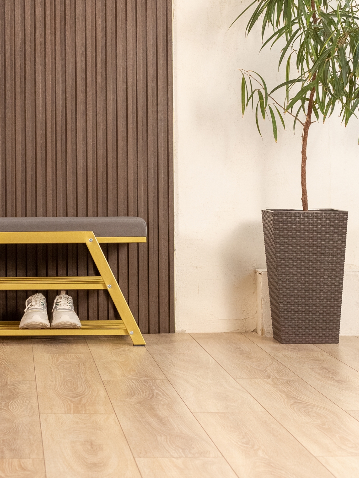 Главная изюминка — металлический каркас, окрашенный в благородный золотой цвет с помощью полимерно-порошковой краски. Этот способ покрытия обеспечивает стойкость оттенка, защищает металл от царапин и сохраняет блеск на протяжении долгого времени. Золотой каркас добавляет интерьеру мягкий теплый отблеск, превращая даже простую прихожую в атмосферное и стильное пространство. Это акцент, который работает сразу на нескольких уровнях: визуально притягивает взгляд, усиливает общее впечатление от интерьера и создает ощущение уюта с ноткой шика.