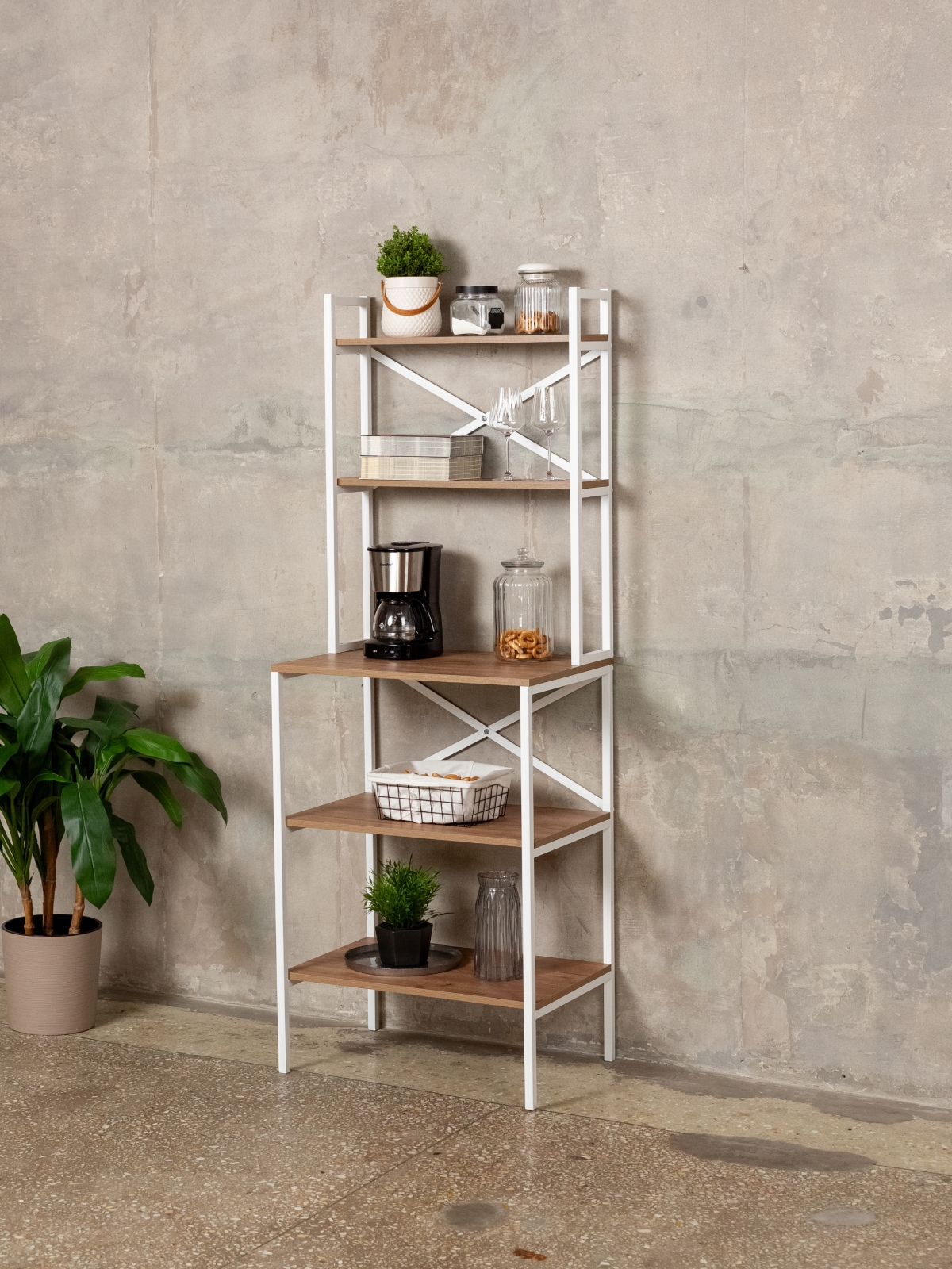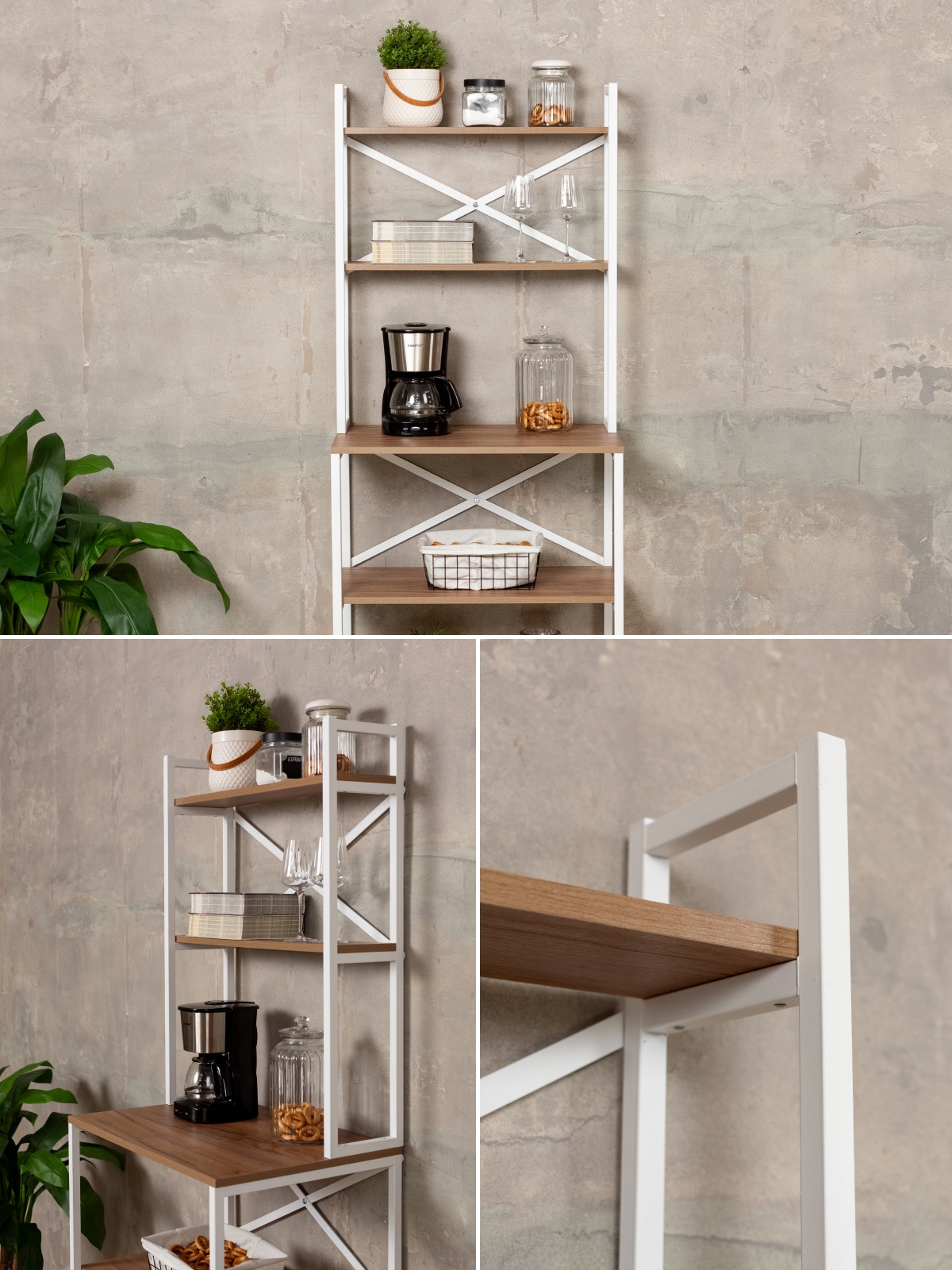 Открытая конструкция металлической этажерки с секциями и полочками позволяет использовать пространство максимально эффективно. Универсальный дизайн подойдет для хранения посуды, аксессуаров для чая и кофе, кофемашины, микроволновки, духовки, инструментов, офисных принадлежностей, а также для организации хранения в кладовке. Металлические детали обеспечивают надежность и долговечность, а белый цвет визуально расширяет помещение, создавая ощущение чистоты и свежести. Такой стеллаж станет отличным выбором для кухни, гостиной, спальни, кофейной или чайной зоны в офисе, а также для размещения комнатных растений, цветов или аксессуаров.