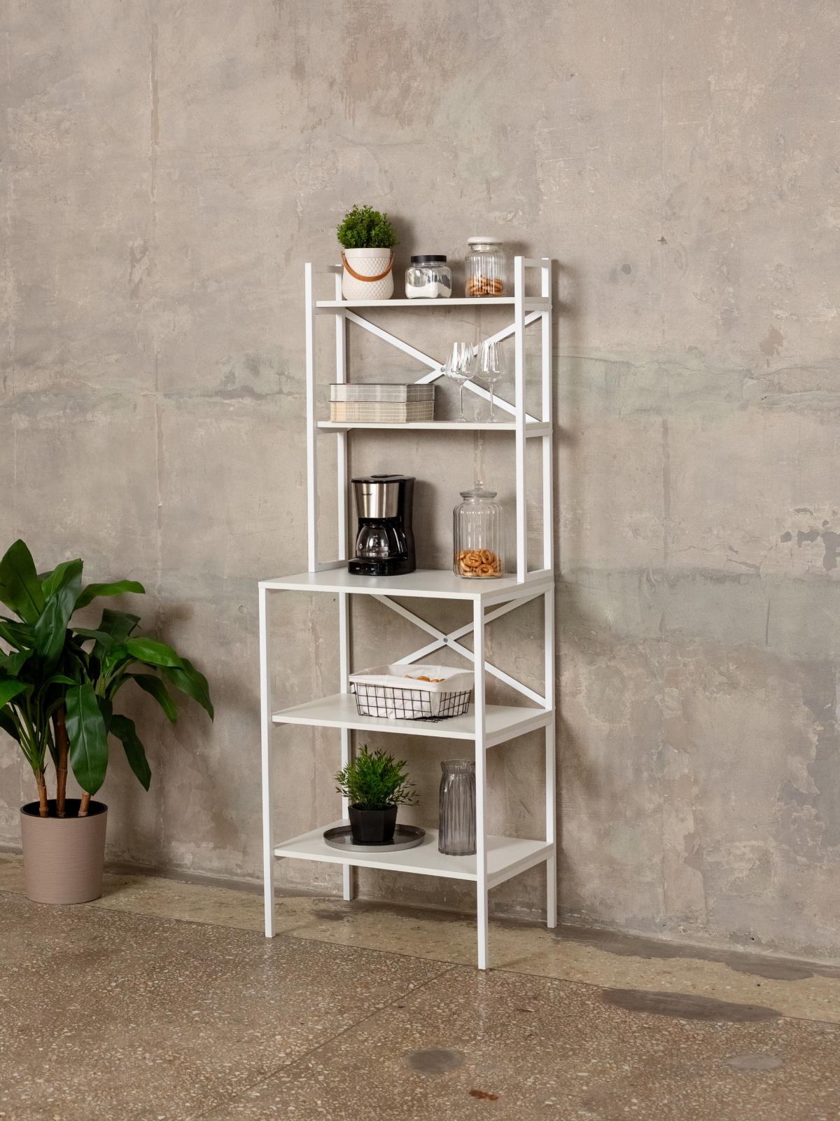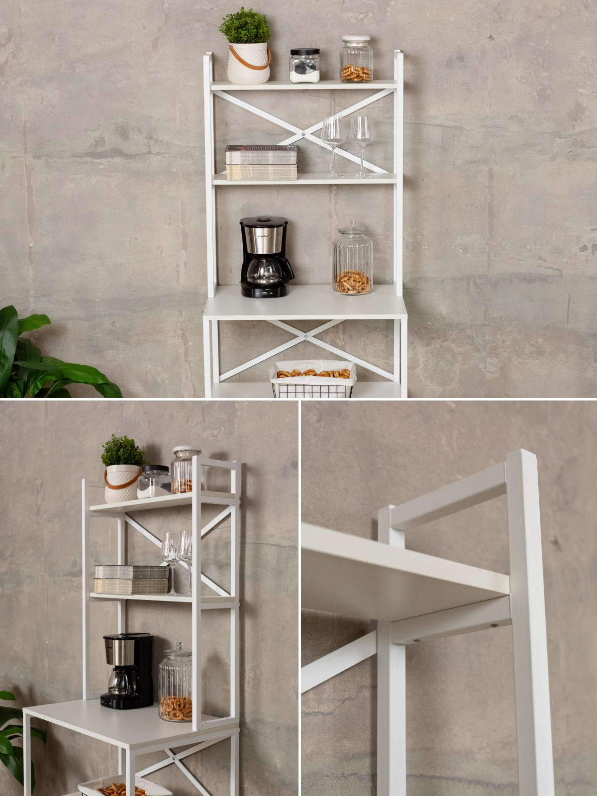 Открытая конструкция металлической этажерки с секциями и полочками позволяет использовать пространство максимально эффективно. Универсальный дизайн подойдет для хранения посуды, аксессуаров для чая и кофе, кофемашины, микроволновки, духовки, инструментов, офисных принадлежностей, а также для организации хранения в кладовке. Металлические детали обеспечивают надежность и долговечность, а белый цвет визуально расширяет помещение, создавая ощущение чистоты и свежести. Такой стеллаж станет отличным выбором для кухни, гостиной, спальни, кофейной или чайной зоны в офисе, а также для размещения комнатных растений, цветов или аксессуаров.