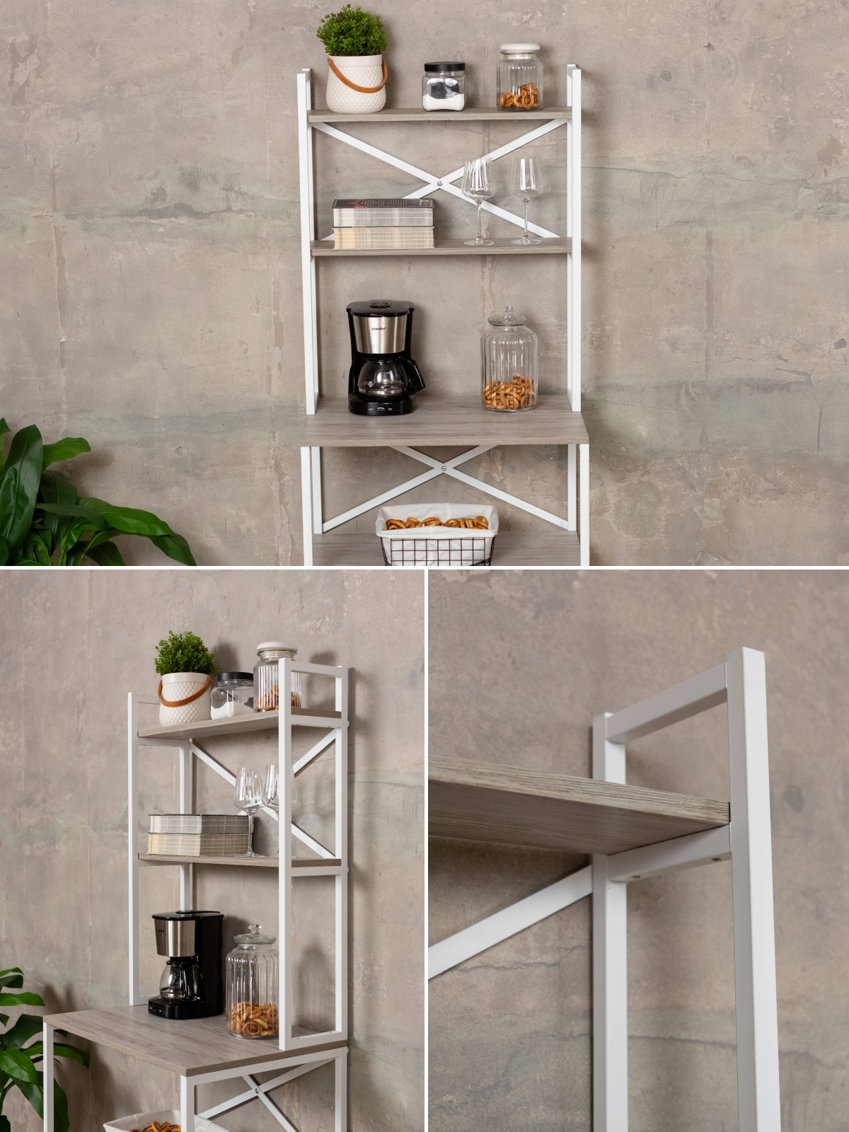 Открытая конструкция металлической этажерки с секциями и полочками позволяет использовать пространство максимально эффективно. Универсальный дизайн подойдет для хранения посуды, аксессуаров для чая и кофе, кофемашины, микроволновки, духовки, инструментов, офисных принадлежностей, а также для организации хранения в кладовке. Металлические детали обеспечивают надежность и долговечность, а белый цвет визуально расширяет помещение, создавая ощущение чистоты и свежести. Такой стеллаж станет отличным выбором для кухни, гостиной, спальни, кофейной или чайной зоны в офисе, а также для размещения комнатных растений, цветов или аксессуаров.