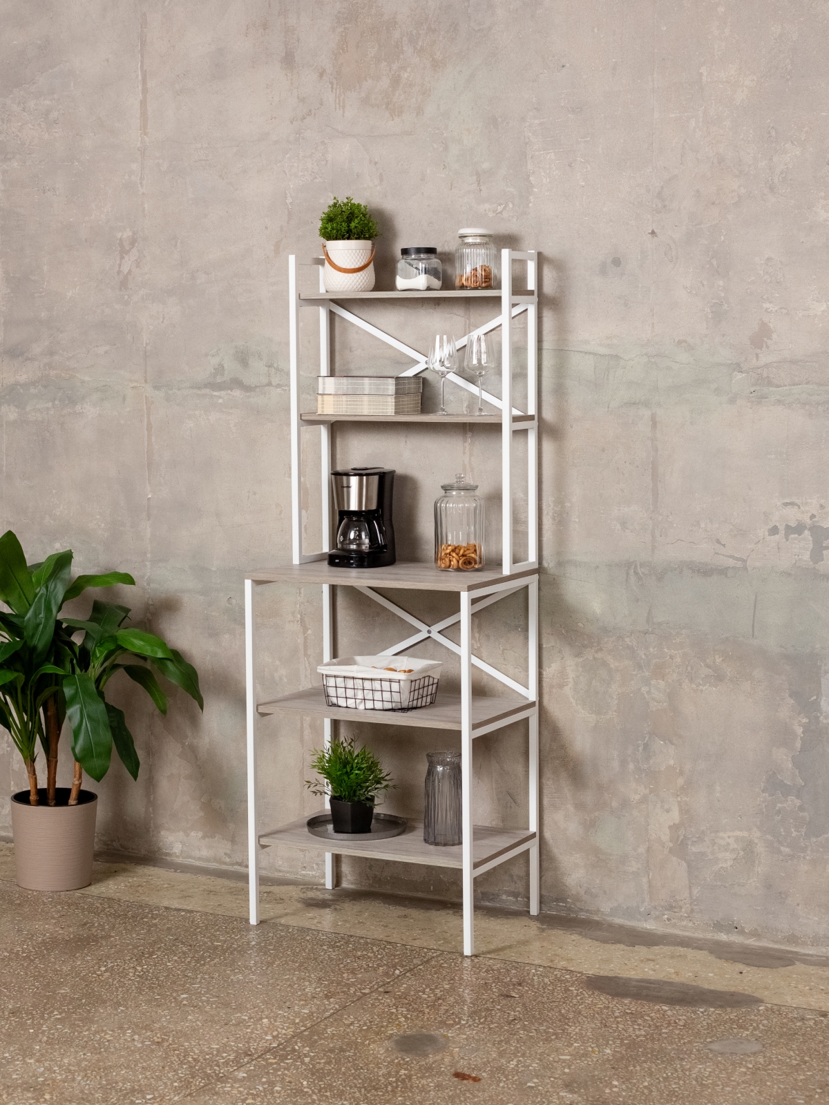Каркасный дизайн стеллажа с открытыми полками обеспечивает отличную вентиляцию и быстрый доступ к необходимым вещам. Это удобный вариант мебели для микроволновой печи, кофемашины, посуды, аксессуаров для кофе и чая, а также для организации кухонного пространства или гостиной. Металлические полочки выдерживают вес мелкой бытовой техники и других предметов, а открытая конструкция создает ощущение порядка и уюта. Такая мебель станет акцентом в минималистичном интерьере, подчеркнет стиль лофт или сканди, а также идеально впишется в светлые квартиры и офисы.