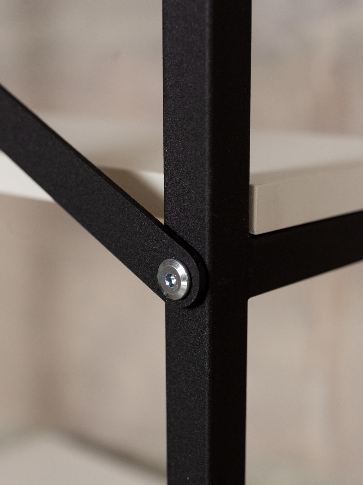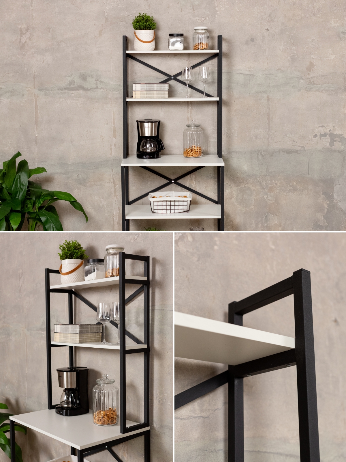 Полки на металлическом каркасе — практичный выбор для хранения кухонной посуды, приборов, инструментов, бытовой техники, аксессуаров для чая или кофе, а также кашпо с цветам. Открытые полки обеспечивают удобство доступа и хорошую вентиляцию, что особенно важно для кухонных принадлежностей и бытовых устройств. Металлические детали прочны, устойчивы к внешним воздействиям, легко очищаются, а лдсп-поверхность полок добавляет комфорта в ежедневном использовании.