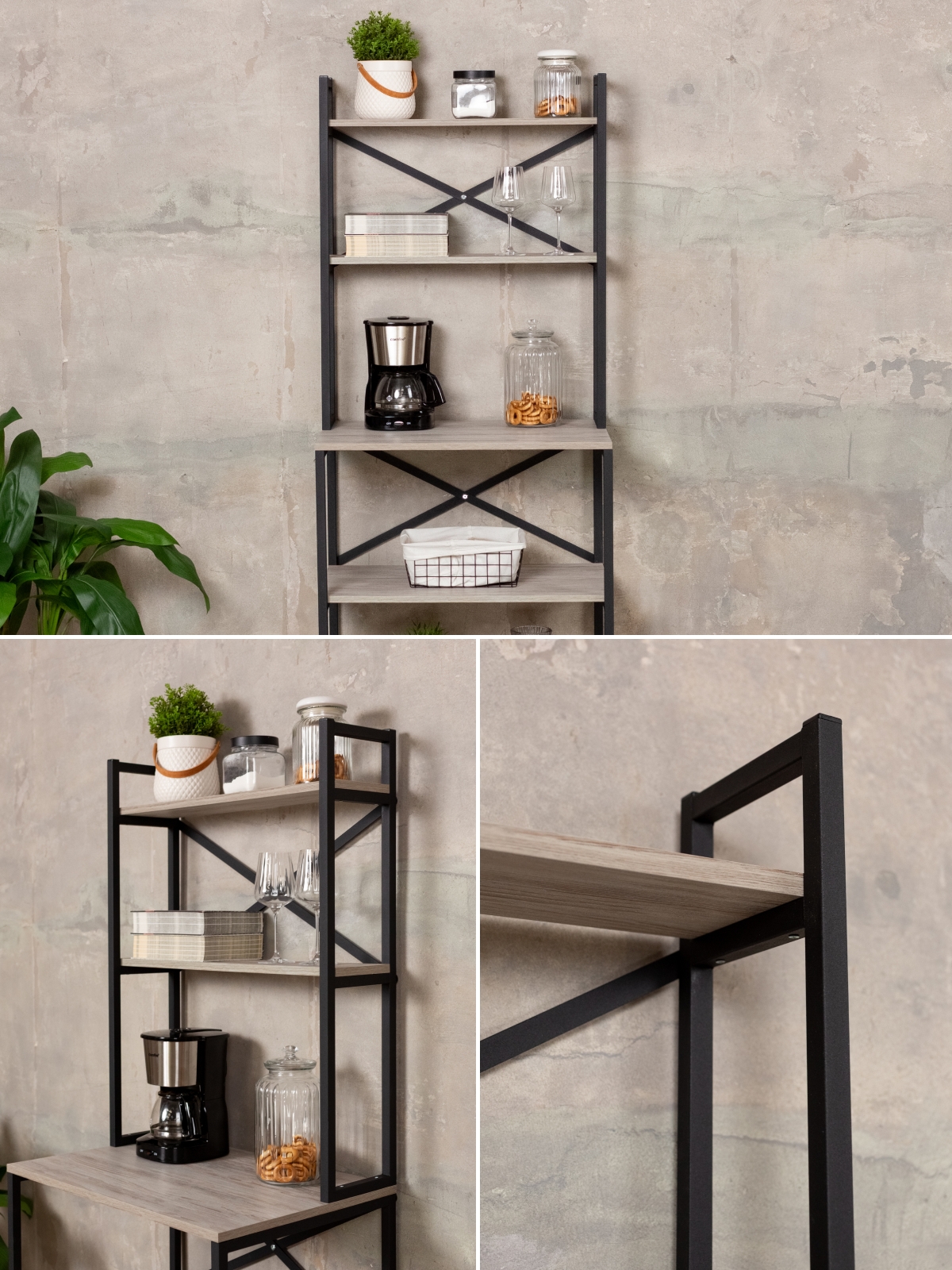 Полки на металлическом каркасе — практичный выбор для хранения кухонной посуды, приборов, инструментов, бытовой техники, аксессуаров для чая или кофе, а также кашпо с цветам. Открытые полки обеспечивают удобство доступа и хорошую вентиляцию, что особенно важно для кухонных принадлежностей и бытовых устройств. Металлические детали прочны, устойчивы к внешним воздействиям, легко очищаются, а лдсп-поверхность полок добавляет комфорта в ежедневном использовании.