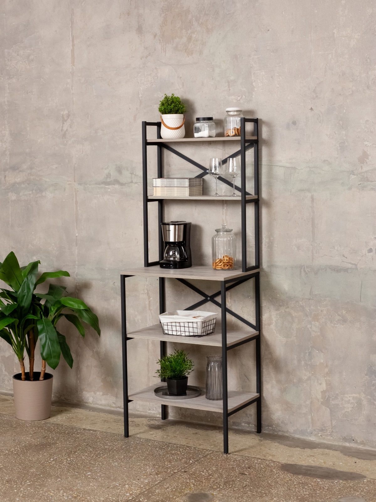 Текстура металла — матовый муар — приятна на ощупь и смотрится стильно в любых интерьерах. Стеллаж с полками и открытыми секциями отлично подходит для размещения микроволновой печи, кофемашины, посуды, инструментов, комнатных растений, книг и аксессуаров. Универсальный металлический каркасный вариант легко впишется как в кухонную, так и офисную обстановку, спальню или комнату для гостей.