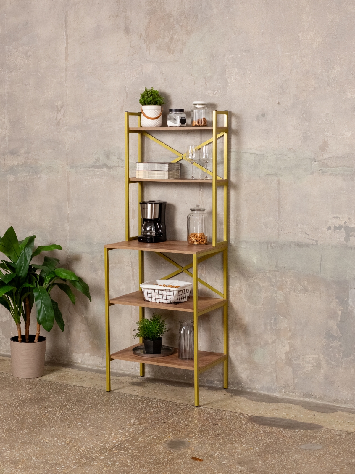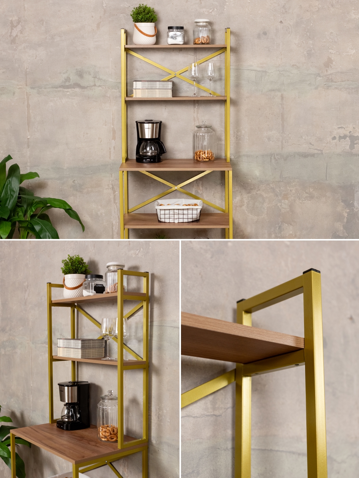 Вместительный стеллаж с каркасом из металла — это современное решение для кухни, гостиной, спальни, офиса и кофейной зоны. Такая мебель гармонично впишется в интерьер благодаря универсальному стилю лофт с акцентом на изысканность. Золотой цвет металлического каркаса не только добавляет интерьеру блеск, но и подчеркивает индивидуальность владельца. Напольный стеллаж подходит для хранения посуды, инструментов, кофейных аксессуаров, чая, кофемашины, микроволновой печи, духовой печи, свч, а также для размещения комнатных растений, декора и различных предметов быта.