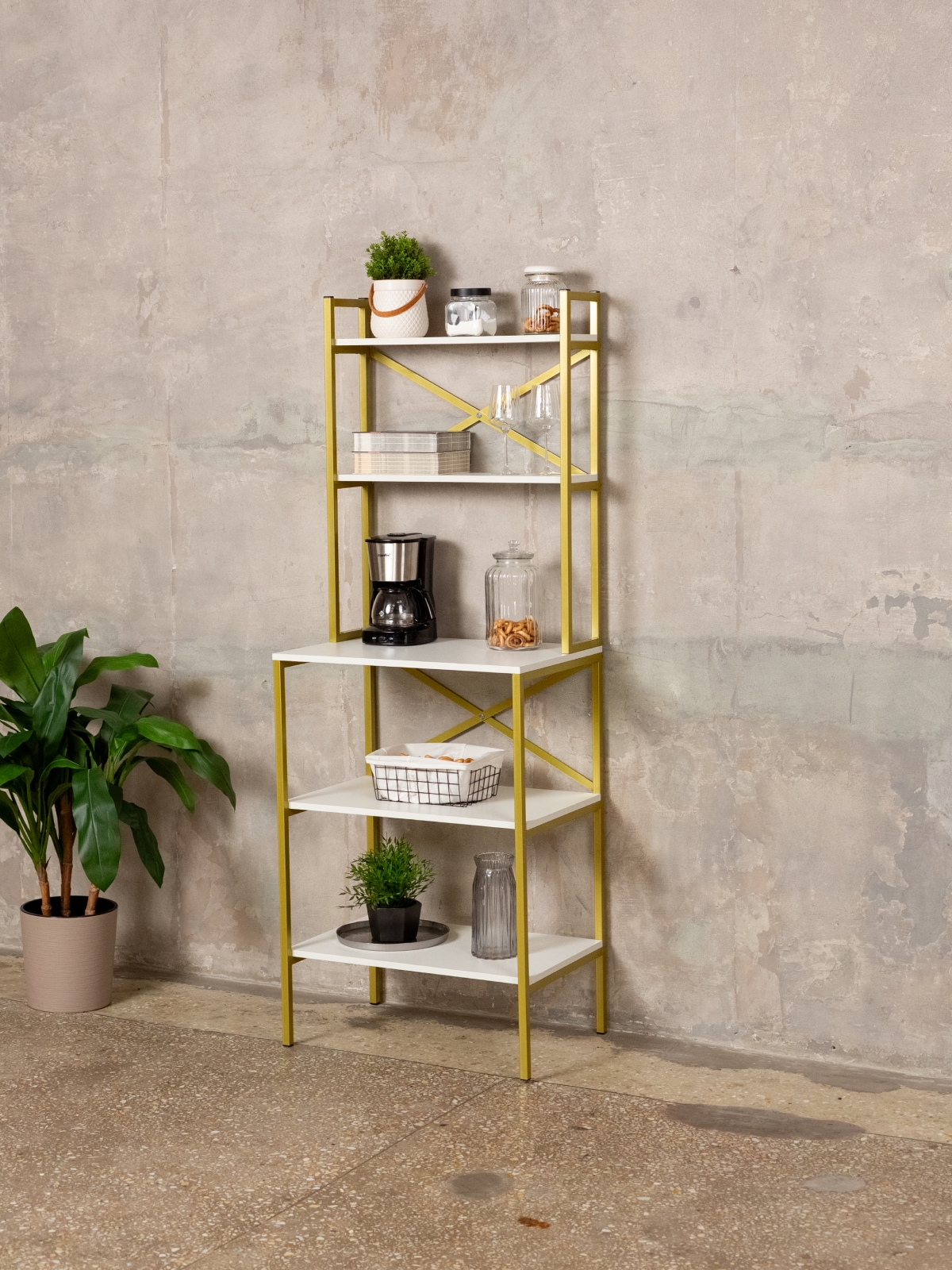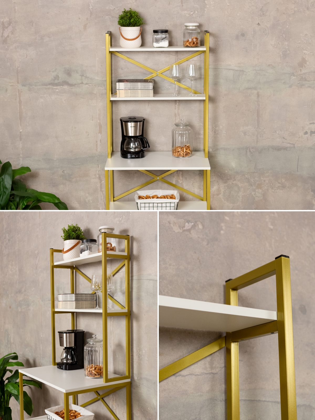 Вместительный стеллаж с каркасом из металла — это современное решение для кухни, гостиной, спальни, офиса и кофейной зоны. Такая мебель гармонично впишется в интерьер благодаря универсальному стилю лофт с акцентом на изысканность. Золотой цвет металлического каркаса не только добавляет интерьеру блеск, но и подчеркивает индивидуальность владельца. Напольный стеллаж подходит для хранения посуды, инструментов, кофейных аксессуаров, чая, кофемашины, микроволновой печи, духовой печи, свч, а также для размещения комнатных растений, декора и различных предметов быта.